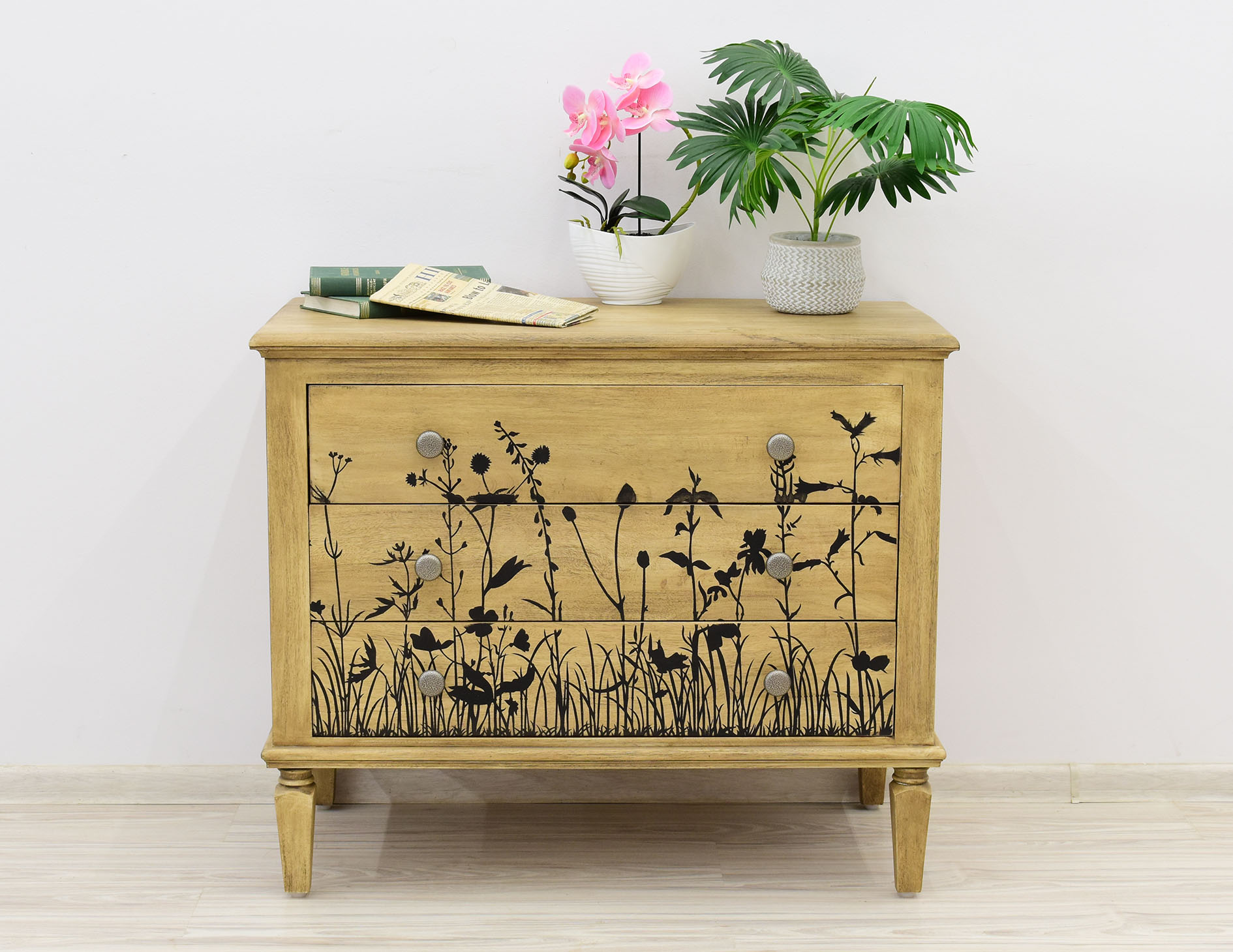 Admirra charakteryzuje się unikatowym wzorem roślinnym umiejscowionym na frontach każdego z dostępnych mebli. Meble z tej kolekcji posiadają również frezowane nogi oraz frezowane wieńce i cokoły, co nadaje urokliwy klasyczny styl dla całej kolekcji.