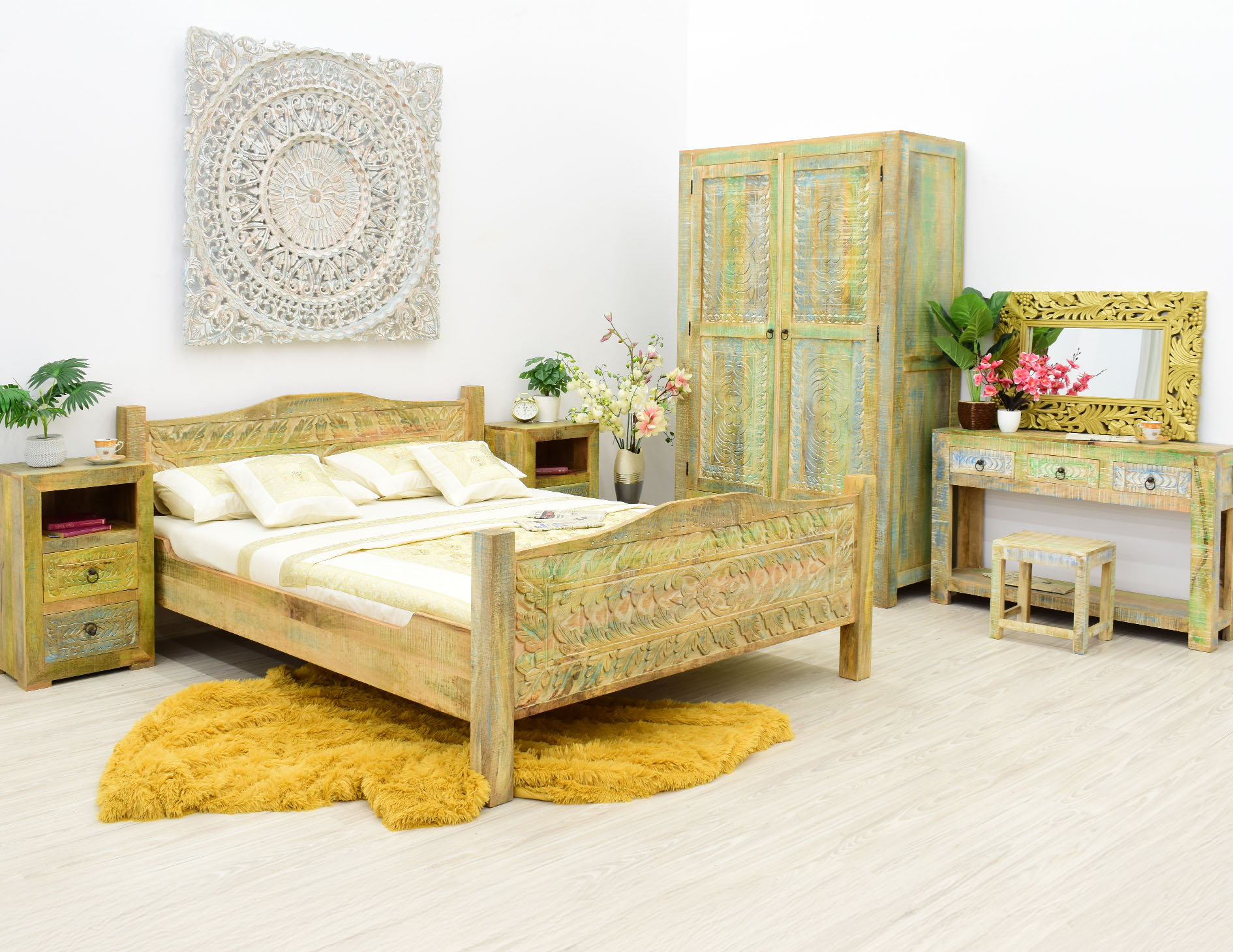 Komplet do sypialni Quatro: łóżko kolonialne indyjskie lite drewno mango 180/200 cm + 2 szafki nocne