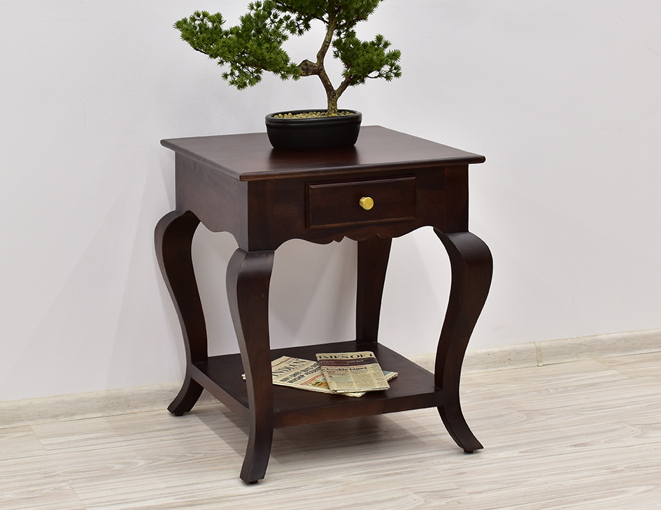 Stolik kolonialny z szufladą i półką lite drewno palisander indyjski w klasycznym stylu gięte nogi