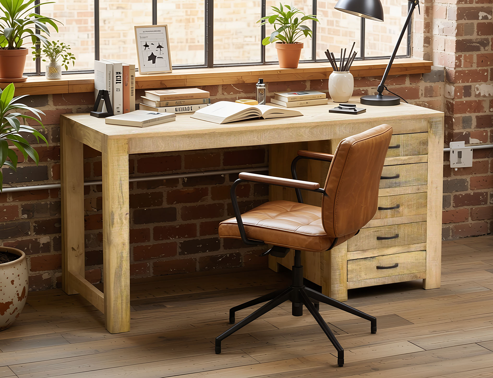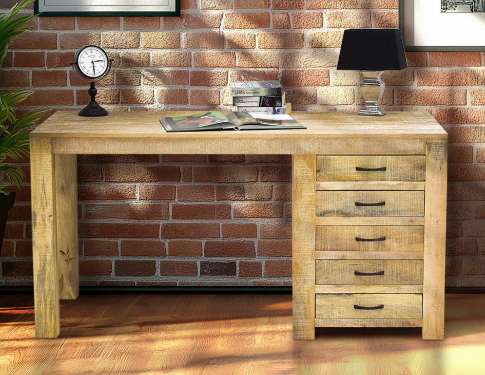 Biurko kolonialne wykonane w 100% z litego drewna mango, z pięcioma praktycznymi szufladami umiejscowionymi po prawej stronie. Całość wpisuje się w minimalistyczny, loftowy styl. Jasny kolor mebla podkreśla jego surową stylistykę.