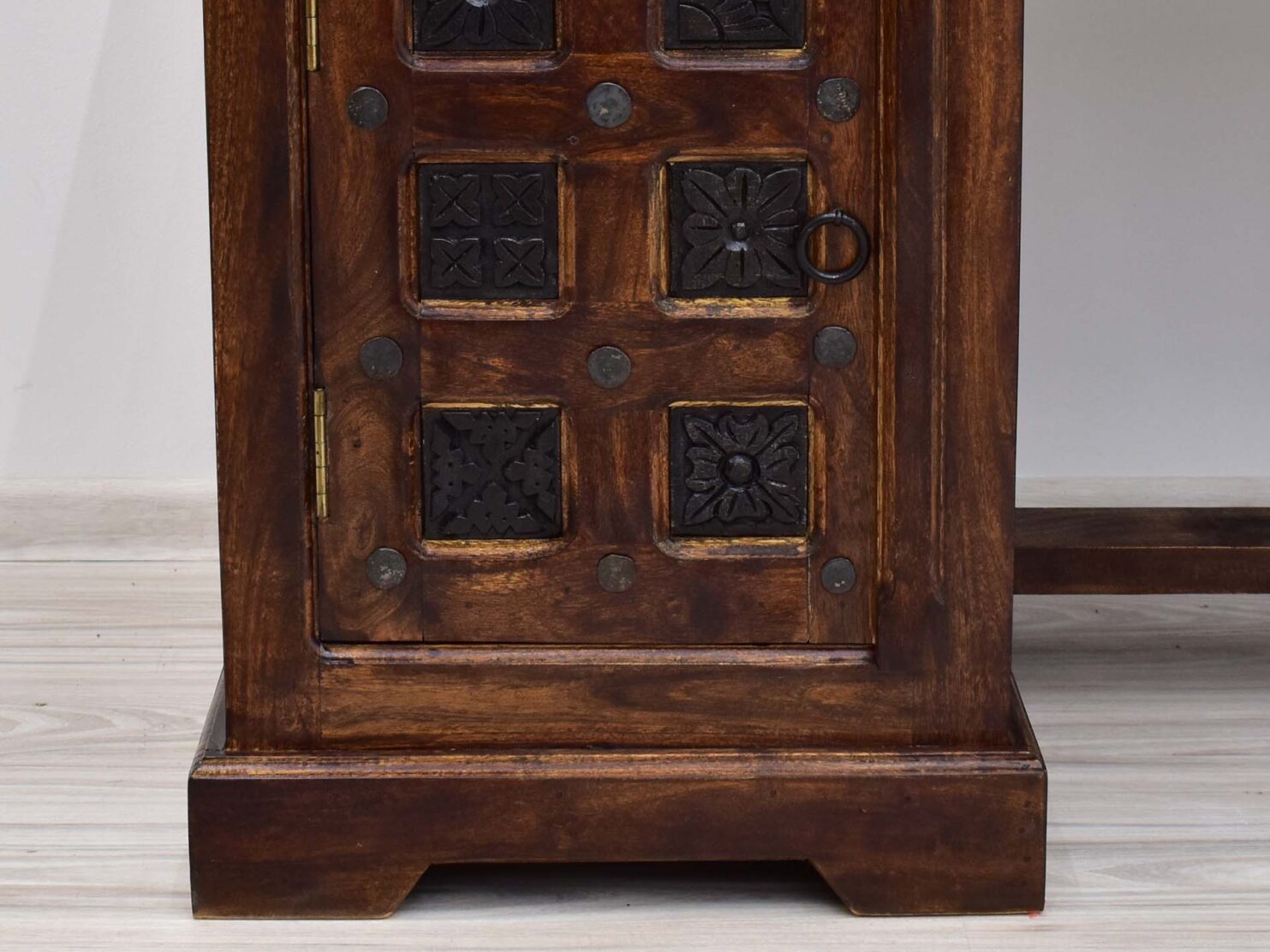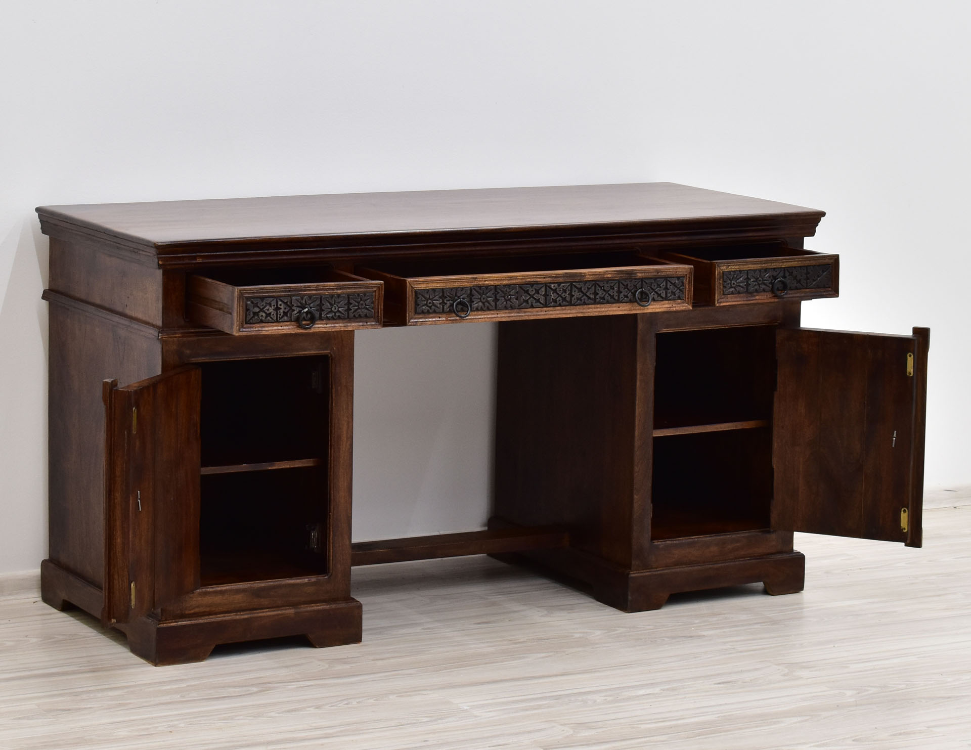 Biurko kolonialne wykonane w 100% z litego drewna akacji indyjskiej w kolorze ciemny brąz. Mebel posiada bardzo solidną konstrukcję, ciężką podstawę oraz poprzeczną listwę stabilizującą całość masywnej konstrukcji. Blat zakończony ozdobnym frezem. Biurko indyjskie posiada jedną szeroką i dwie wąskie szuflady umieszczone pod blatem oraz dwie pojemne wnęki symetrycznie ustawione po obu stronach. Fronty drzwiczek i szuflad przyozdobione ręcznie rzeźbionymi motywami, dodatkowo wyposażone w delikatne metalowe uchwyty. Doskonała, klasyczna ozdoba każdego biura czy gabinetu, z nutą indyjskiego akcentu.