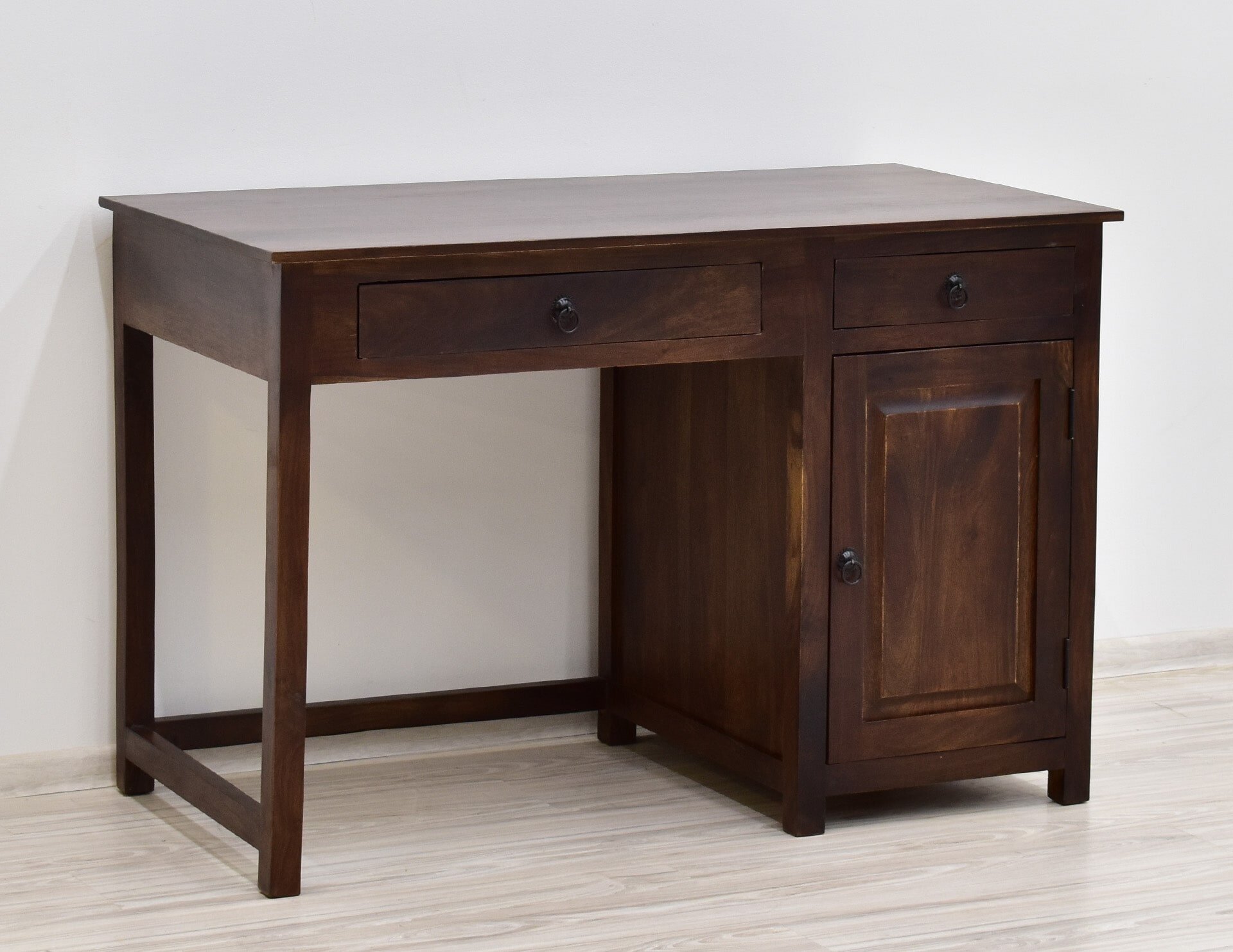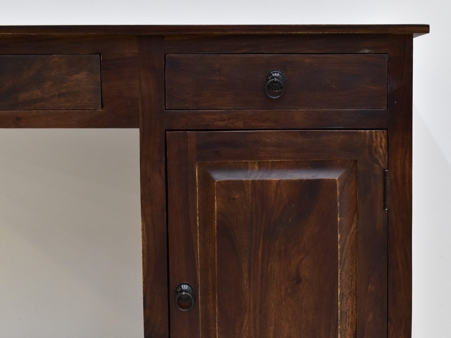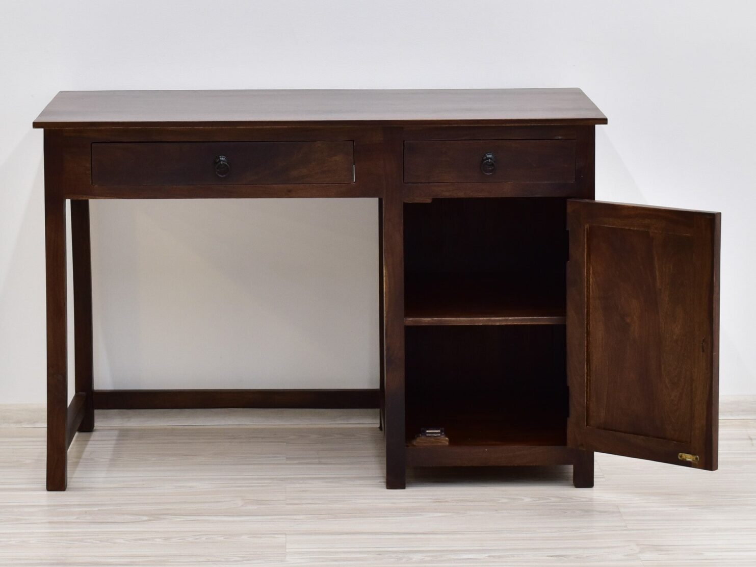 Klasyczne biurko kolonialne wybarwione na ciepły odcień ciemnego brązu zostało wykonane w 100% z litego drewna palisandru indyjskiego. Bardzo funkcjonalny mebel z długą i krótszą szufladą bod blatem oraz wnęką za drzwiczkami, po prawej stronie biurka. Fronty szuflad i drzwiczki są bez żadnych zdobień, uchwyty bardzo delikatne, w postaci małych metalowych kółeczek. Palisandrowe biurko kolonialne ma bardzo klasyczny wygląd.