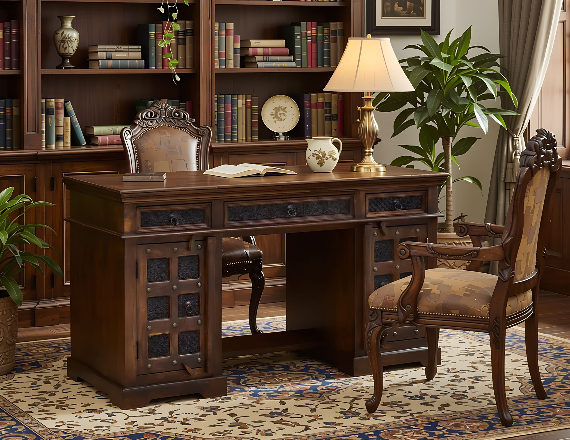 Biurko kolonialne wykonane w 100% z litego drewna palisandru indyjskiego. Mebel posiada 3 szuflady oraz wnęki umiejscowione za drzwiczkami, umiejscowione po obu stronach biurka. Ręcznie rzeźbione fronty w postaci ornamentów dodają klasy i uroku a precyzyjne wykonanie w hinduskiej manufakturze gwarantuje wysoką jakość produktu przy zachowaniu jego egzotycznego charakteru.
