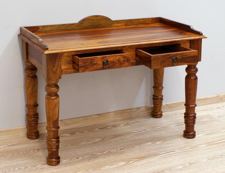 Egzotyczne biurko stworzone w 100% z litego drewna palisandru indyjskiego. Unikatowość mebla polega na tym, że eksponuje niepowtarzalne, piękne, oleiste słoje tego orientalnego drewna. Ten delikatny, wydawałoby się sekretarzyk stoi na masywnych, toczonych nogach, a na nim starannie wykonana skrzynia mieszcząca dwie szuflady oraz blat z wysuniętym w górę, z trzech stron, obrzeżem. Cały mebel wybarwiono w niestandardowym odcieniu miodowego brązu, a dodatki tworzą niepozorne, metalowe uchwyty.