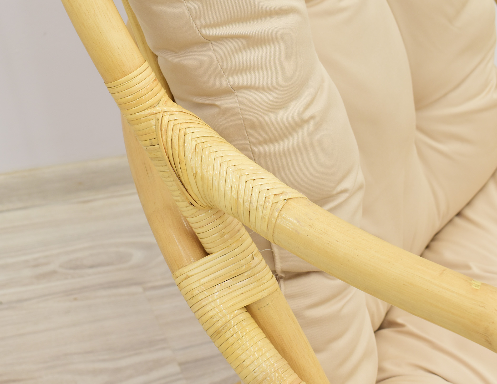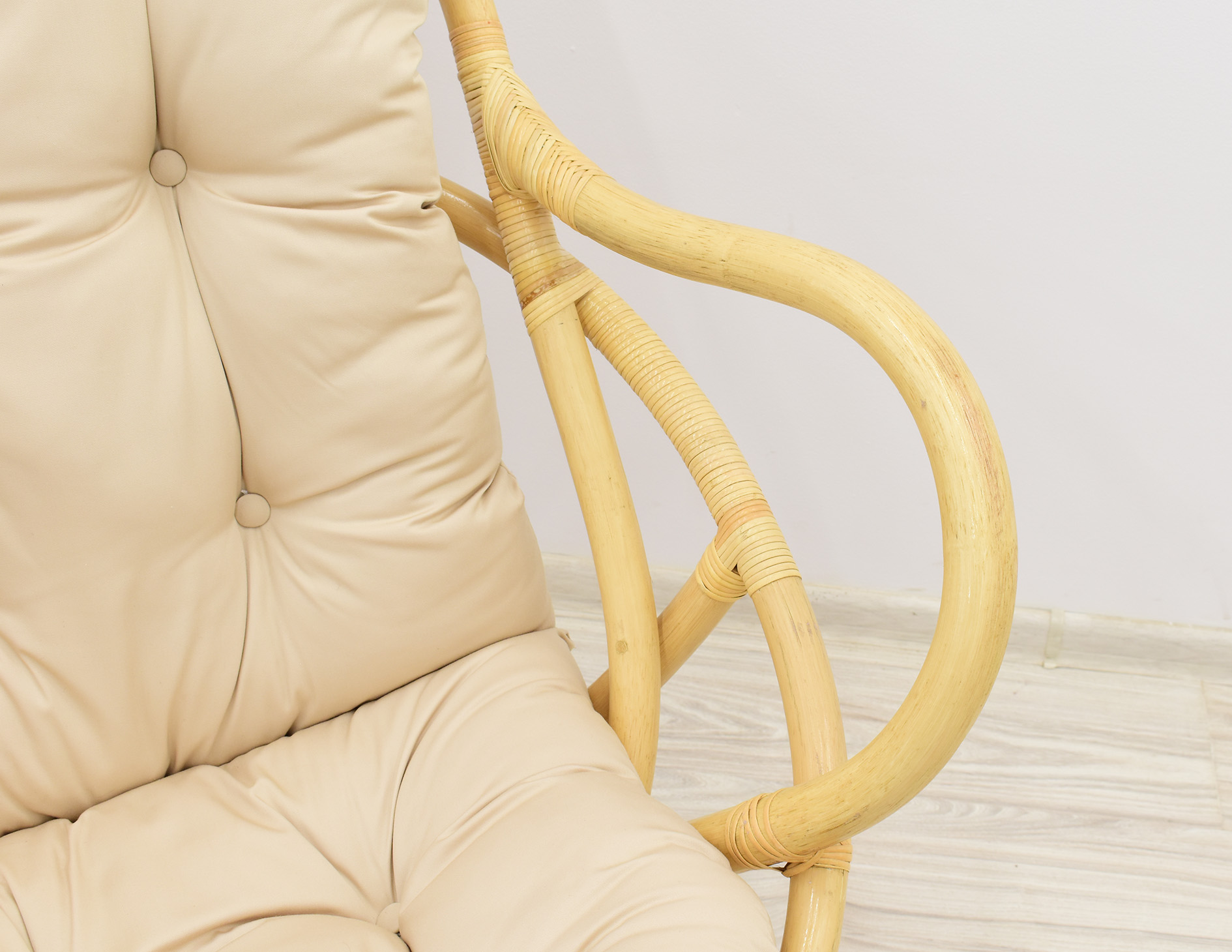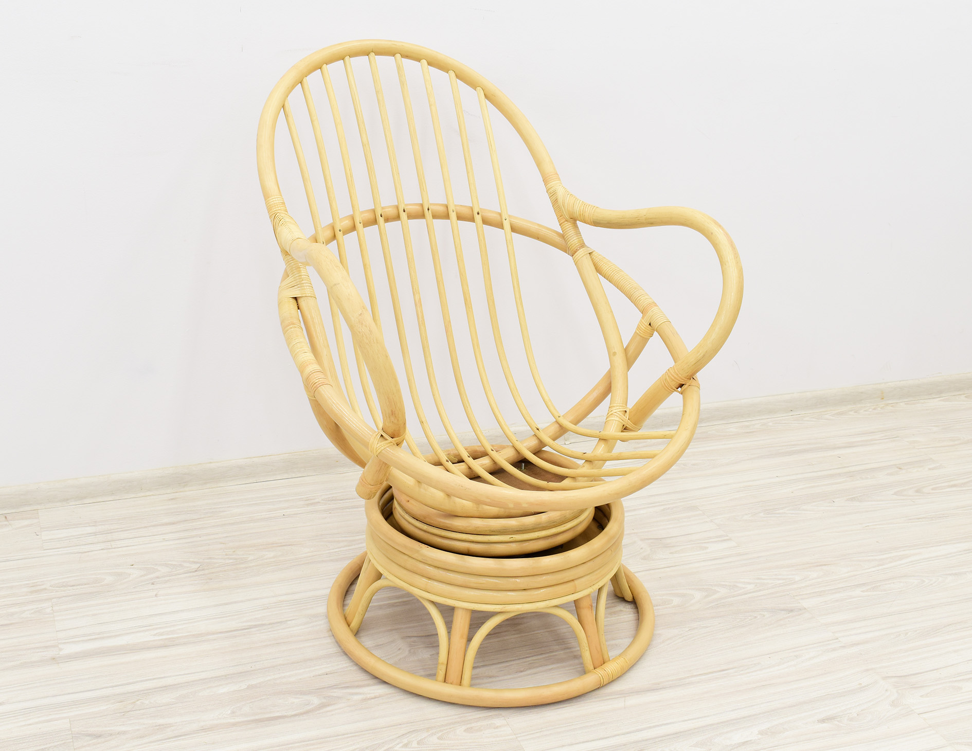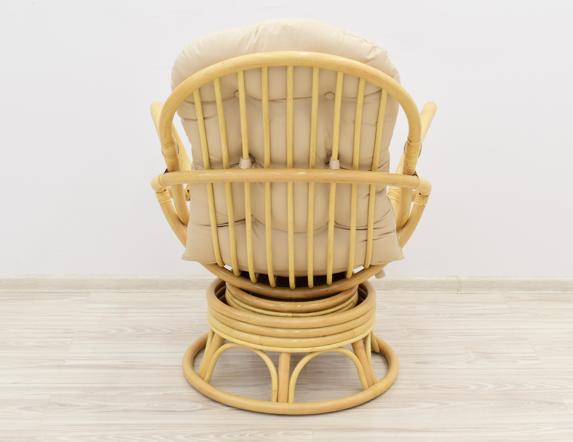 Fotel bujano-obrotowy w kolorze naturalnym ręcznie wykonany w 100% z rattanu z manufakturze w Indonezji. Mebel komfortowy w użytkowaniu, lakierowany, dostępny w kolorze naturalnym. Rattan stanowi bardzo wdzięczny materiał, którym można stworzyć nietuzinkowe formy dekoracyjne. Dzięki swym elastycznym właściwościom często jest wykorzystywany do wyrobu mebli takich jak fotele bujane. Oprócz tradycyjnych foteli nowość stanowią fotele bujano-obrotowe z rattanu w kolorze naturalnym.