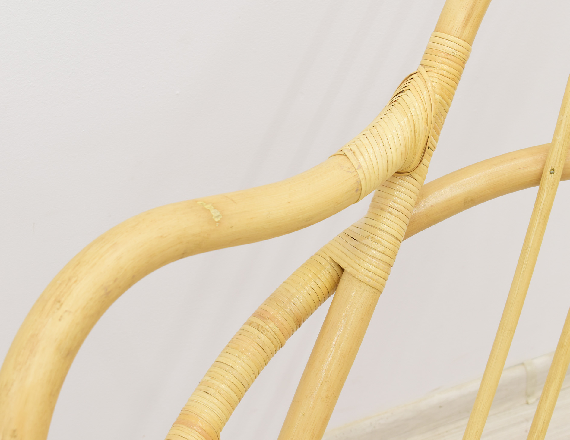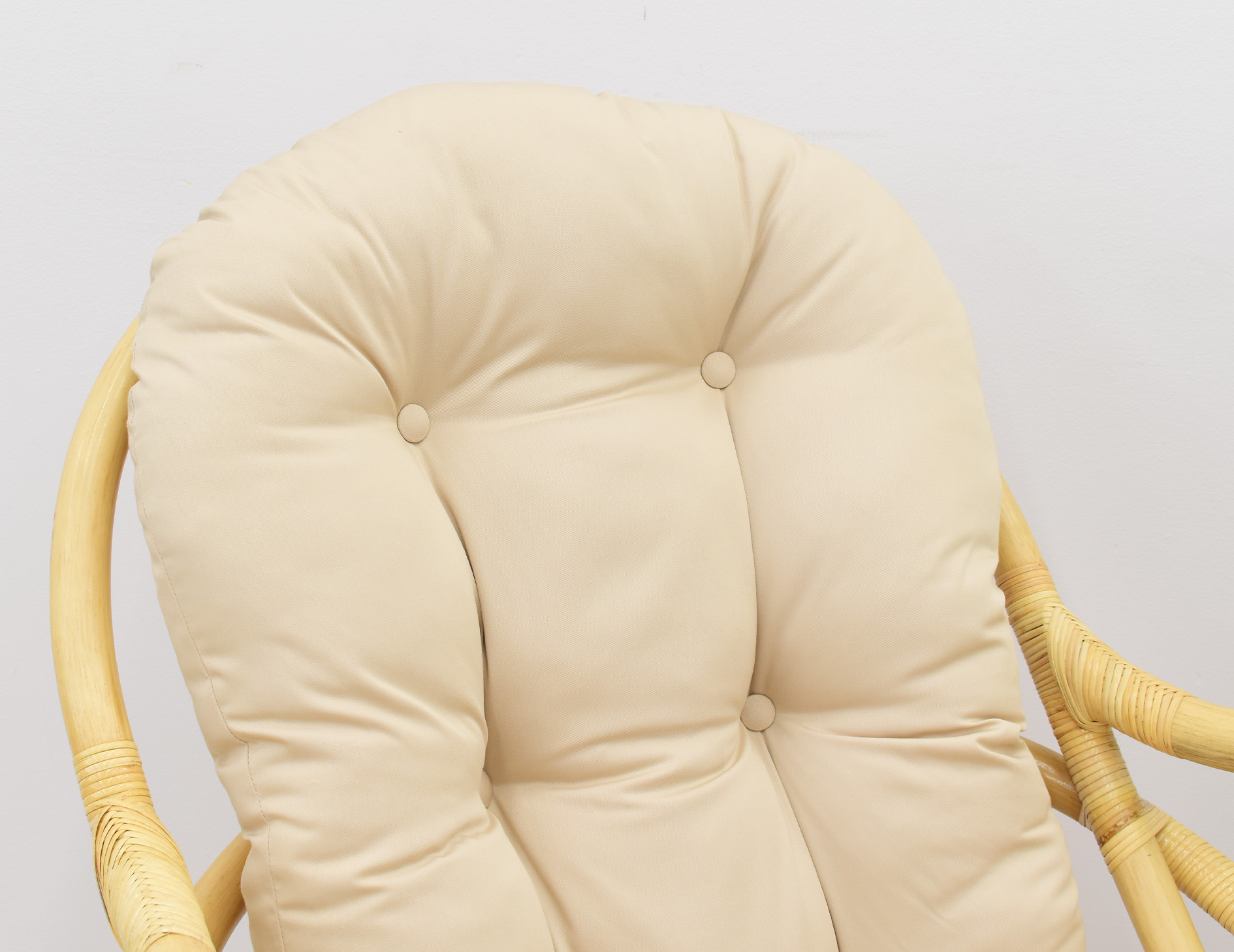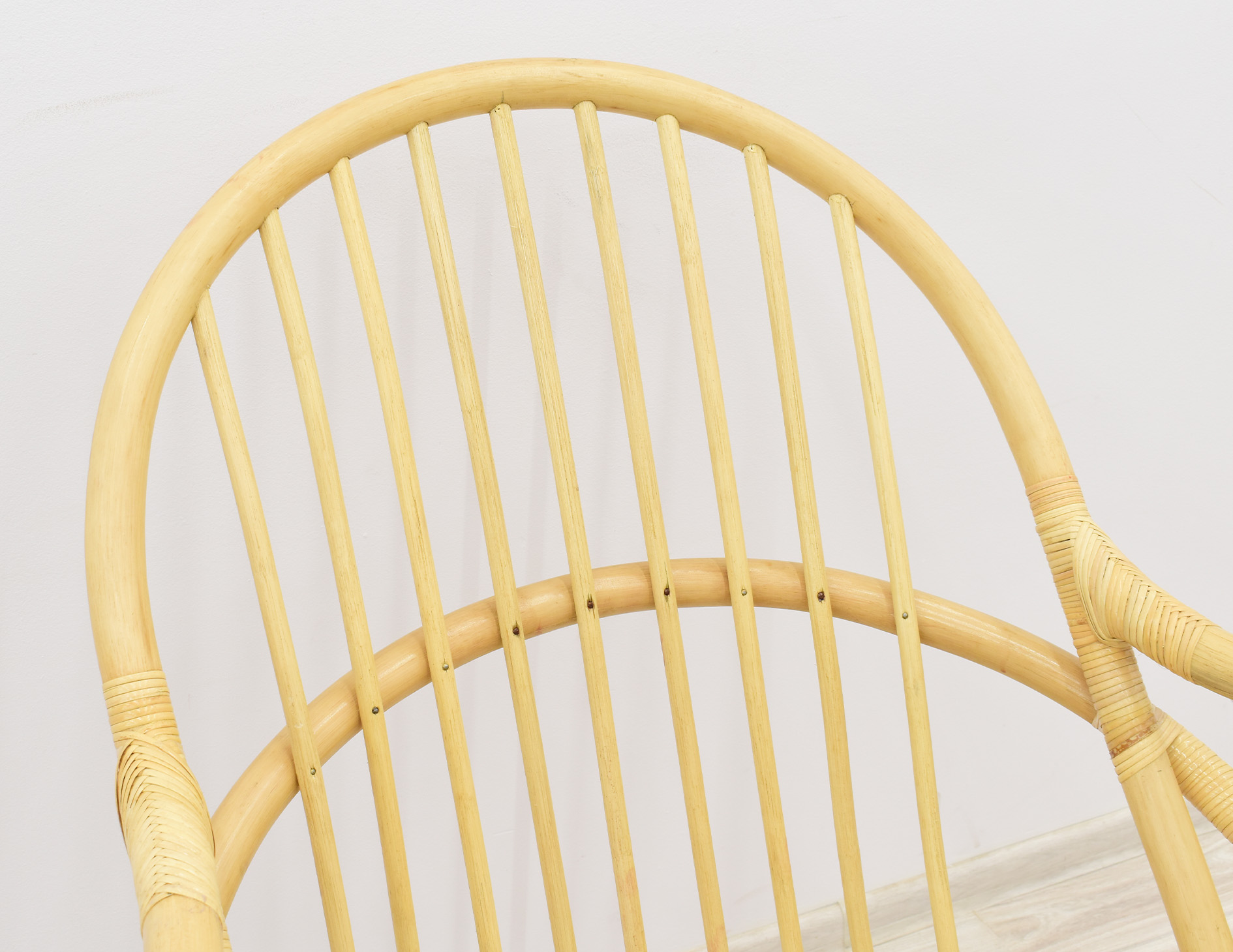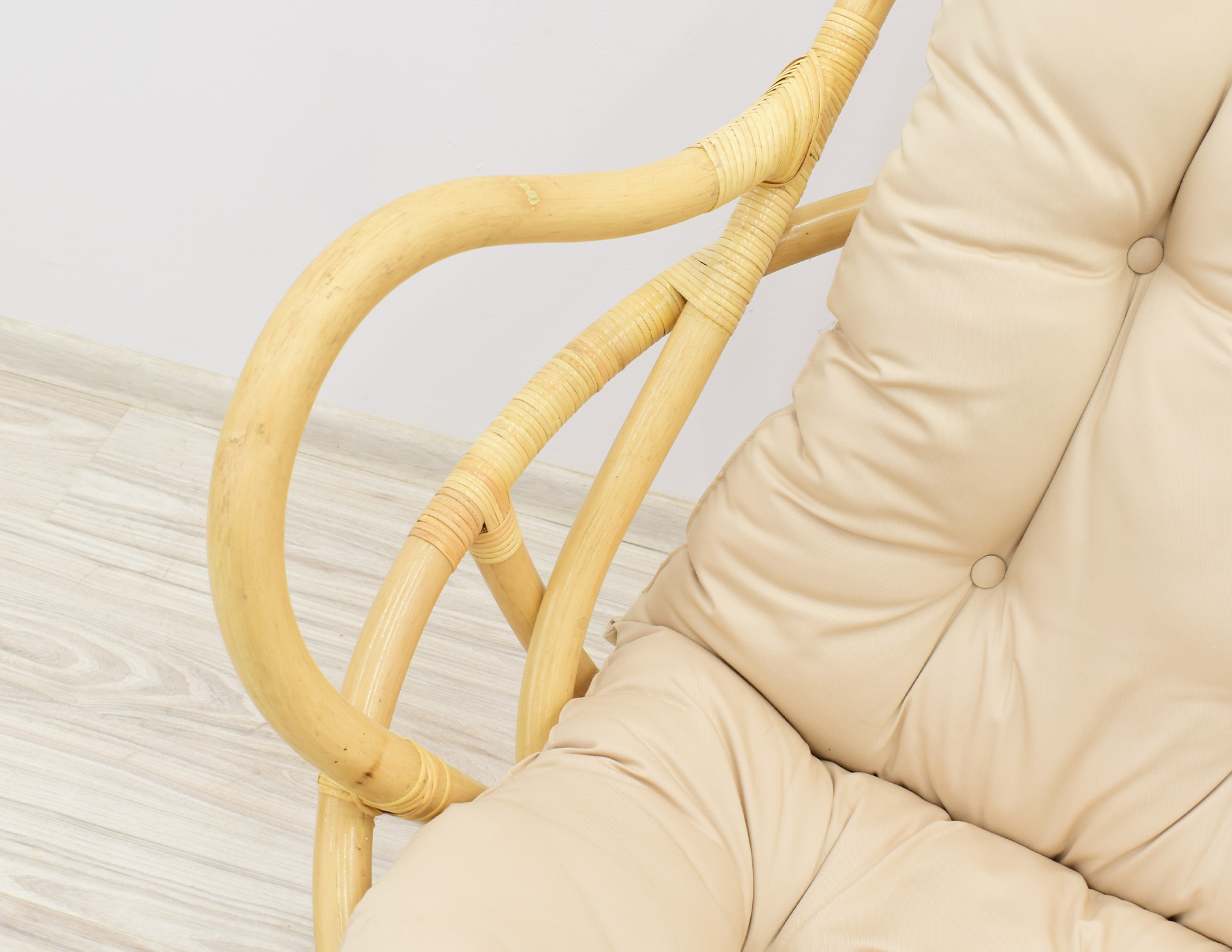 Fotel bujano-obrotowy w kolorze naturalnym ręcznie wykonany w 100% z rattanu z manufakturze w Indonezji. Mebel komfortowy w użytkowaniu, lakierowany, dostępny w kolorze naturalnym. Rattan stanowi bardzo wdzięczny materiał, którym można stworzyć nietuzinkowe formy dekoracyjne. Dzięki swym elastycznym właściwościom często jest wykorzystywany do wyrobu mebli takich jak fotele bujane. Oprócz tradycyjnych foteli nowość stanowią fotele bujano-obrotowe z rattanu w kolorze naturalnym.
