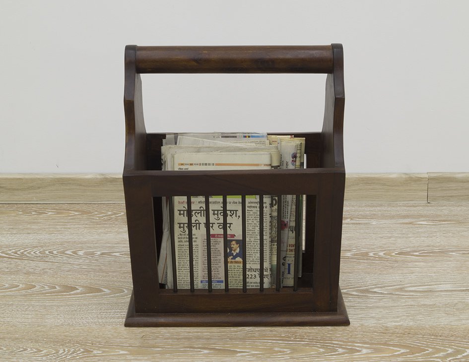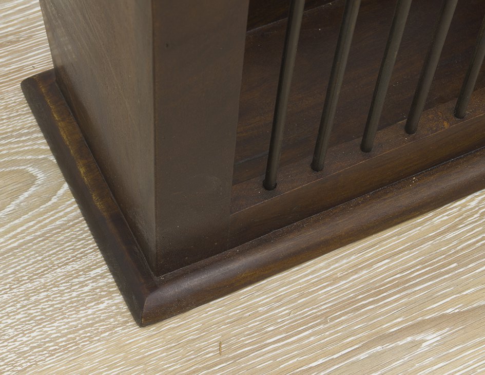 Klasyczny gazetnik z koszem na gazety oraz rączką do przenoszenia-powyżej. Przedmiot ten stworzony został w 100% z litego drewna palisandru indyjskiego. Aby podkreślić jego elegancki styl, został wybarwiony na bardzo ciemny odcień brązu.