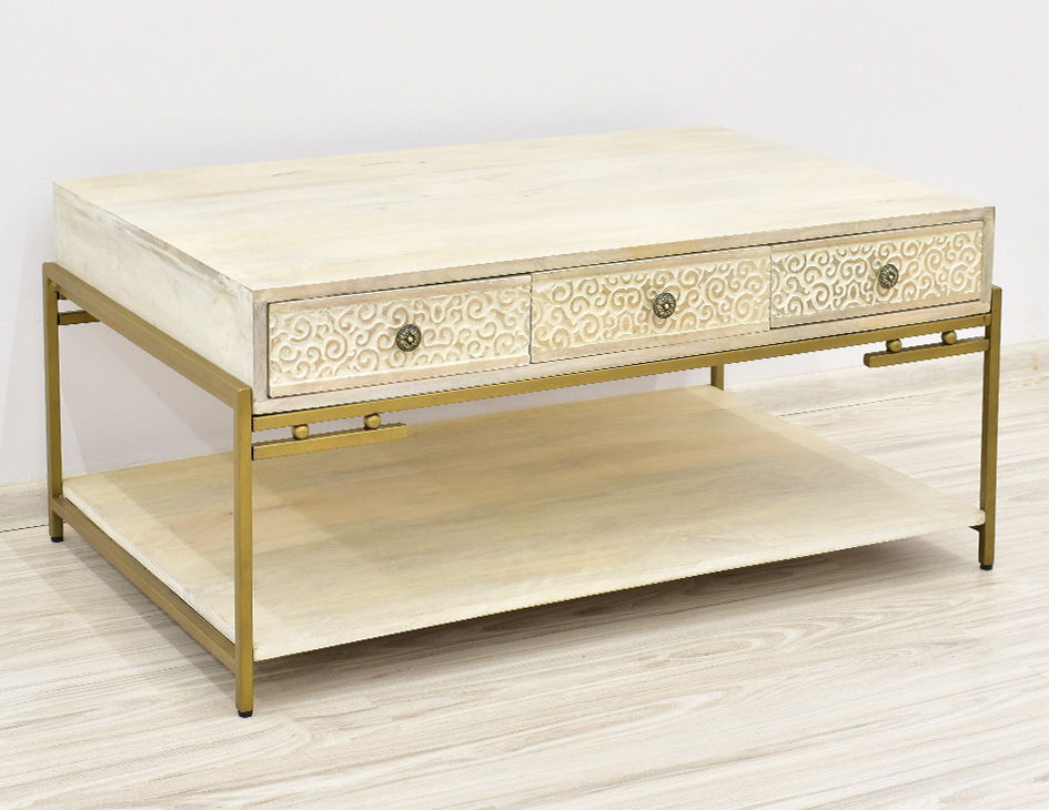 Kolonialny stolik kawowy wykonany w Indiach w 100% z litego drewna mango to wyjątkowy mebel, który łączy w sobie solidność i elegancję. Jego bryła została osadzona na zdobionych, metalowych nogach, które nadają mu unikalnego charakteru i stabilności. Mebel utrzymany jest w stylu kolonialnym, z wyraźnymi inspiracjami nurtu prowansalskiego, co sprawia, że doskonale komponuje się zarówno w klasycznych, jak i nowoczesnych wnętrzach.
