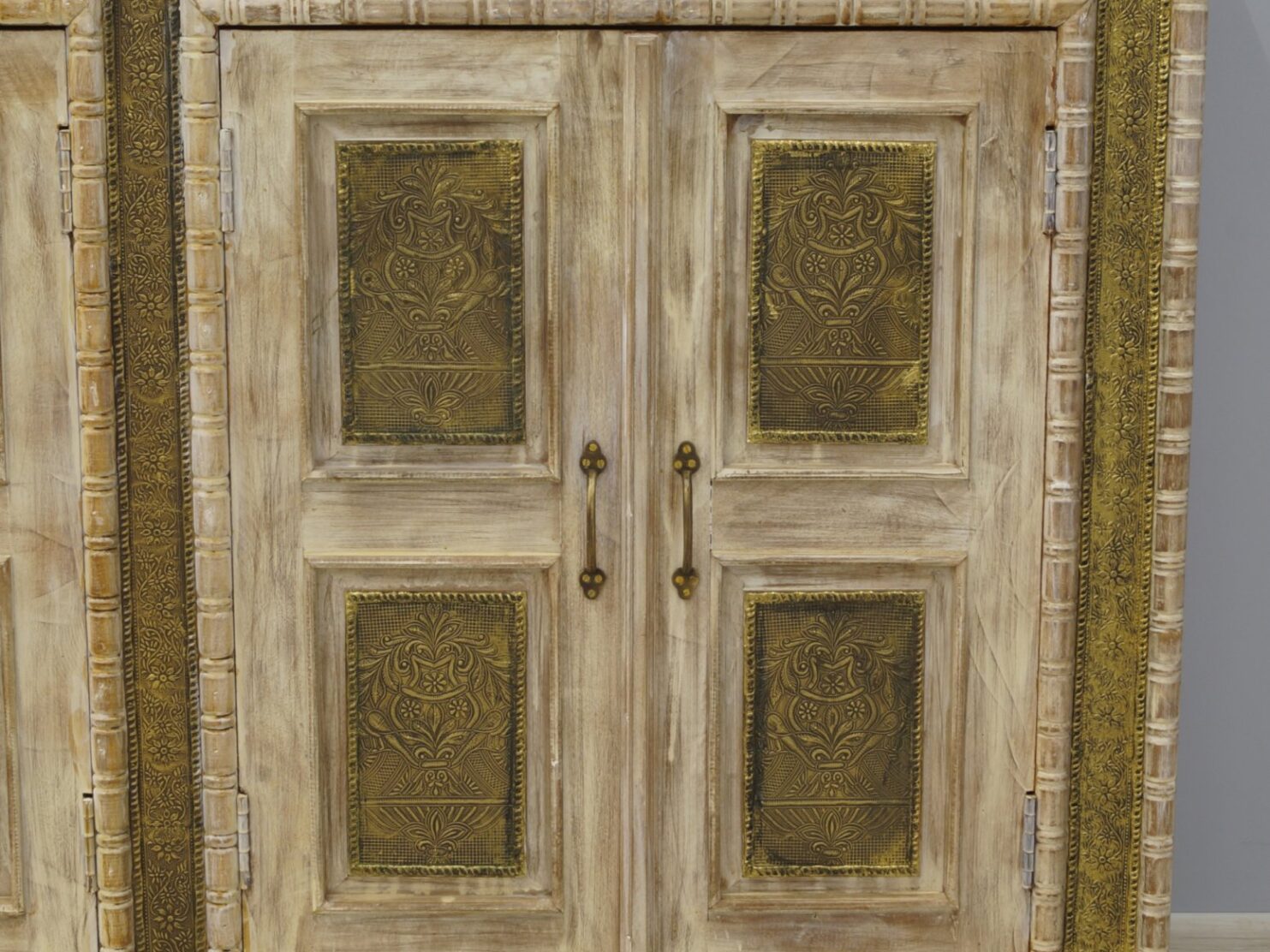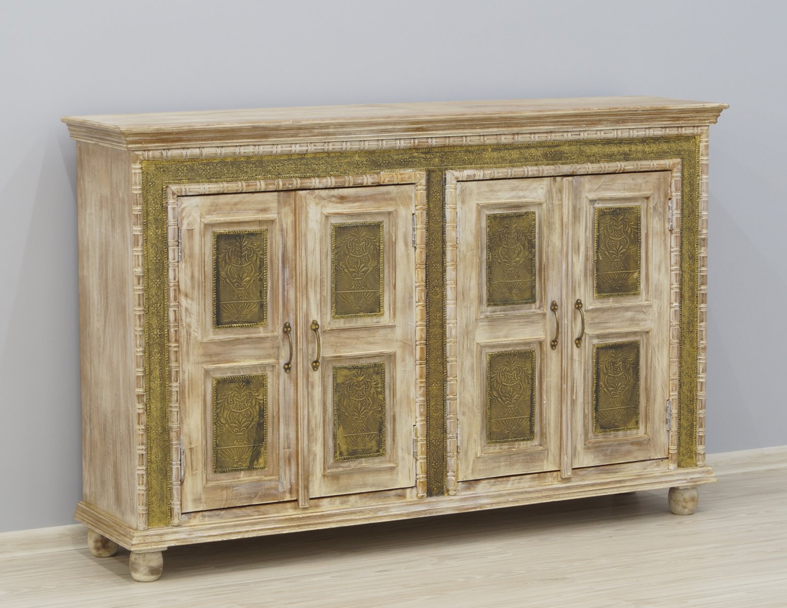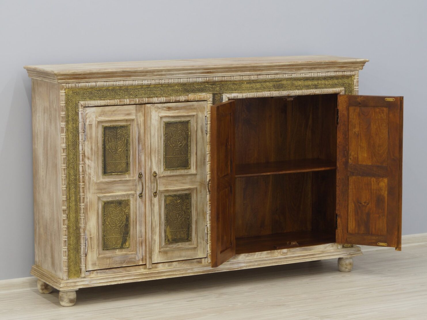 Pojemna komoda stworzona w 100% z litego drewna mango. Mebel bogato zdobiony, pomalowany na biały kolor, a następnie przetarty. Ponadto posiada zdobiony mosiądzem ornament w postaci listew okalających front mebla. Ten sam motyw pojawia się na frontach czterech drzwiczek, za którymi kryją się pojemne wnęki.
