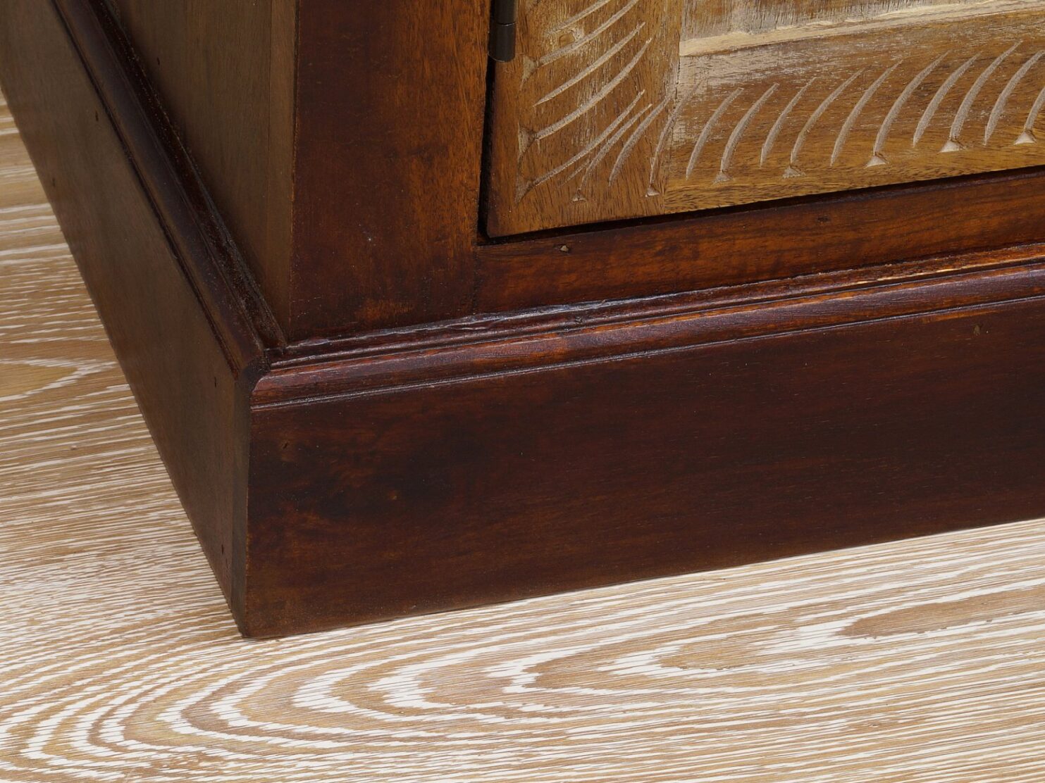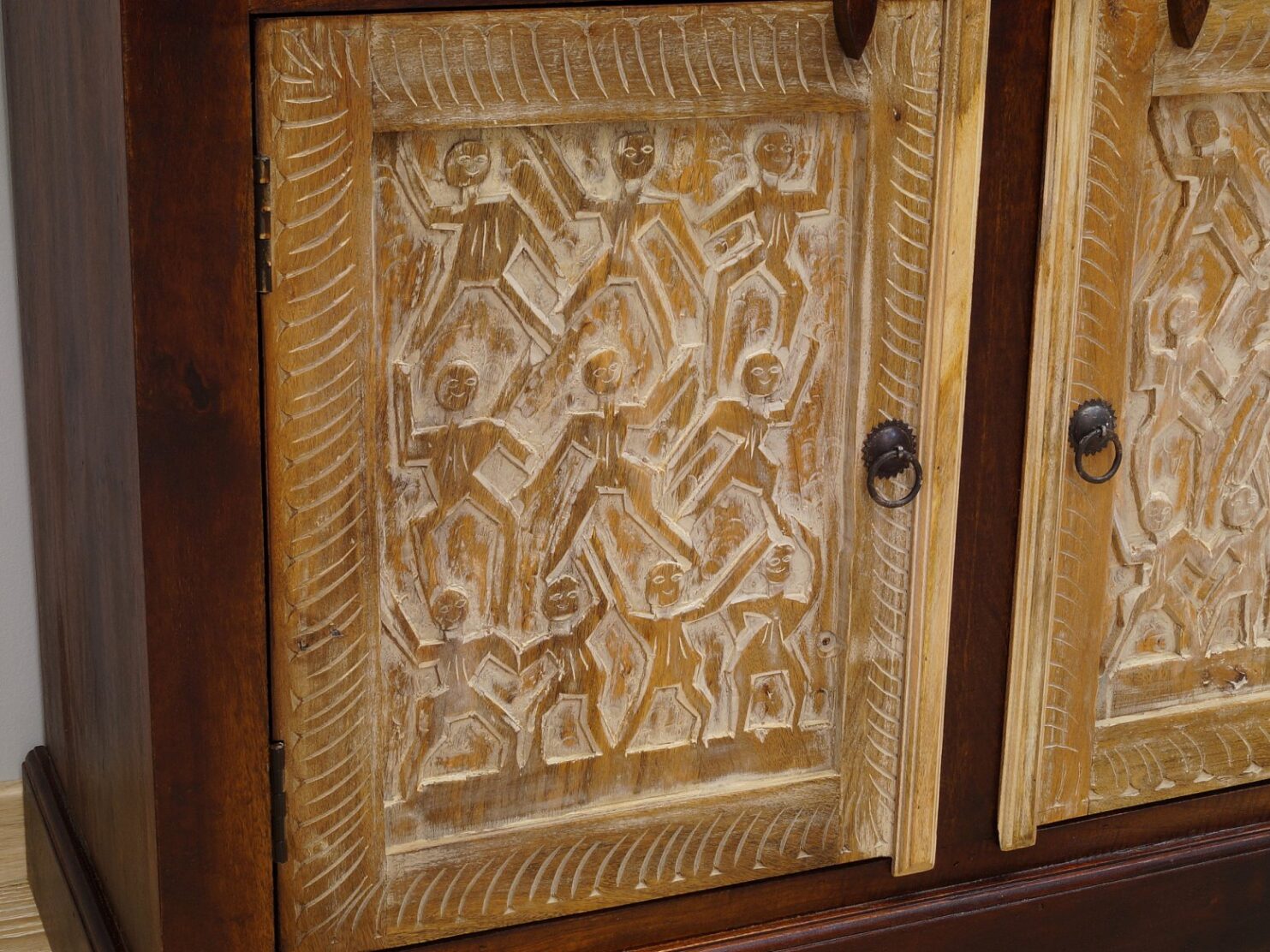 Komoda indyjska wytworzona z egzotycznego drewna mango, w 100% litego. Unikatowość mebla wynika z jego misternych, ręcznie rzeźbionych frontów wybarwionych na jasno. Korpus mebla wybarwiono na ciemny brąz. Posiada dwie szuflady, a także cztery pojemne wnęki ukryte za drzwiczkami. Fronty posiadają delikatne, metalowe uchwyty. Mebel stylizowany na antyczny.