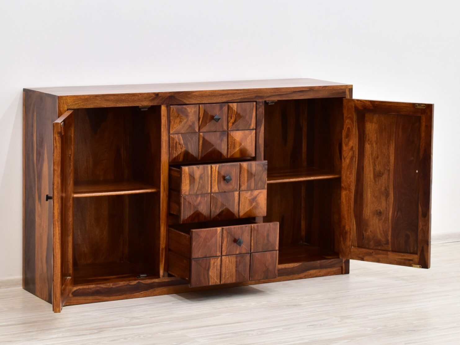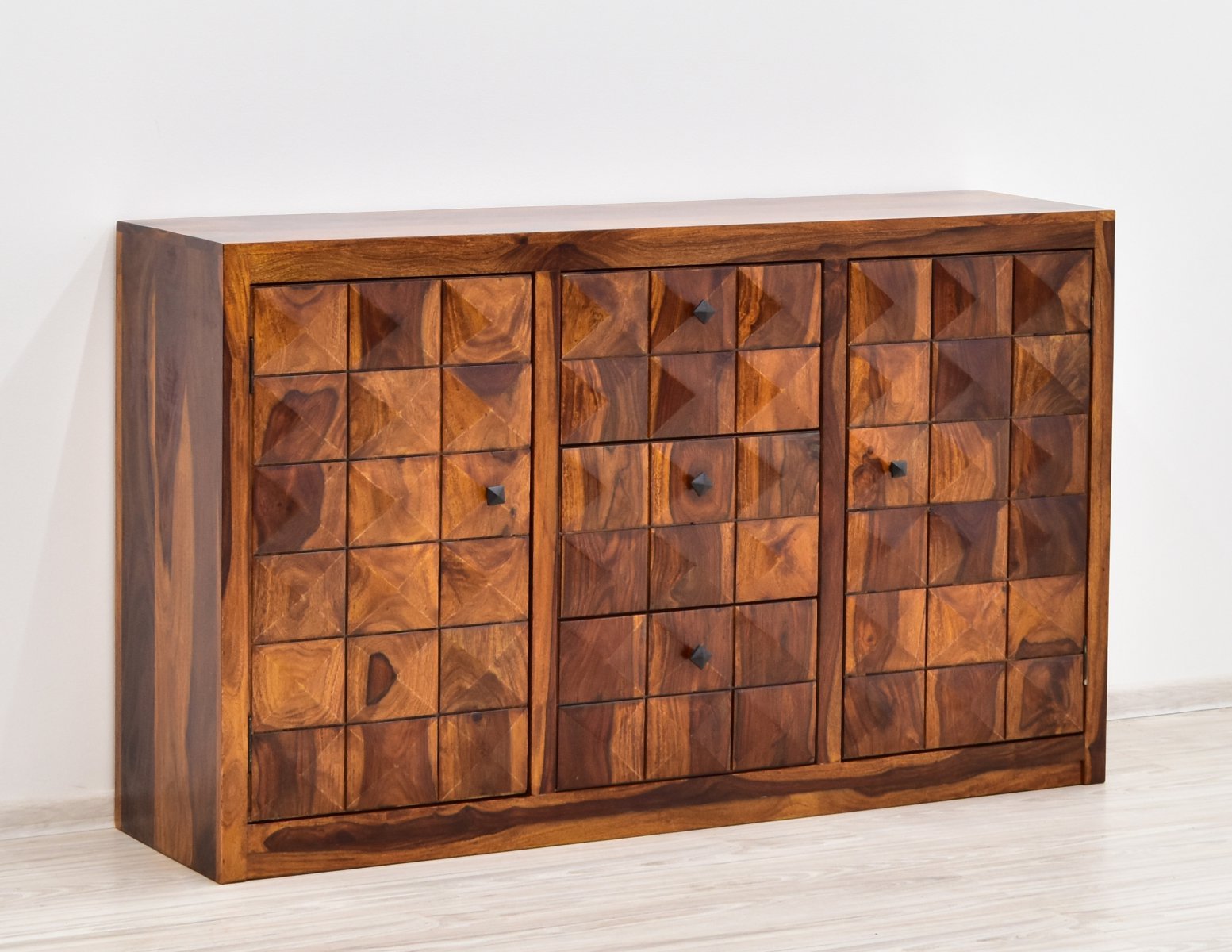 Komoda indyjska stworzona w indyjskiej manufakturze przez doświadczonych rzemieślników. Każdy egzemplarz jest unikatowy, gdyż jest wynikiem ręcznej pracy. Jest to mebel wytworzony w 100% z litego drewna palisandru indyjskiego, wybarwiony w ciepłym, miodowym odcieniu brązu. Niezwykle pojemna komoda o długości 150 cm, wyposażona w cztery wnęki, umieszczone za drzwiczkami oraz trzy głębokie szuflady. Wszystkie płaszczyzny eksponują niezwykłość struktury tego egzotycznego drewna. Każdy front ręcznie zdobiony motywem przypominającym oszlifowany diament. Cały przód mebla tworzy niezwykłą, trójwymiarową powierzchnię.