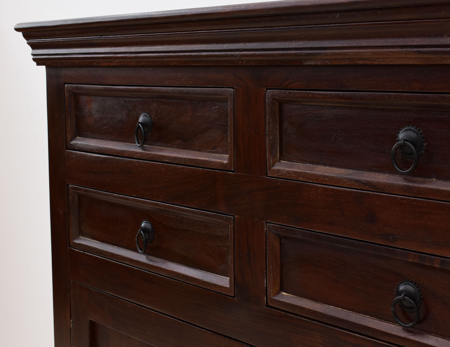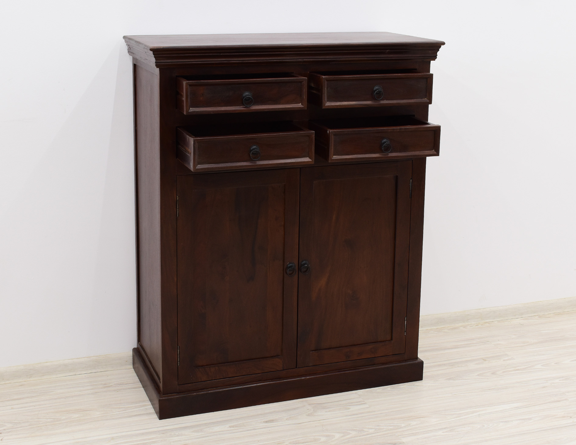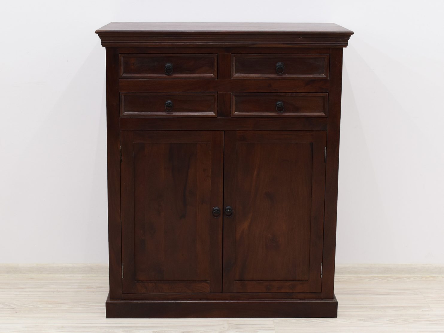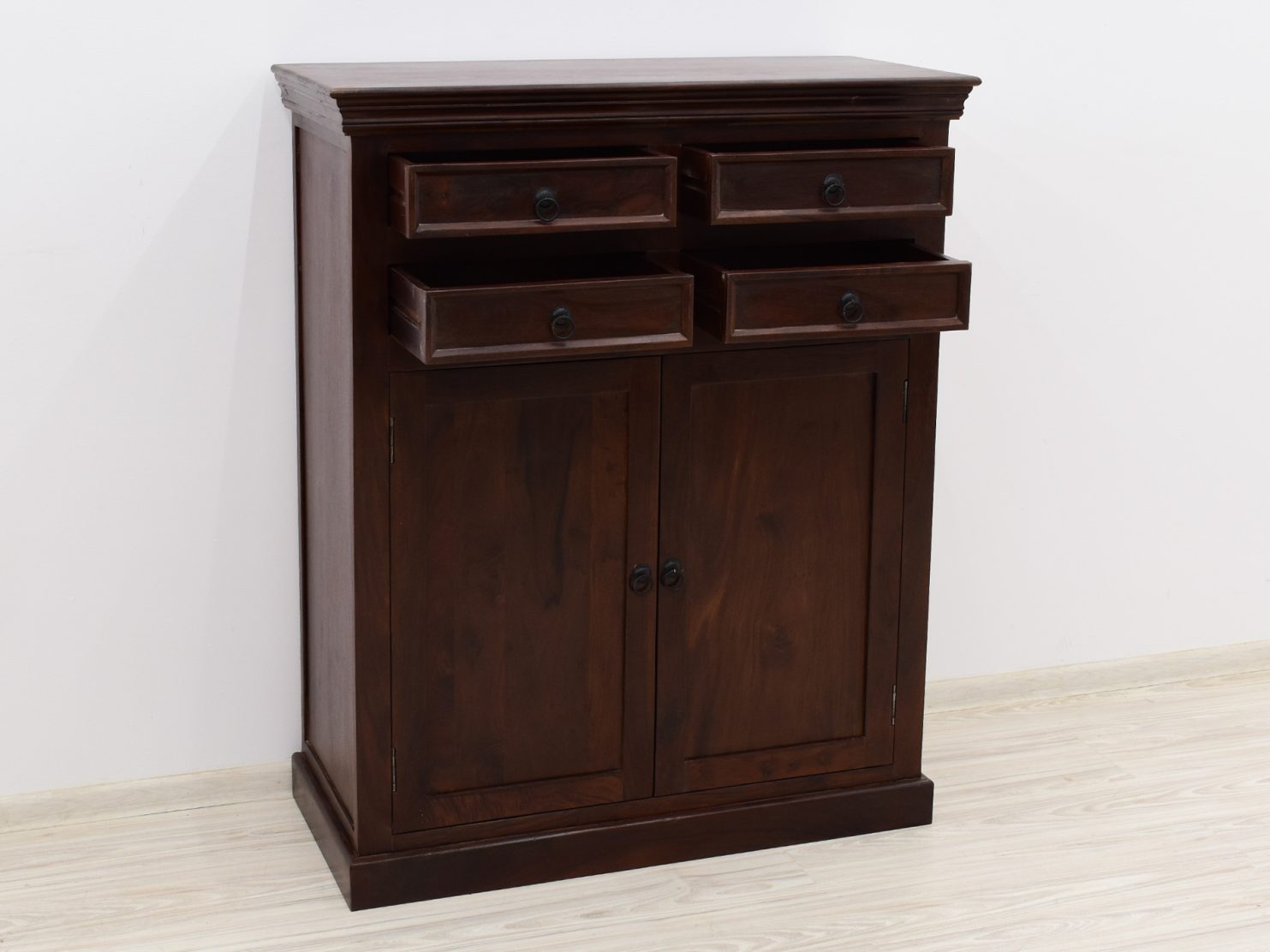 Solidna komoda indyjska bieliźniarka powstała z wytrzymałego drewna palisandru indyjskiego. Wykonana w 100% z litego drewna, ozdobiona masywnym, frezowanym wieńcem oraz delikatnymi uchwytami z metalu. Posiada cztery szuflady oraz pojemną wnękę ukrytą za dwoma drzwiczkami. Mebel ten idealnie nadaje się na bieliźniarkę lub jako funkcjonalna komoda usytuowana w przedpokoju.