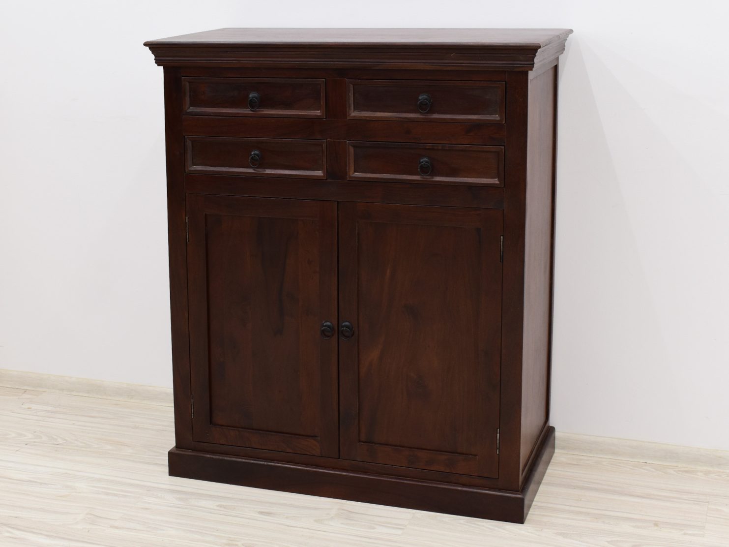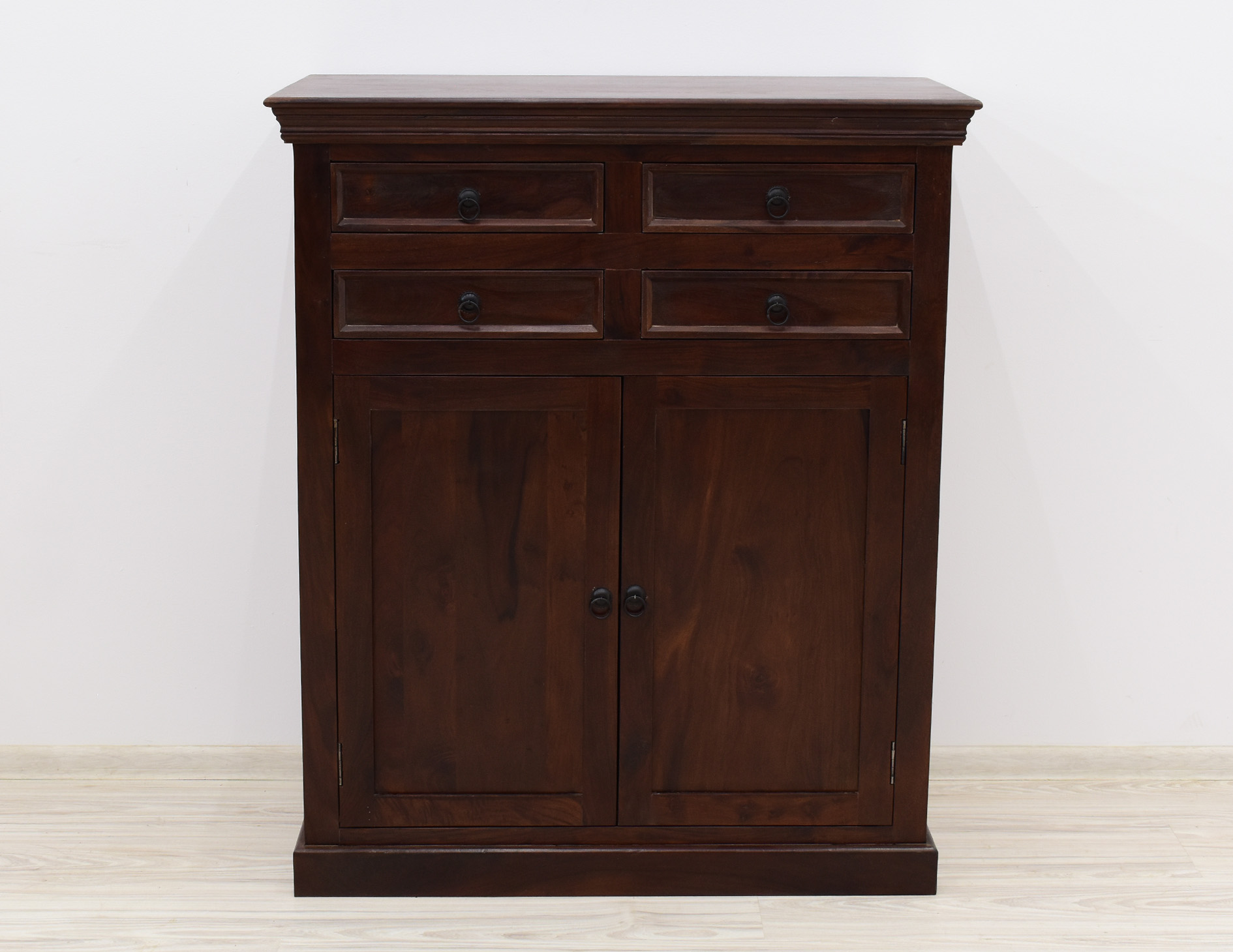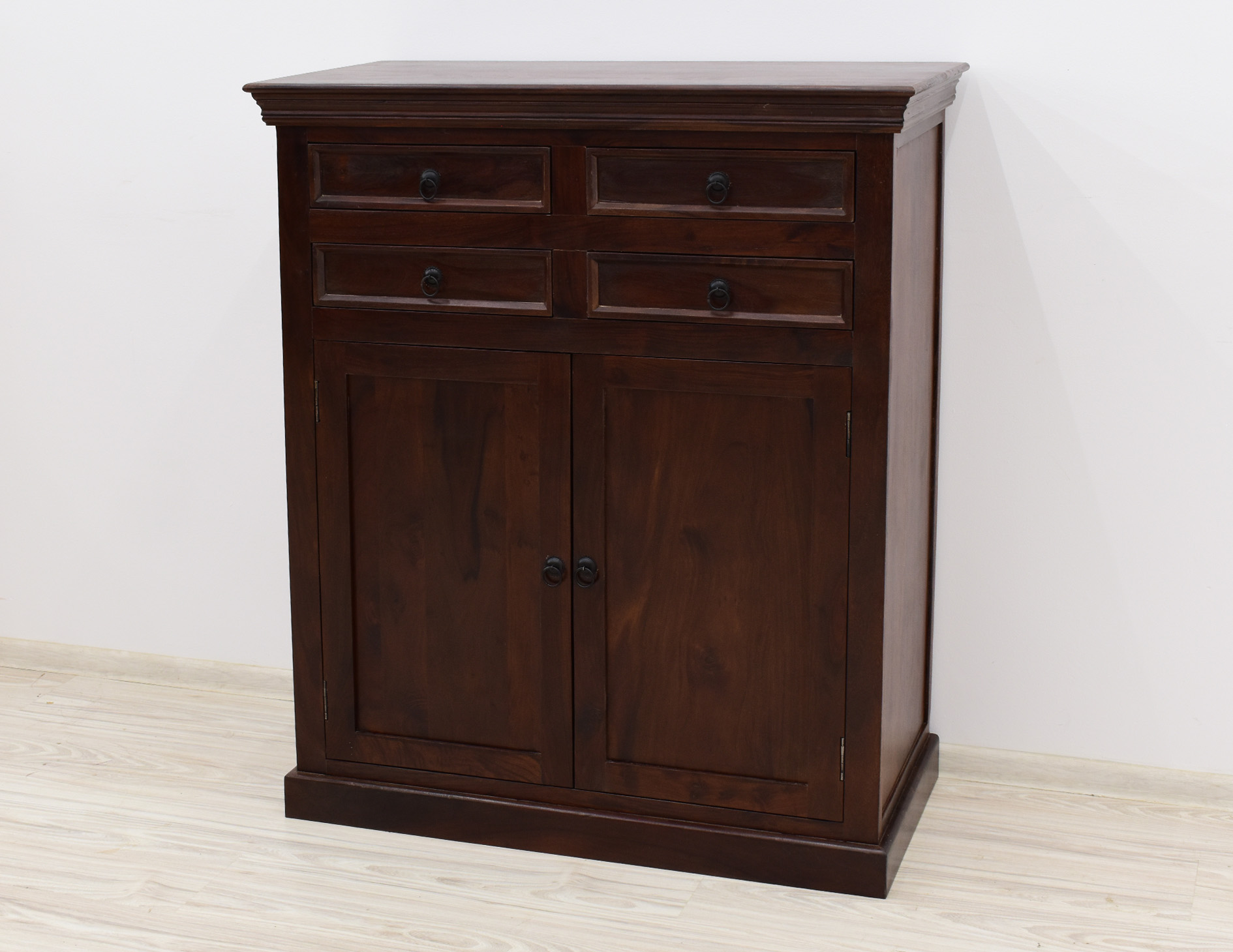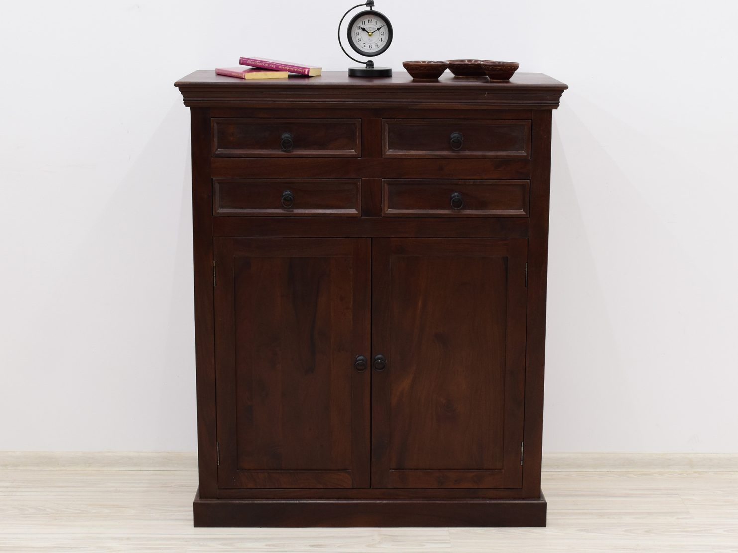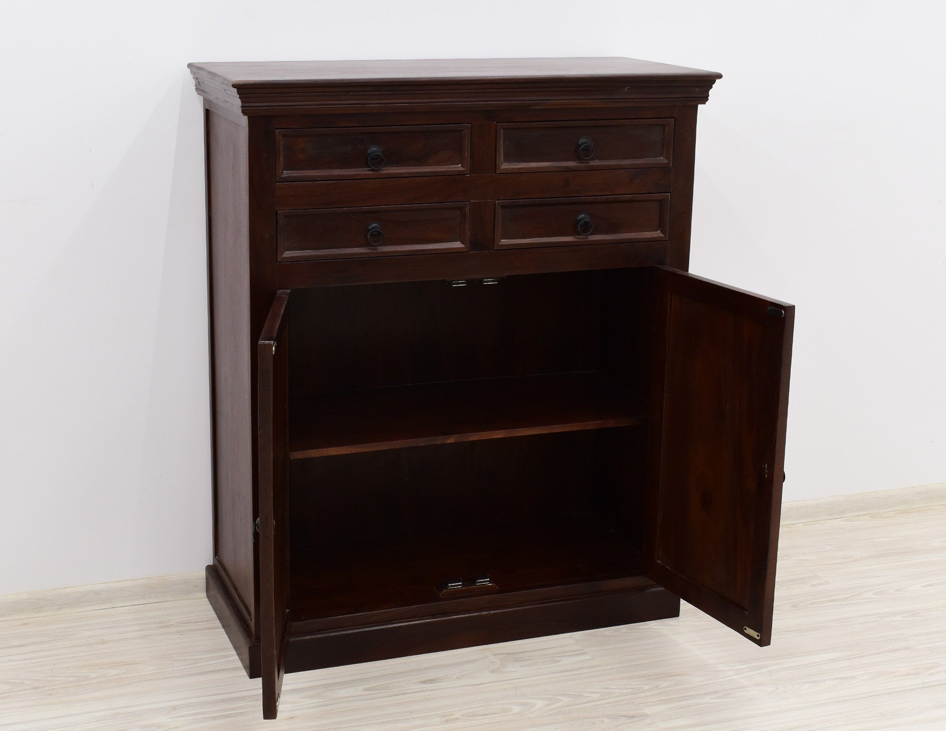Solidna komoda indyjska bieliźniarka powstała z wytrzymałego drewna palisandru indyjskiego. Wykonana w 100% z litego drewna, ozdobiona masywnym, frezowanym wieńcem oraz delikatnymi uchwytami z metalu. Posiada cztery szuflady oraz pojemną wnękę ukrytą za dwoma drzwiczkami. Mebel ten idealnie nadaje się na bieliźniarkę lub jako funkcjonalna komoda usytuowana w przedpokoju.