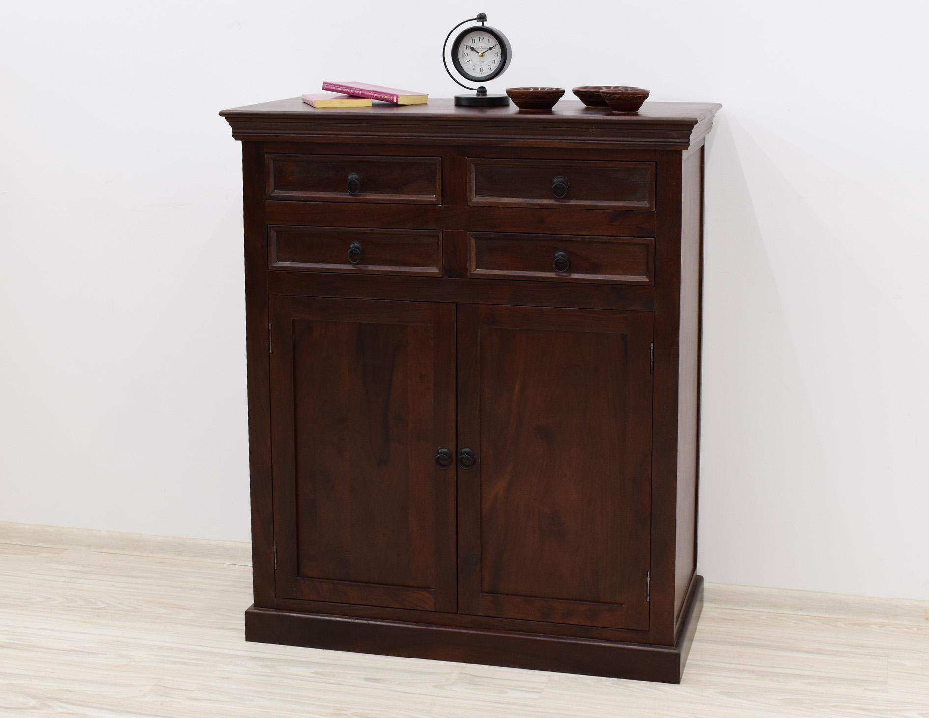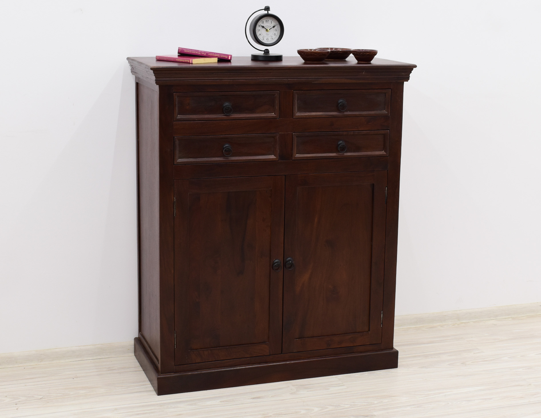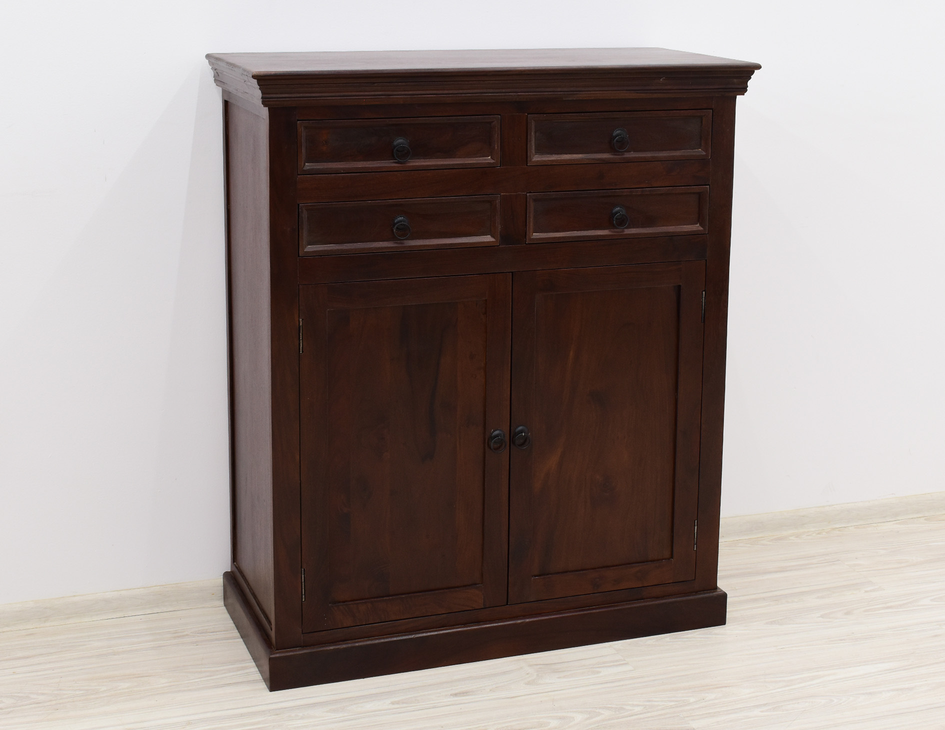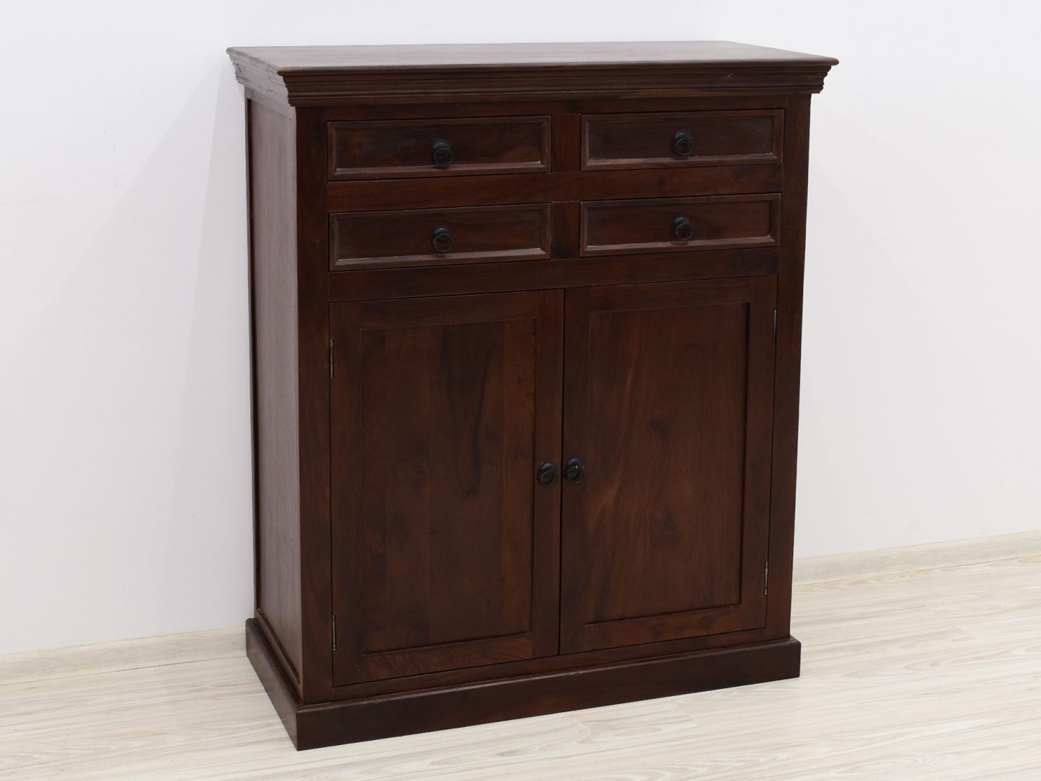 Solidna komoda indyjska bieliźniarka powstała z wytrzymałego drewna palisandru indyjskiego. Wykonana w 100% z litego drewna, ozdobiona masywnym, frezowanym wieńcem oraz delikatnymi uchwytami z metalu. Posiada cztery szuflady oraz pojemną wnękę ukrytą za dwoma drzwiczkami. Mebel ten idealnie nadaje się na bieliźniarkę lub jako funkcjonalna komoda usytuowana w przedpokoju.