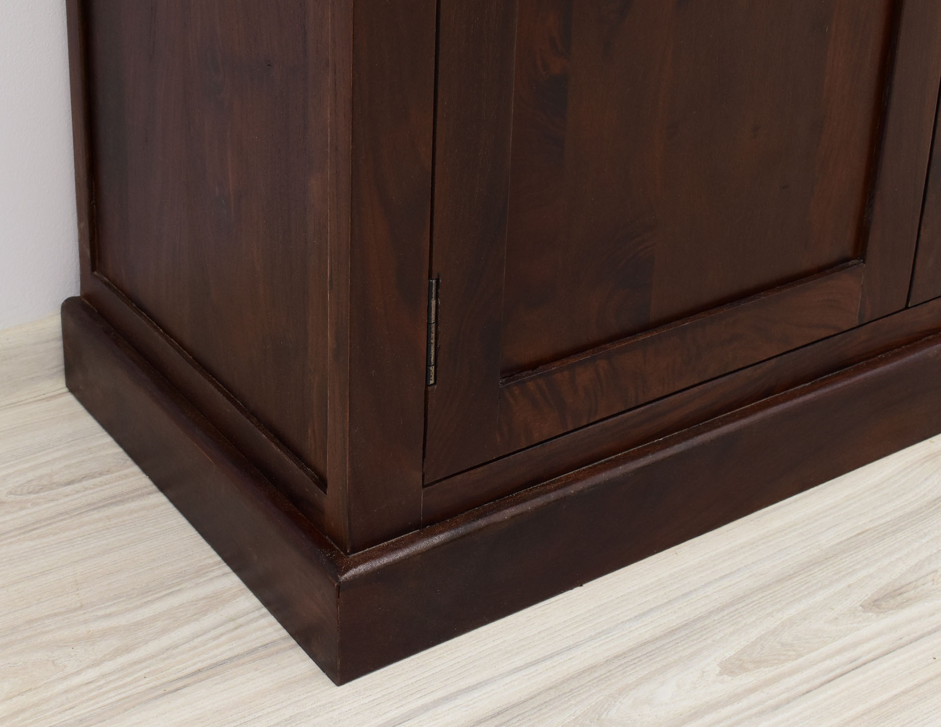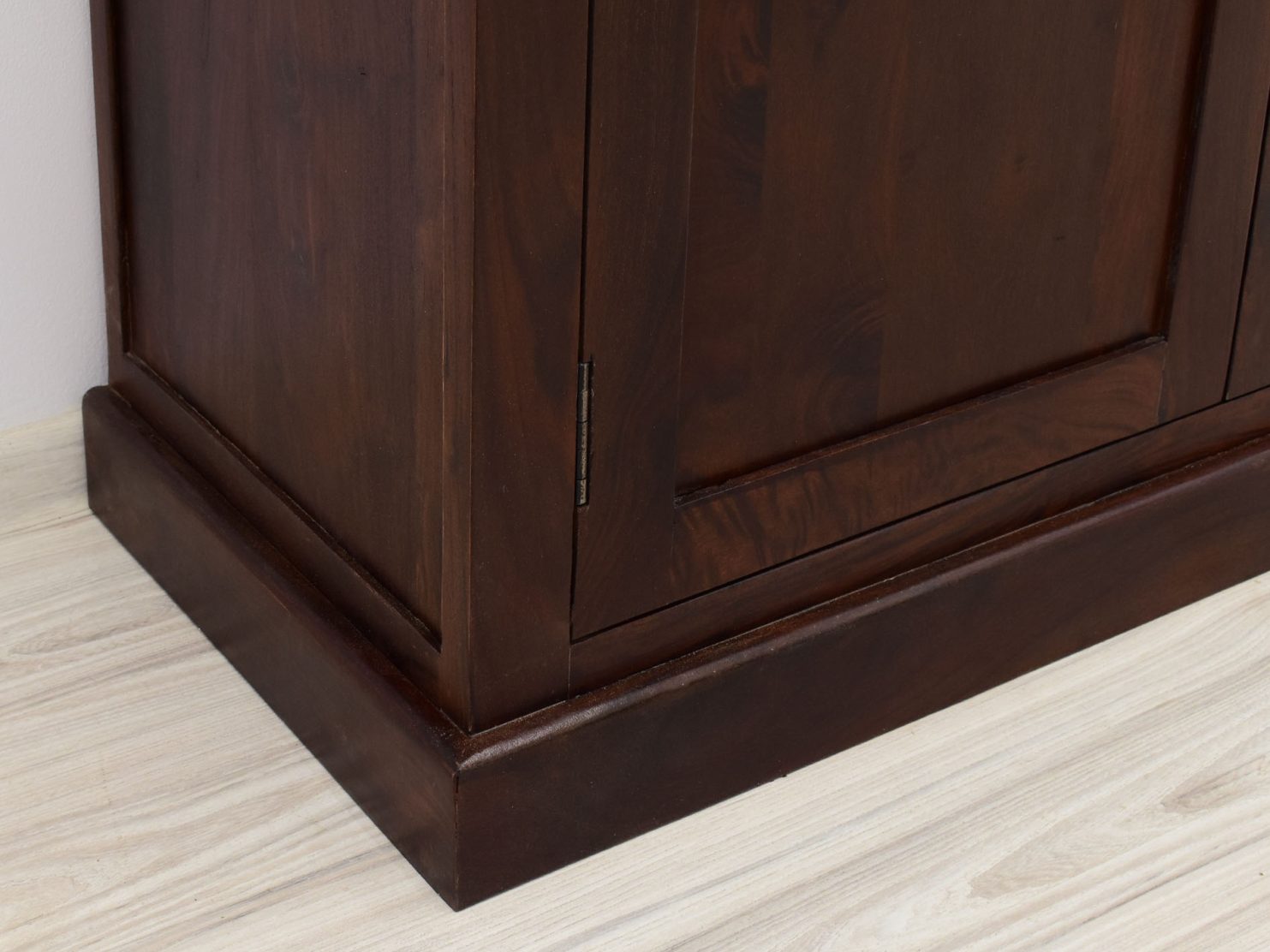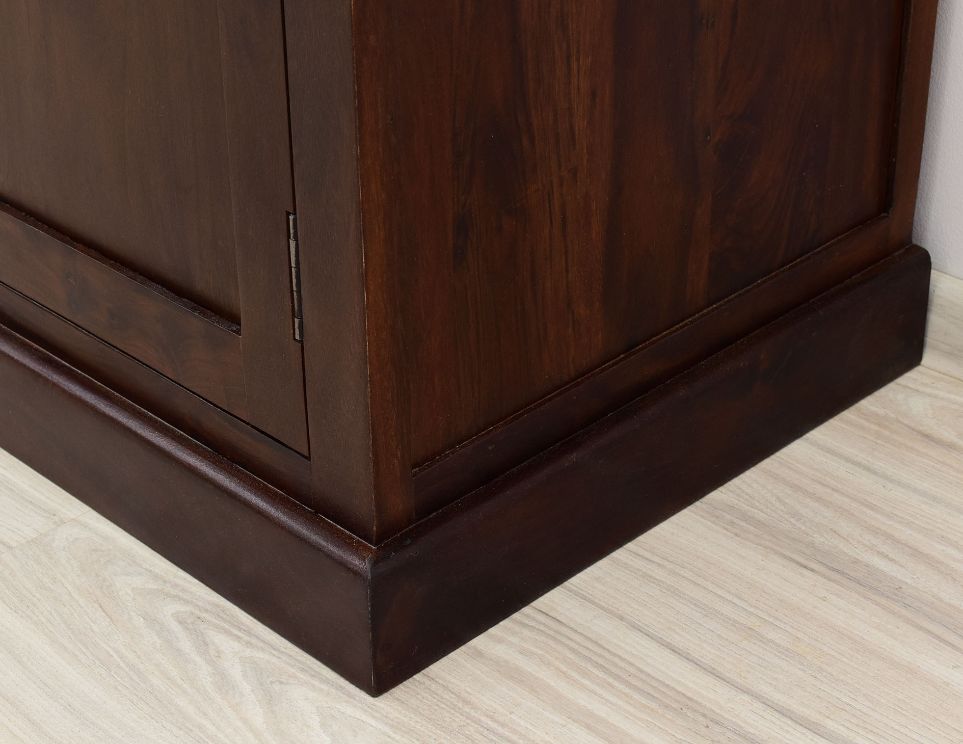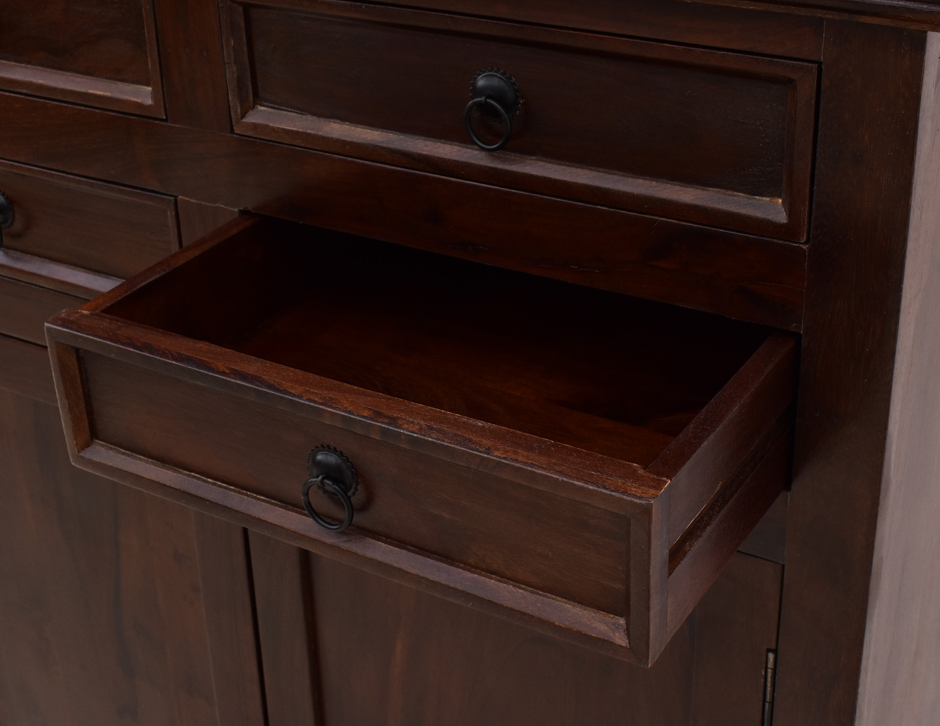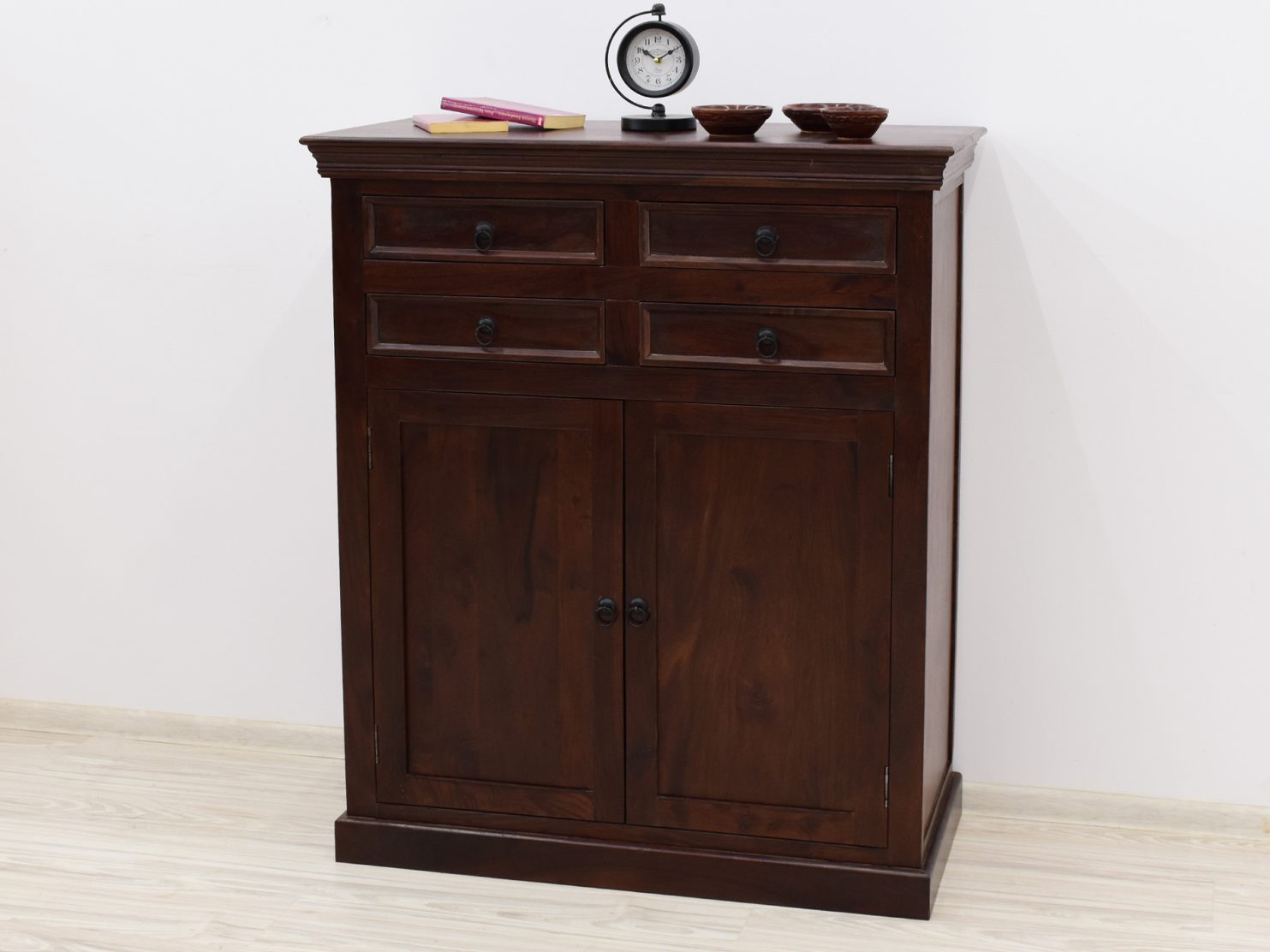Solidna komoda indyjska bieliźniarka powstała z wytrzymałego drewna palisandru indyjskiego. Wykonana w 100% z litego drewna, ozdobiona masywnym, frezowanym wieńcem oraz delikatnymi uchwytami z metalu. Posiada cztery szuflady oraz pojemną wnękę ukrytą za dwoma drzwiczkami. Mebel ten idealnie nadaje się na bieliźniarkę lub jako funkcjonalna komoda usytuowana w przedpokoju.