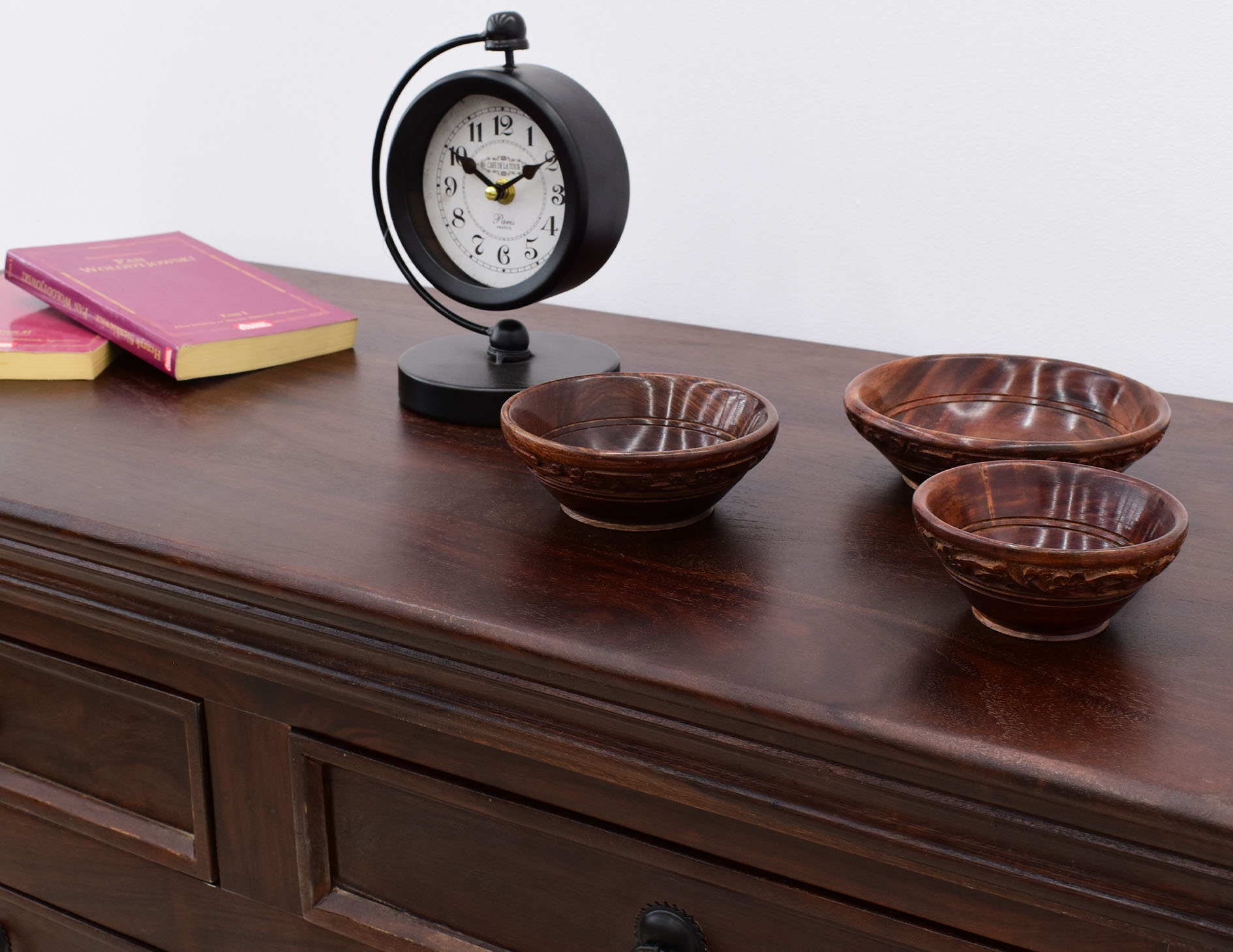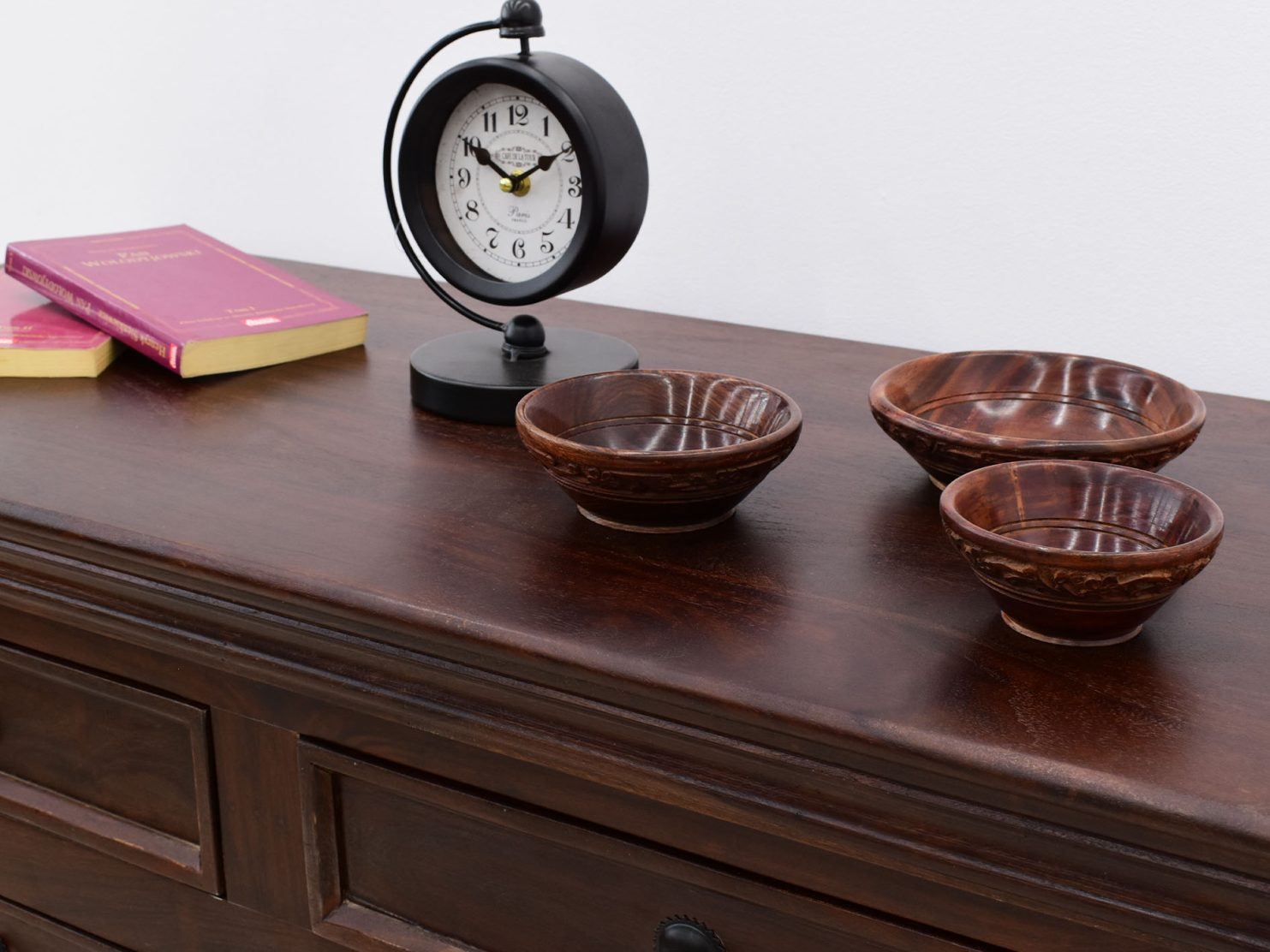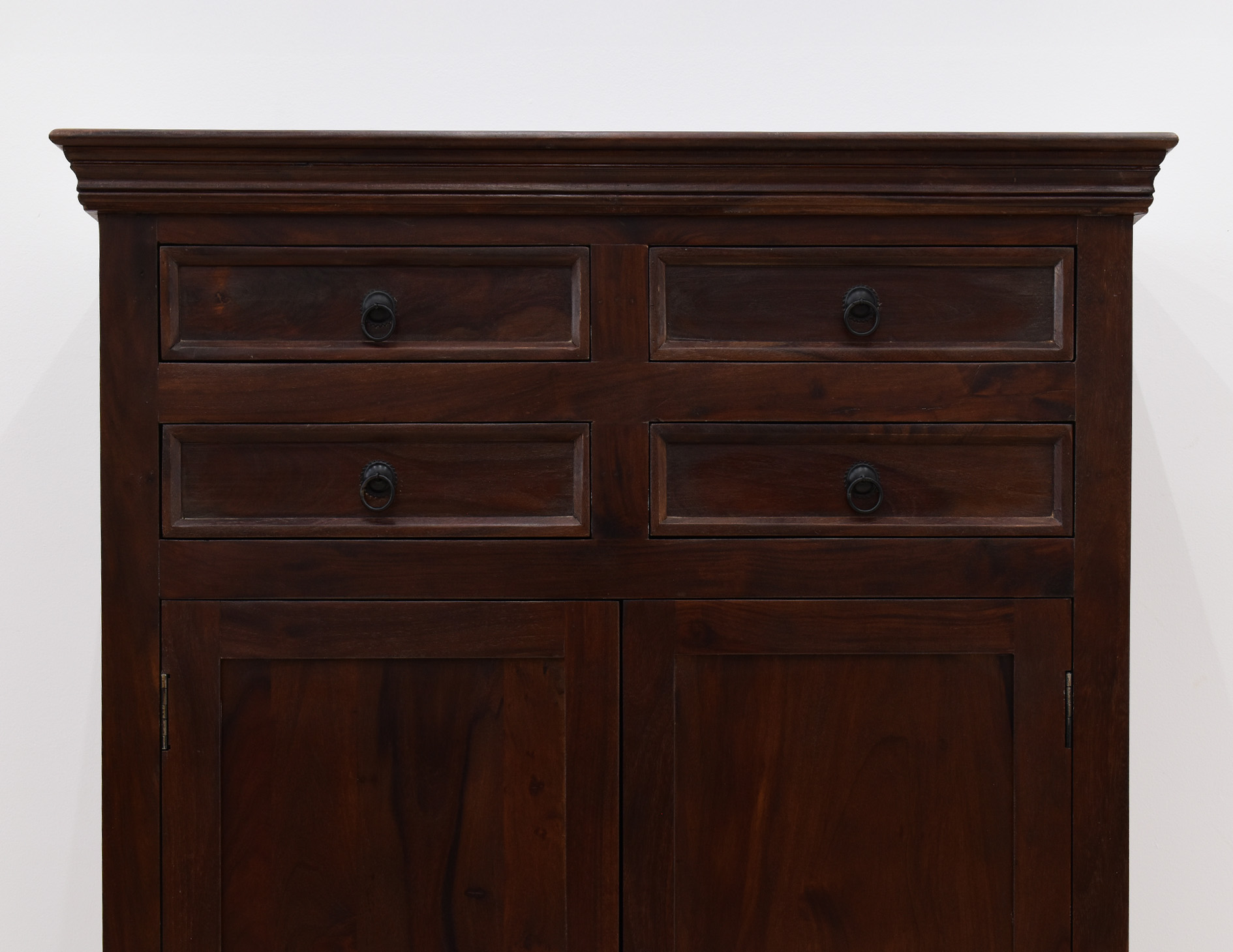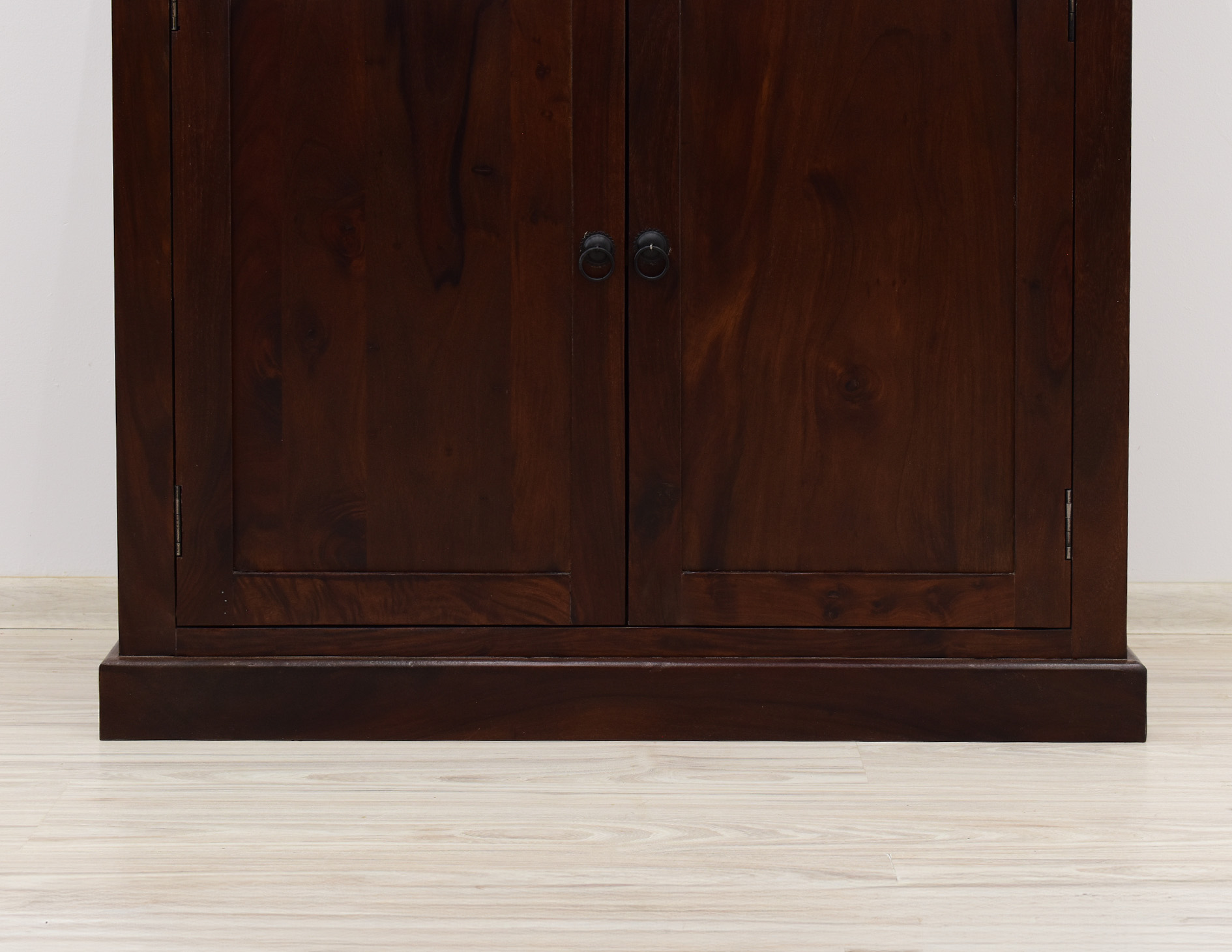 Solidna komoda indyjska bieliźniarka powstała z wytrzymałego drewna palisandru indyjskiego. Wykonana w 100% z litego drewna, ozdobiona masywnym, frezowanym wieńcem oraz delikatnymi uchwytami z metalu. Posiada cztery szuflady oraz pojemną wnękę ukrytą za dwoma drzwiczkami. Mebel ten idealnie nadaje się na bieliźniarkę lub jako funkcjonalna komoda usytuowana w przedpokoju.