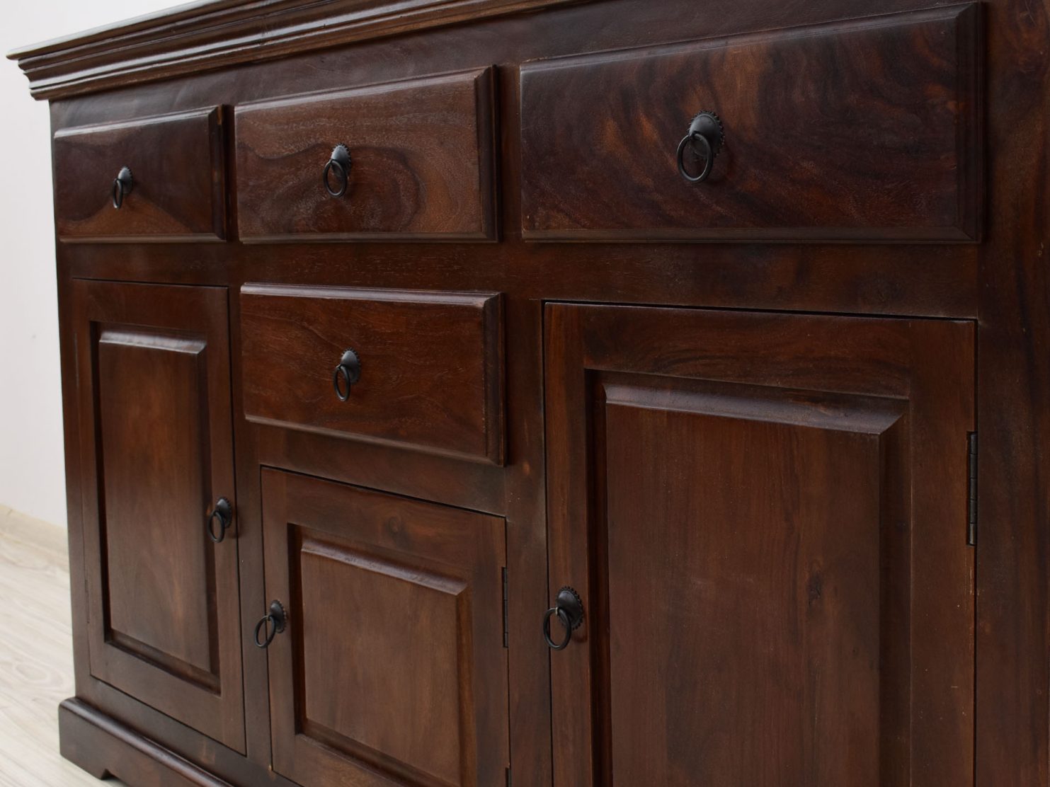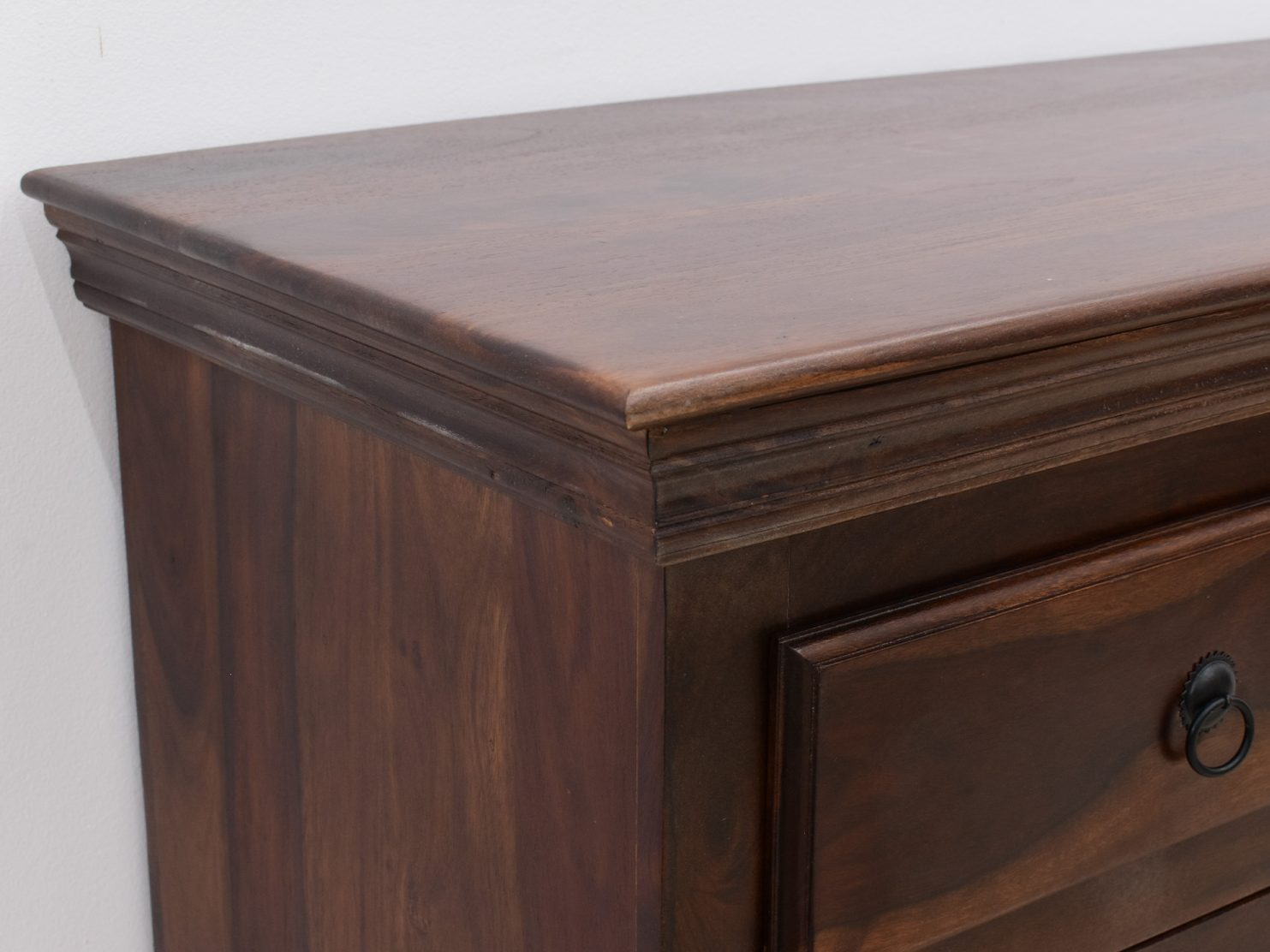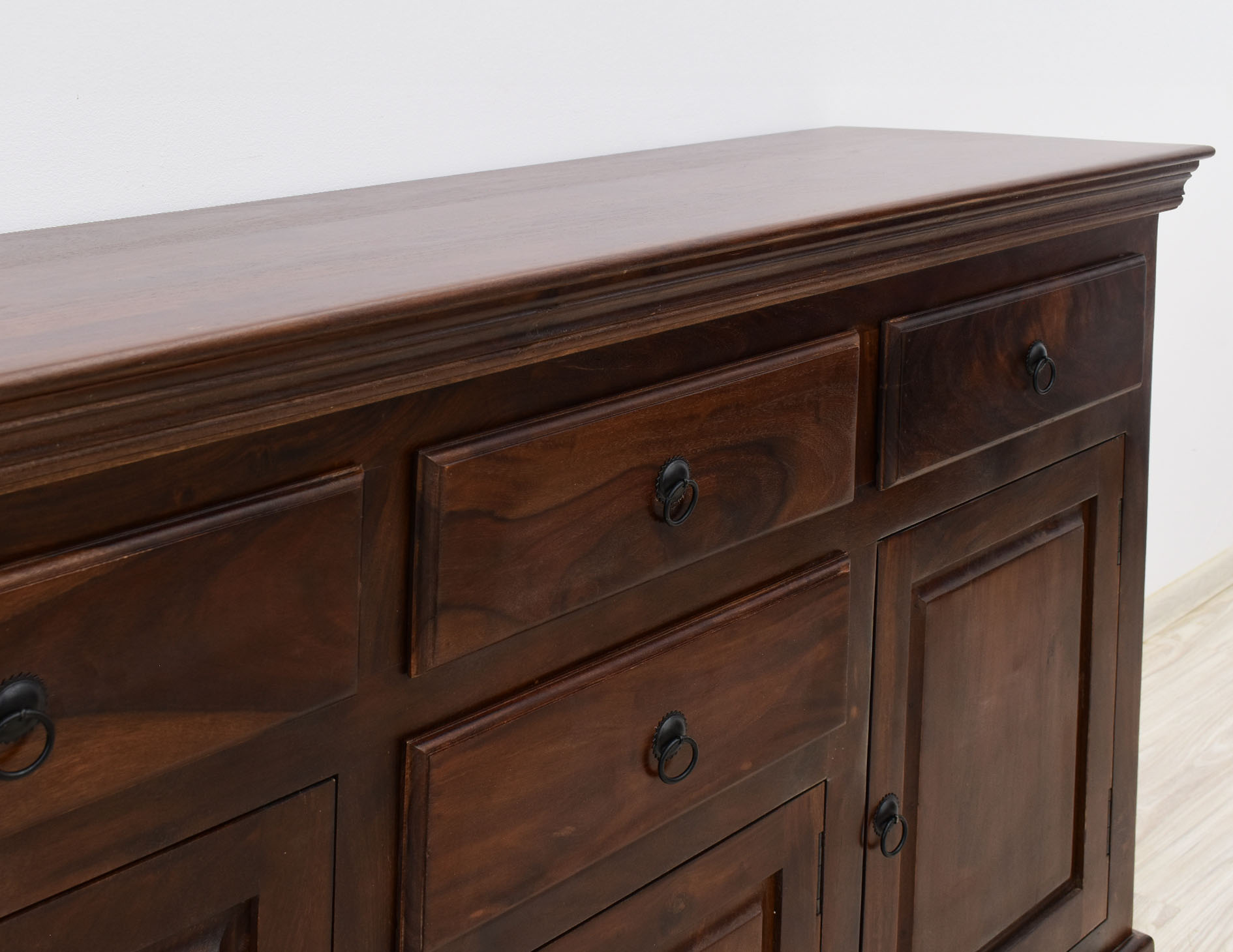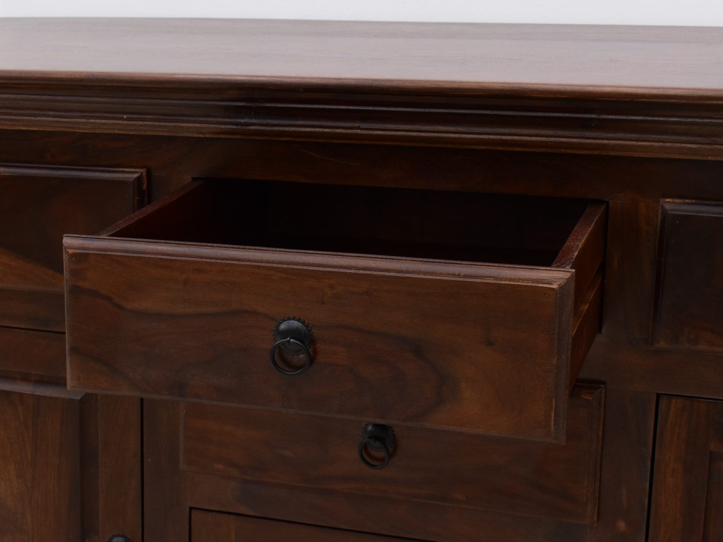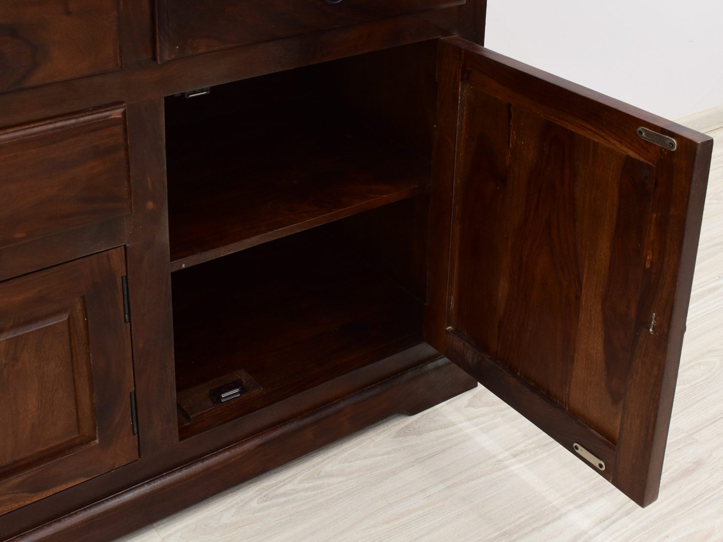 Funkcjonalna komoda kolonialna, która posiada trzy pojemne wnęki oraz cztery szuflady umieszczone tuż pod masywnym frezowanym blatem. Fronty szuflad nie posiadają żadnych zdobień, natomiast fronty wnęk mają subtelny frez dookoła. Całość stanowi bardzo skromny, klasyczny mebel, którego ozdobą samą w sobie jest niezwykle trwałe i charakterystyczne drewno palisandru. Komoda wykonana w 100% z litego drewna palisandru indyjskiego. Mebel ten znajdzie swoje miejsce w każdym salonie, sypialni lub przedpokoju. Ze względu na ręczne wykonanie, przez indyjskich rzemieślników, każdy okaz jest unikatowy.