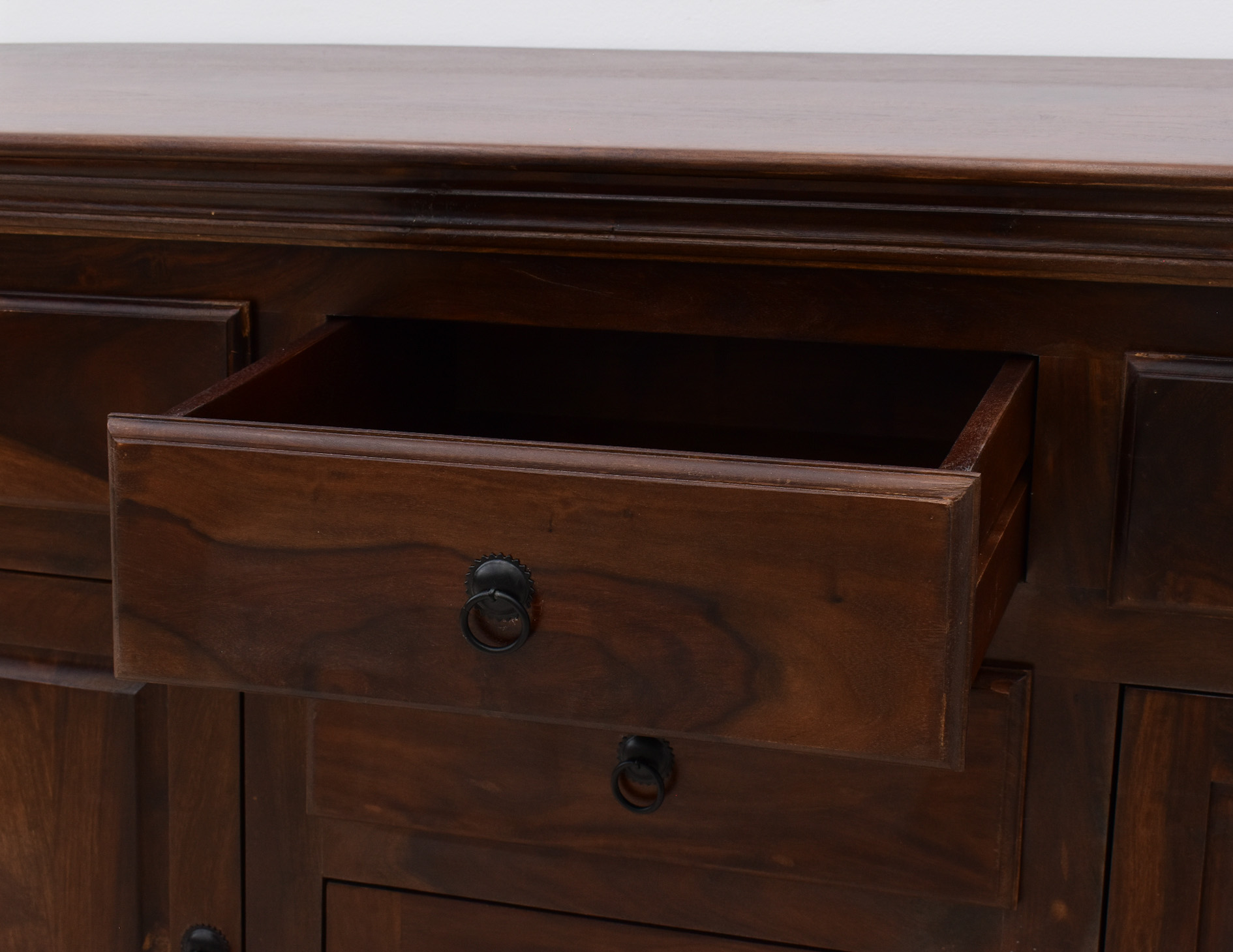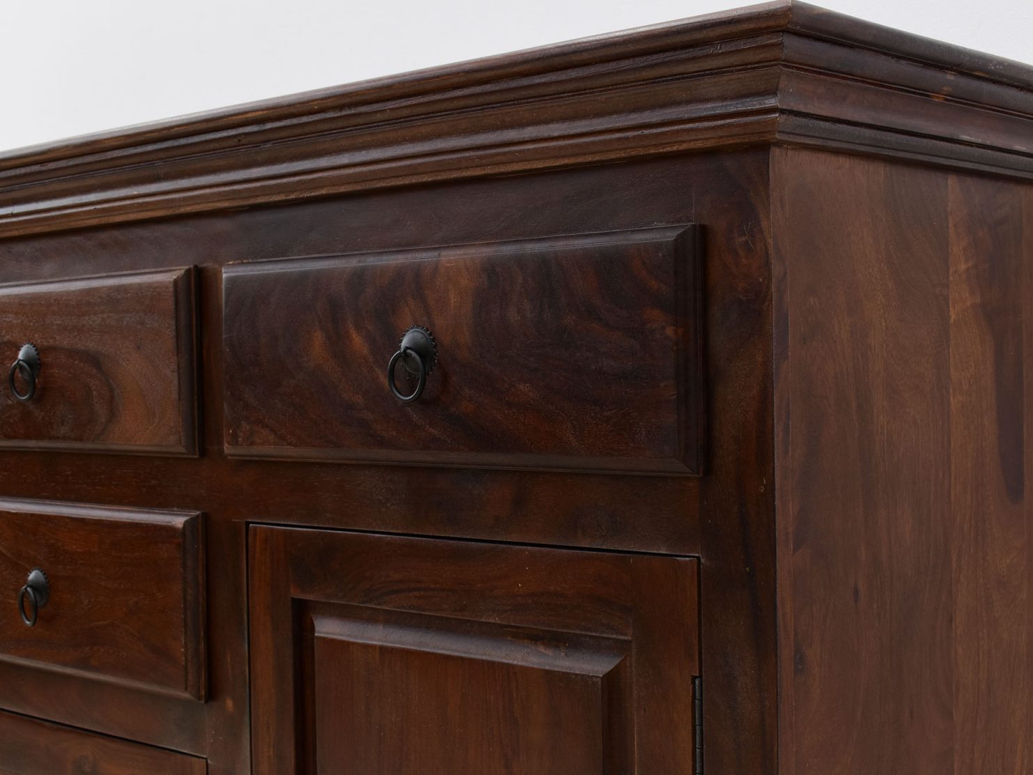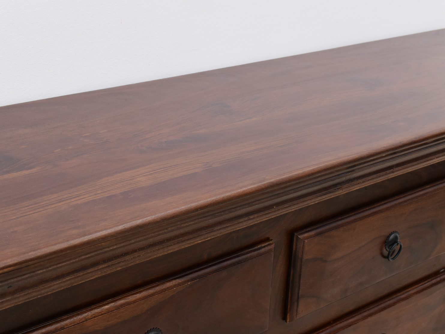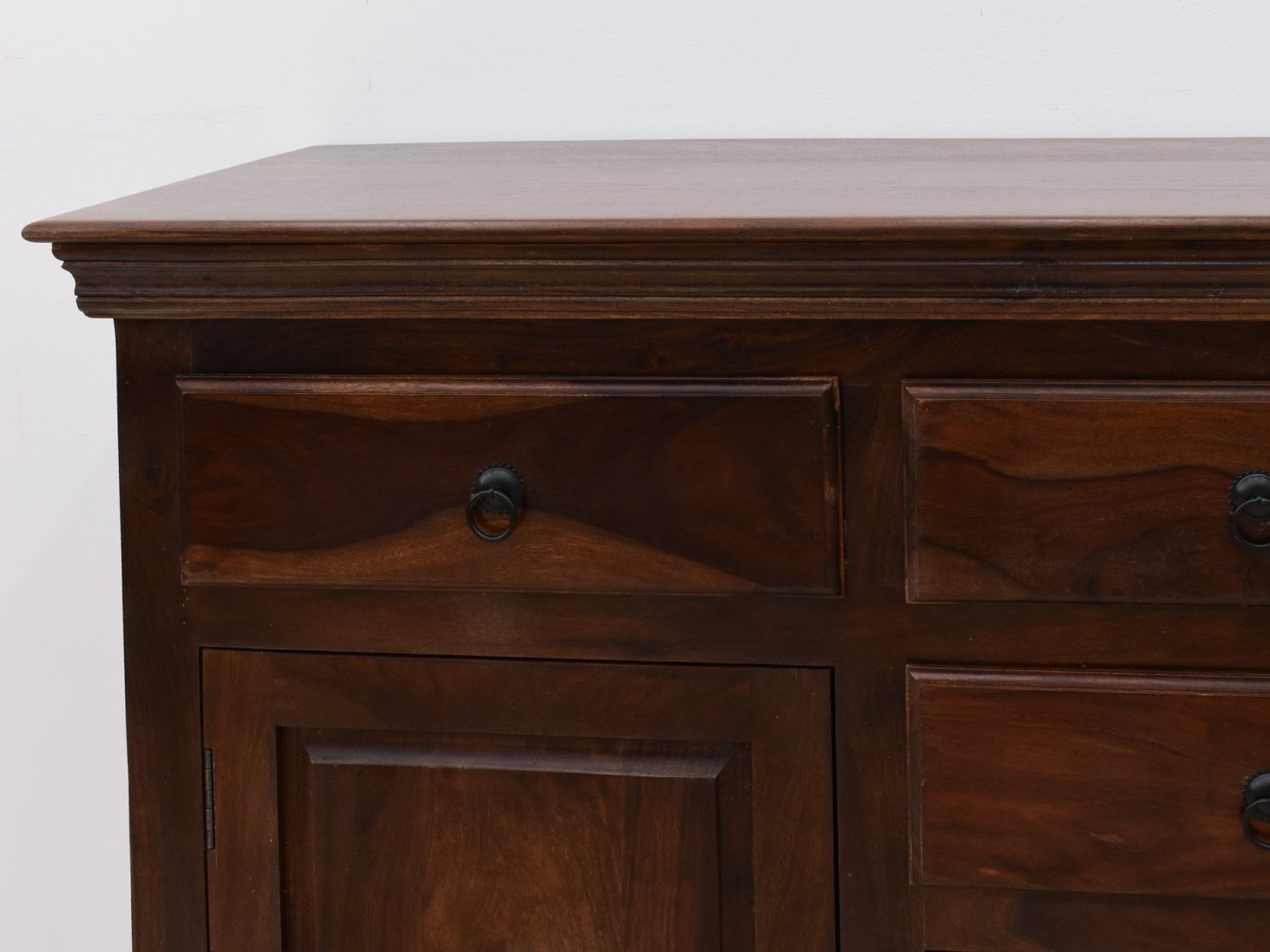 Funkcjonalna komoda kolonialna, która posiada trzy pojemne wnęki oraz cztery szuflady umieszczone tuż pod masywnym frezowanym blatem. Fronty szuflad nie posiadają żadnych zdobień, natomiast fronty wnęk mają subtelny frez dookoła. Całość stanowi bardzo skromny, klasyczny mebel, którego ozdobą samą w sobie jest niezwykle trwałe i charakterystyczne drewno palisandru. Komoda wykonana w 100% z litego drewna palisandru indyjskiego. Mebel ten znajdzie swoje miejsce w każdym salonie, sypialni lub przedpokoju. Ze względu na ręczne wykonanie, przez indyjskich rzemieślników, każdy okaz jest unikatowy.