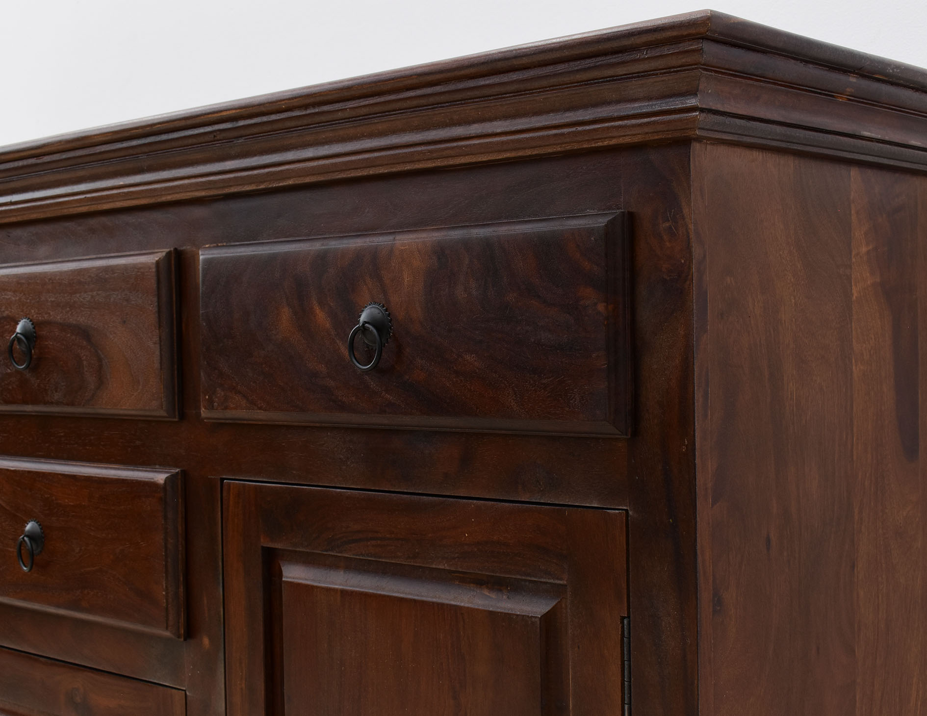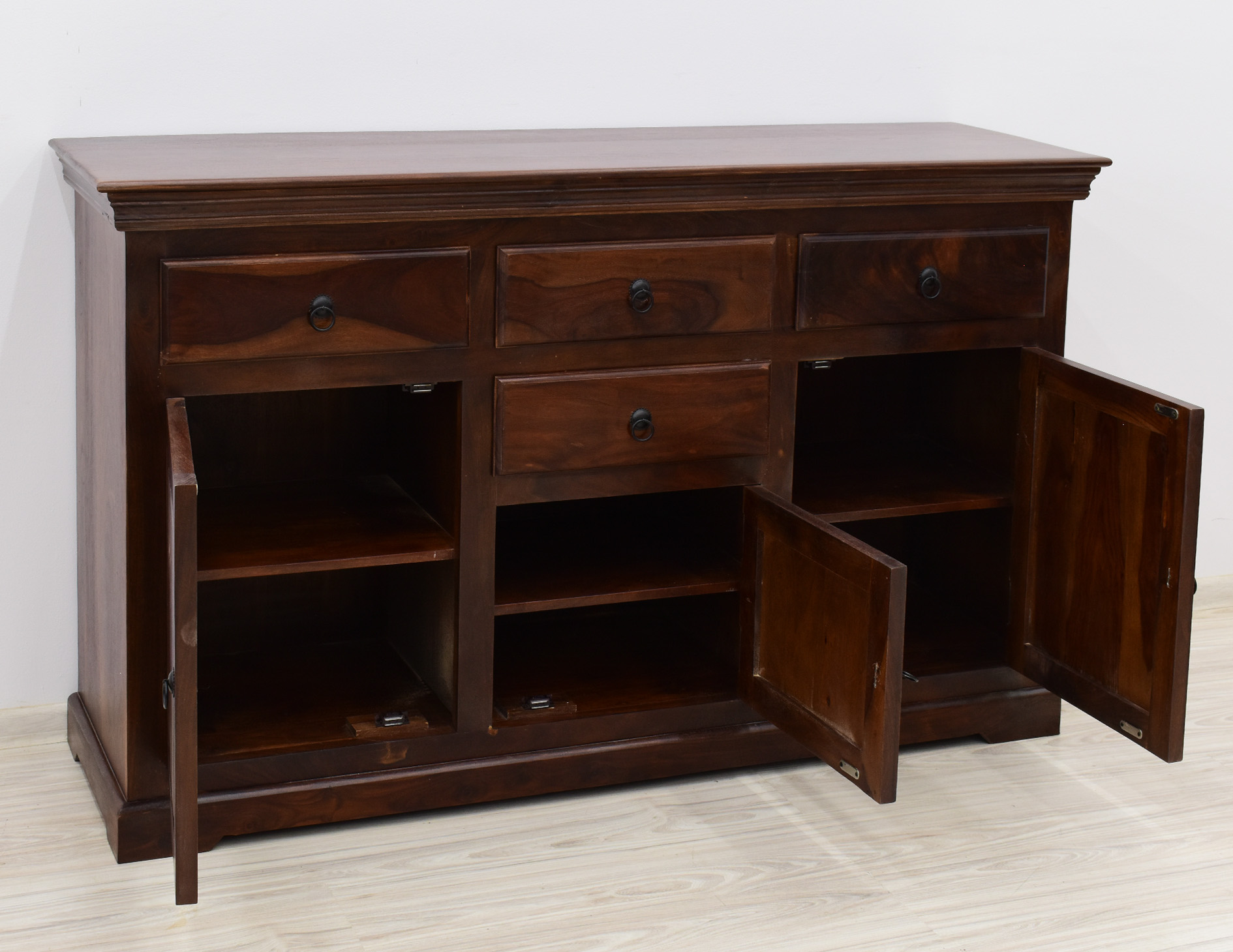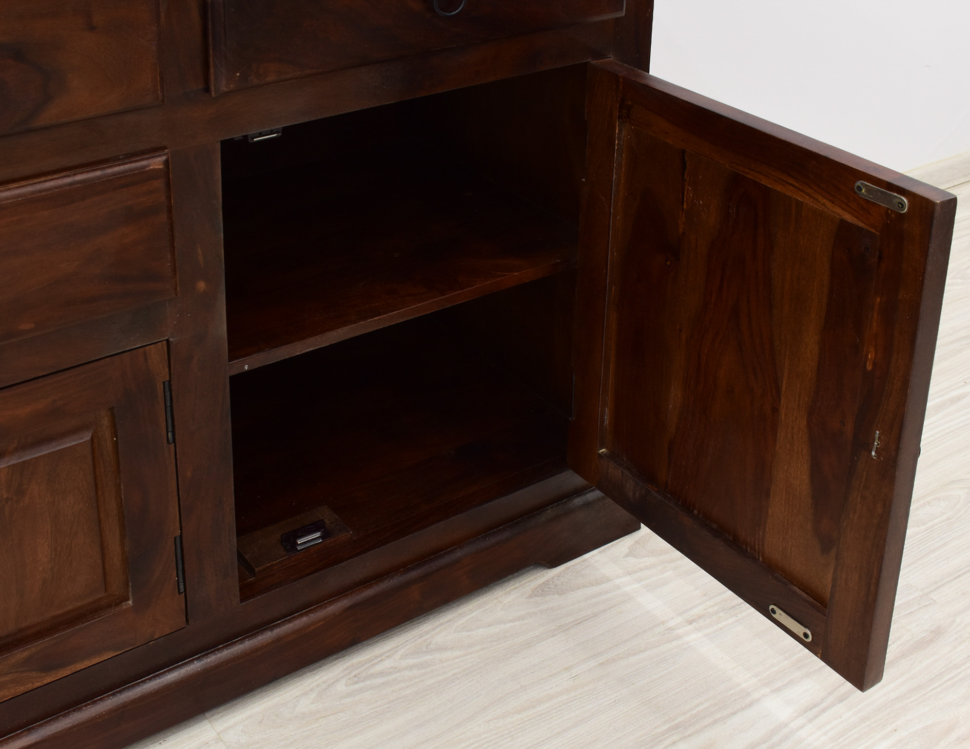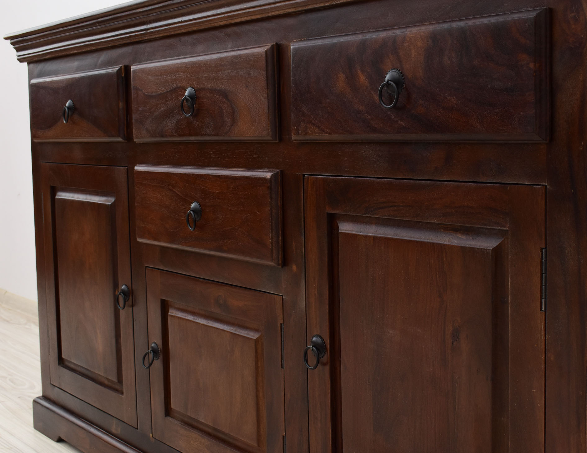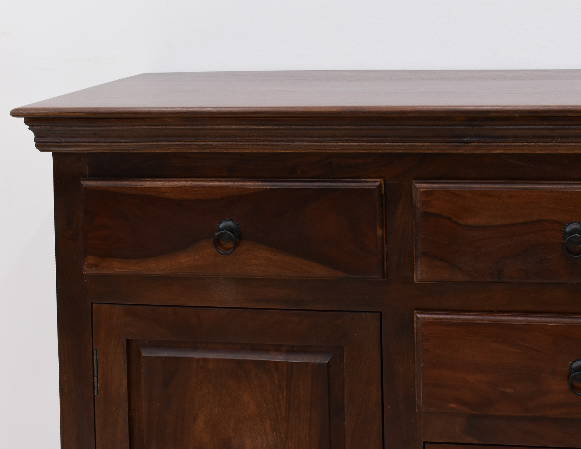 Funkcjonalna komoda kolonialna, która posiada trzy pojemne wnęki oraz cztery szuflady umieszczone tuż pod masywnym frezowanym blatem. Fronty szuflad nie posiadają żadnych zdobień, natomiast fronty wnęk mają subtelny frez dookoła. Całość stanowi bardzo skromny, klasyczny mebel, którego ozdobą samą w sobie jest niezwykle trwałe i charakterystyczne drewno palisandru. Komoda wykonana w 100% z litego drewna palisandru indyjskiego. Mebel ten znajdzie swoje miejsce w każdym salonie, sypialni lub przedpokoju. Ze względu na ręczne wykonanie, przez indyjskich rzemieślników, każdy okaz jest unikatowy.