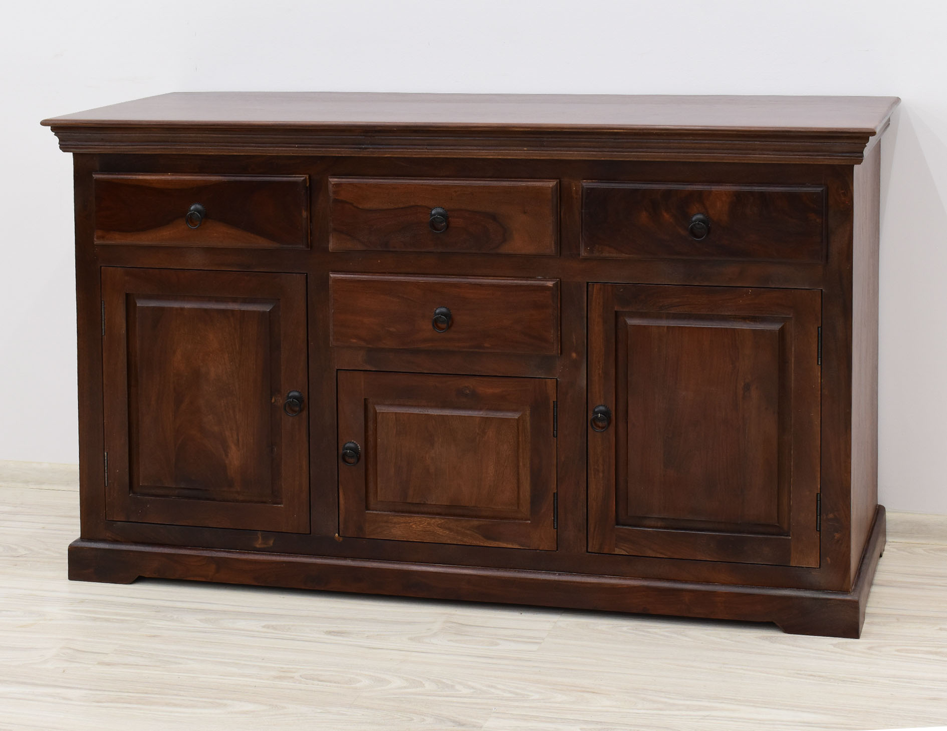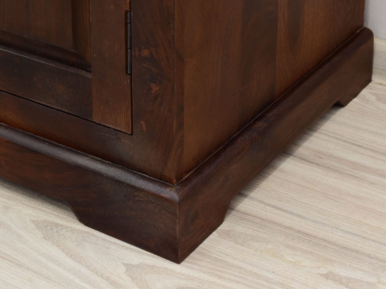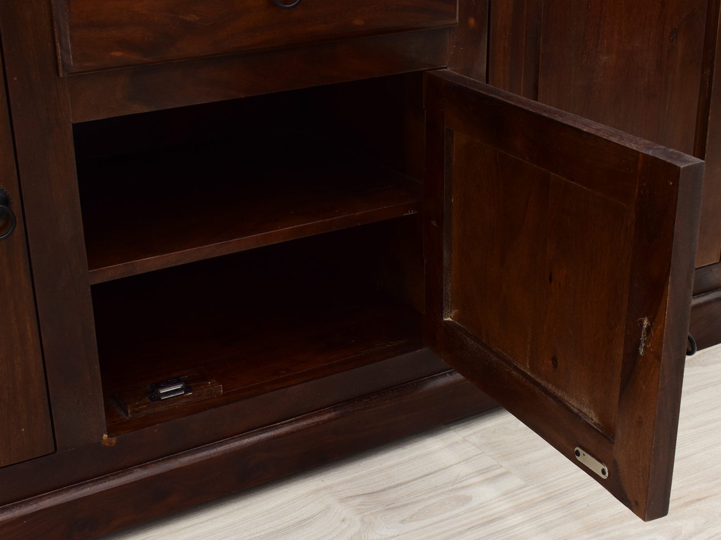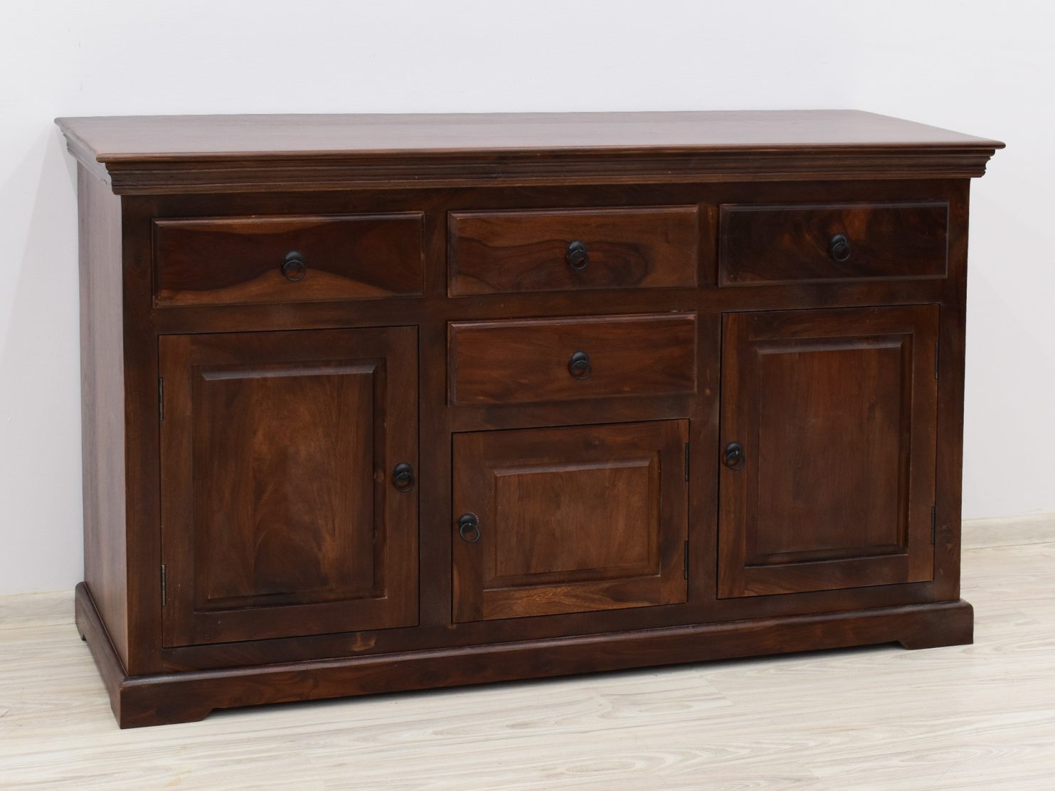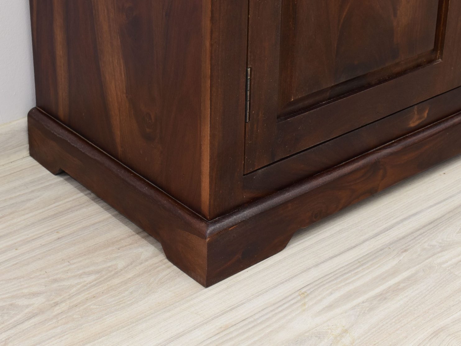 Funkcjonalna komoda kolonialna, która posiada trzy pojemne wnęki oraz cztery szuflady umieszczone tuż pod masywnym frezowanym blatem. Fronty szuflad nie posiadają żadnych zdobień, natomiast fronty wnęk mają subtelny frez dookoła. Całość stanowi bardzo skromny, klasyczny mebel, którego ozdobą samą w sobie jest niezwykle trwałe i charakterystyczne drewno palisandru. Komoda wykonana w 100% z litego drewna palisandru indyjskiego. Mebel ten znajdzie swoje miejsce w każdym salonie, sypialni lub przedpokoju. Ze względu na ręczne wykonanie, przez indyjskich rzemieślników, każdy okaz jest unikatowy.