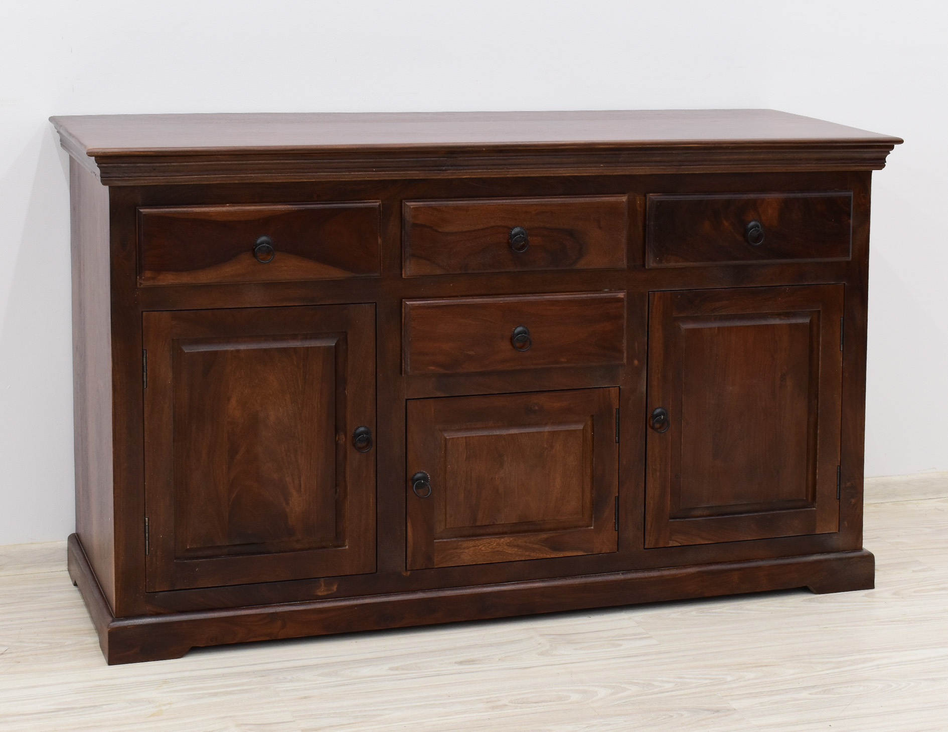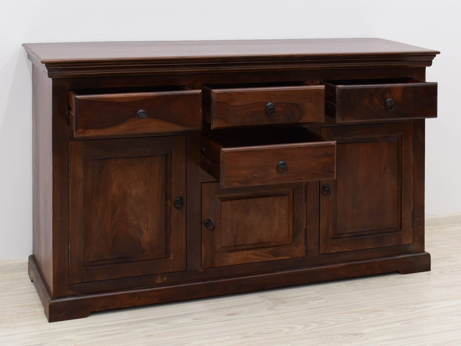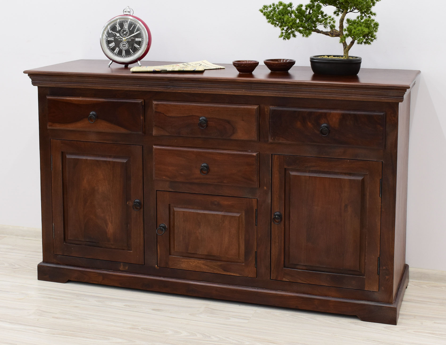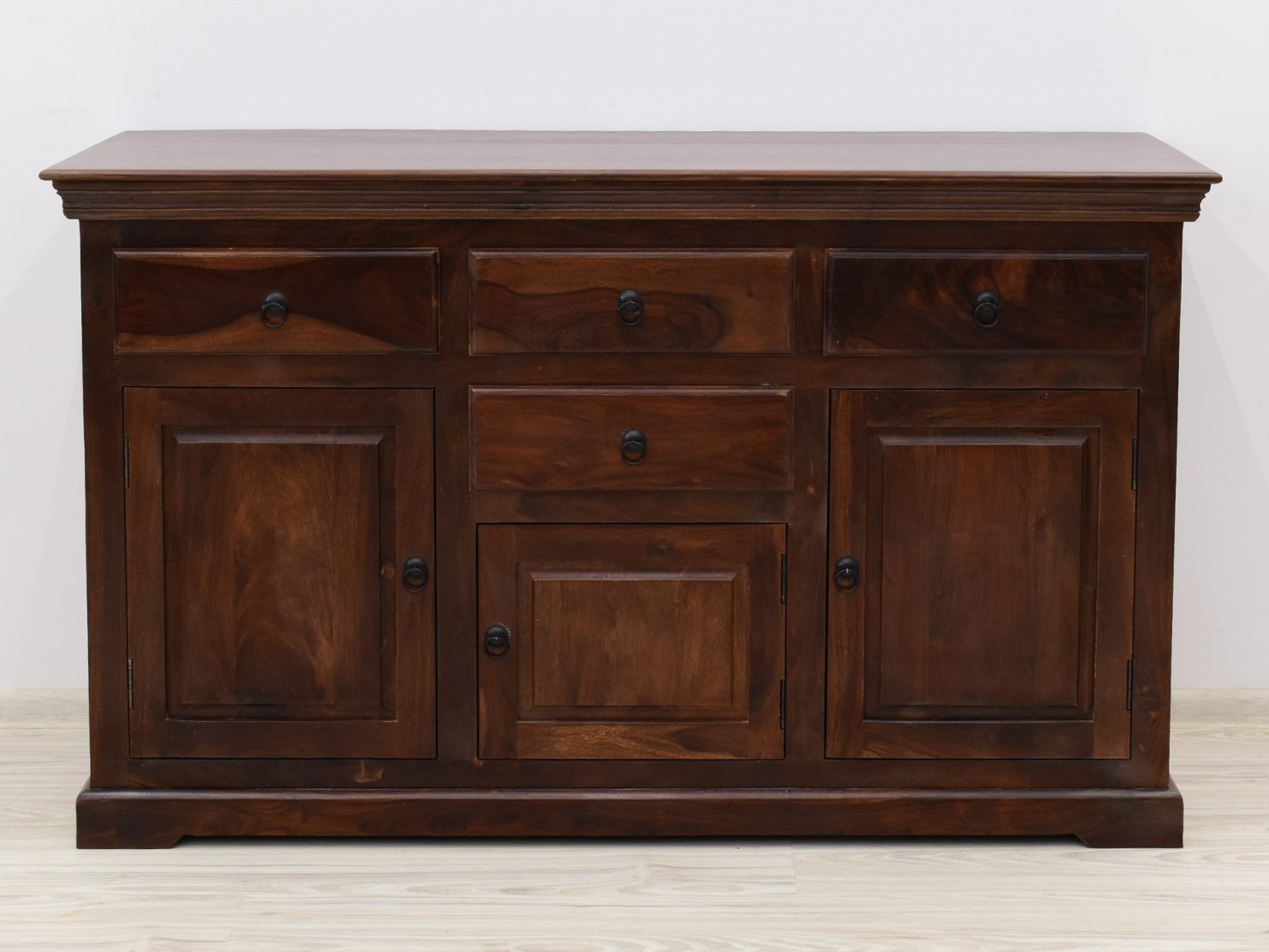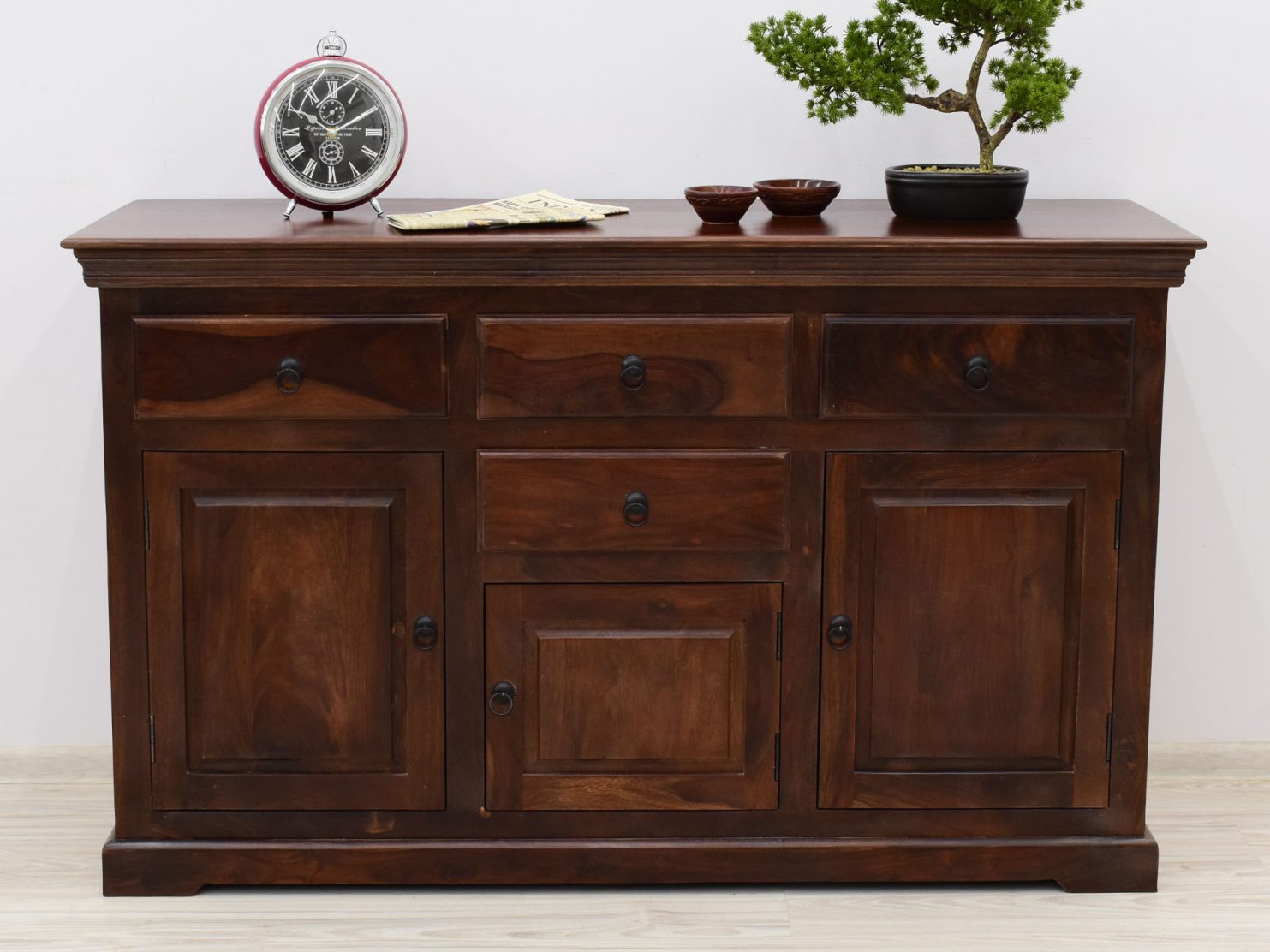 Funkcjonalna komoda kolonialna, która posiada trzy pojemne wnęki oraz cztery szuflady umieszczone tuż pod masywnym frezowanym blatem. Fronty szuflad nie posiadają żadnych zdobień, natomiast fronty wnęk mają subtelny frez dookoła. Całość stanowi bardzo skromny, klasyczny mebel, którego ozdobą samą w sobie jest niezwykle trwałe i charakterystyczne drewno palisandru. Komoda wykonana w 100% z litego drewna palisandru indyjskiego. Mebel ten znajdzie swoje miejsce w każdym salonie, sypialni lub przedpokoju. Ze względu na ręczne wykonanie, przez indyjskich rzemieślników, każdy okaz jest unikatowy.