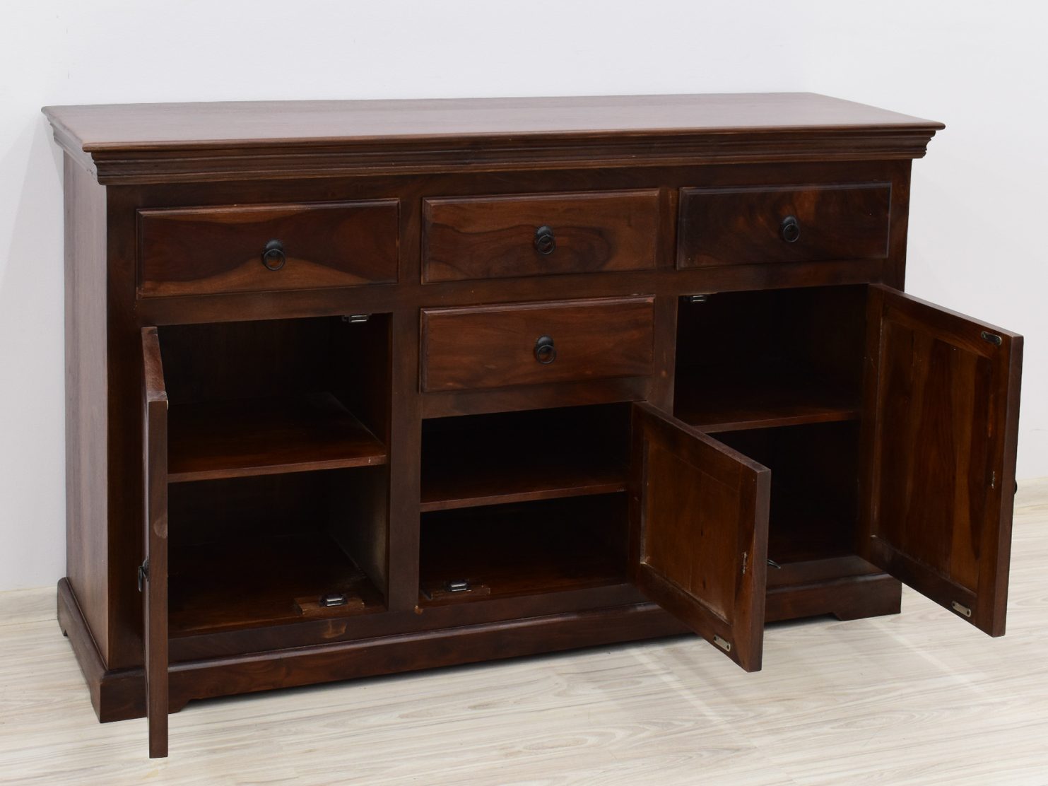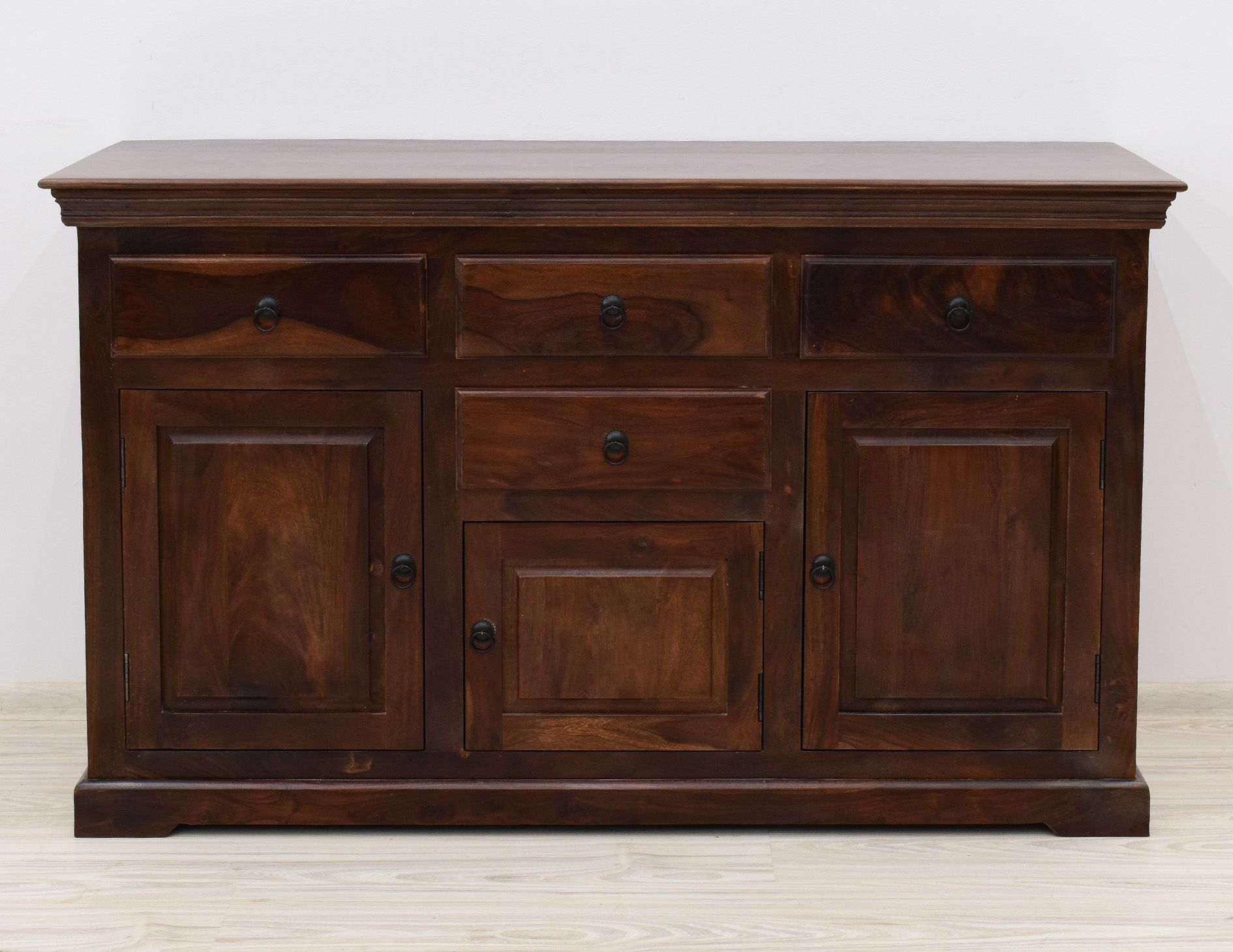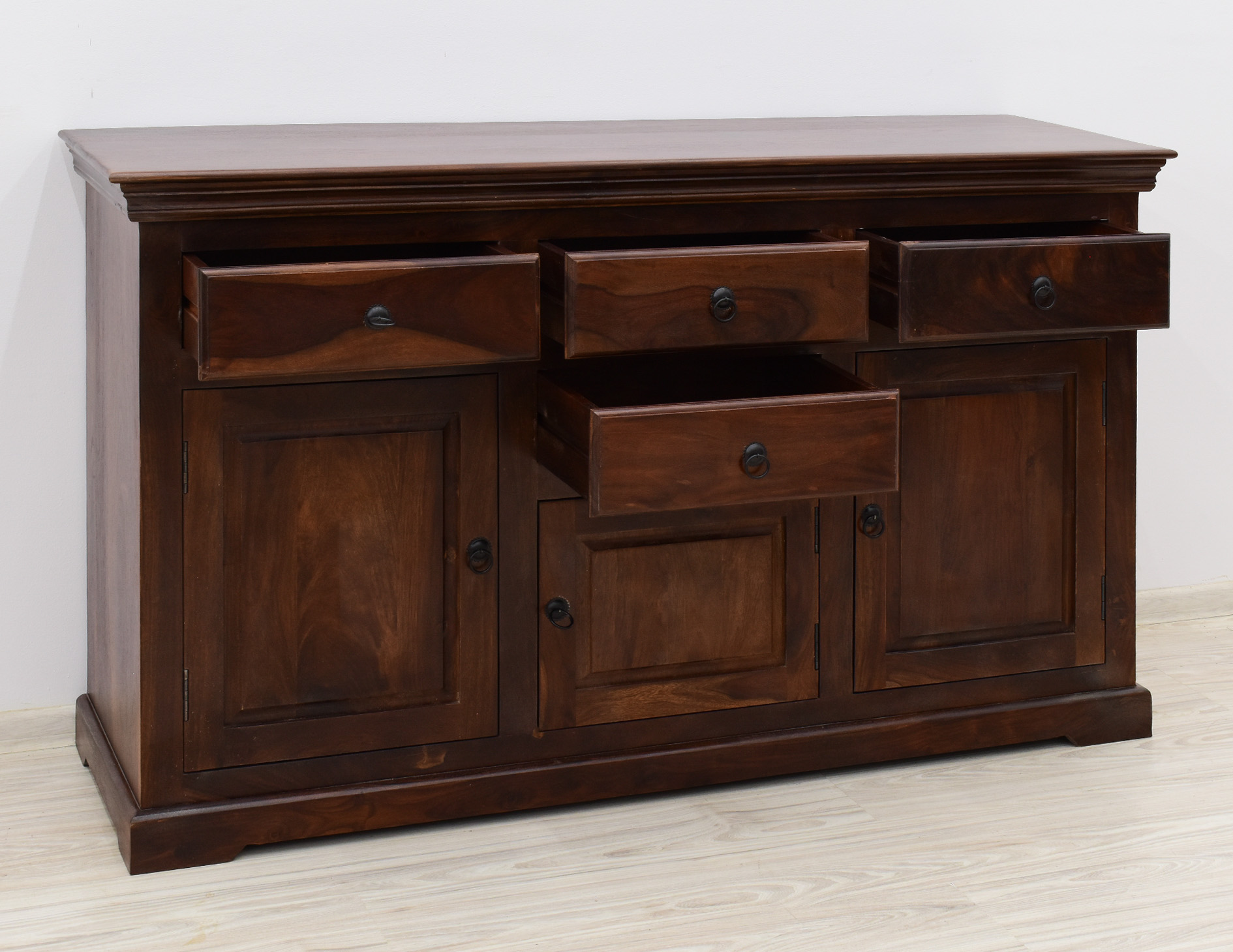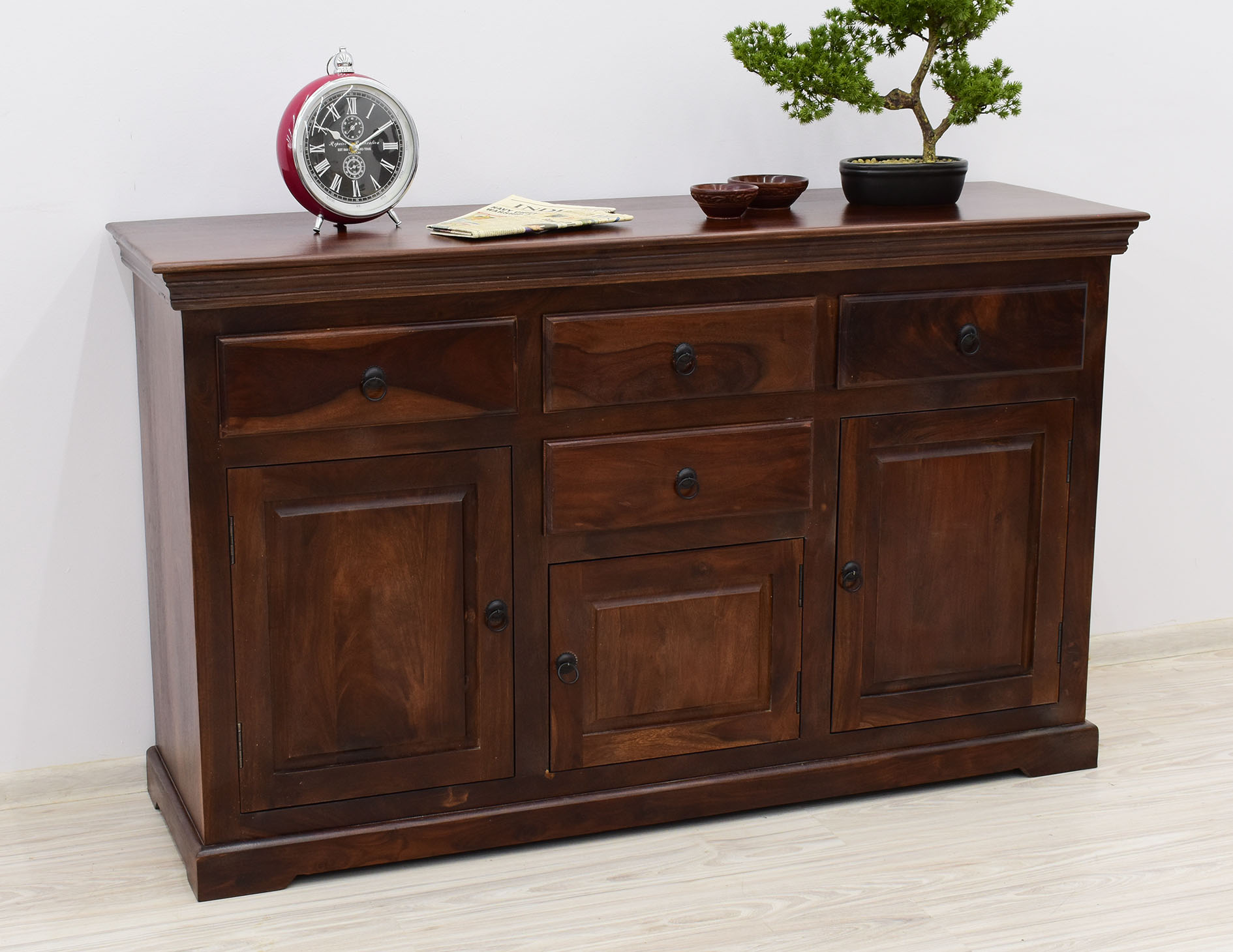 Funkcjonalna komoda kolonialna, która posiada trzy pojemne wnęki oraz cztery szuflady umieszczone tuż pod masywnym frezowanym blatem. Fronty szuflad nie posiadają żadnych zdobień, natomiast fronty wnęk mają subtelny frez dookoła. Całość stanowi bardzo skromny, klasyczny mebel, którego ozdobą samą w sobie jest niezwykle trwałe i charakterystyczne drewno palisandru. Komoda wykonana w 100% z litego drewna palisandru indyjskiego. Mebel ten znajdzie swoje miejsce w każdym salonie, sypialni lub przedpokoju. Ze względu na ręczne wykonanie, przez indyjskich rzemieślników, każdy okaz jest unikatowy.