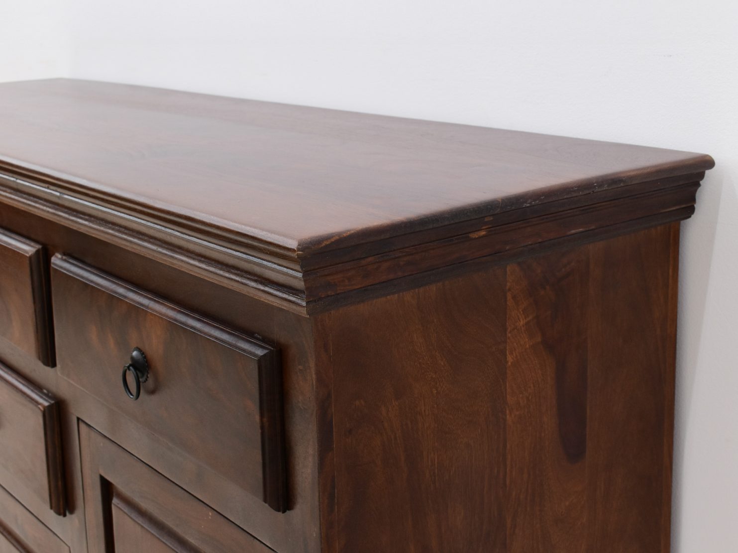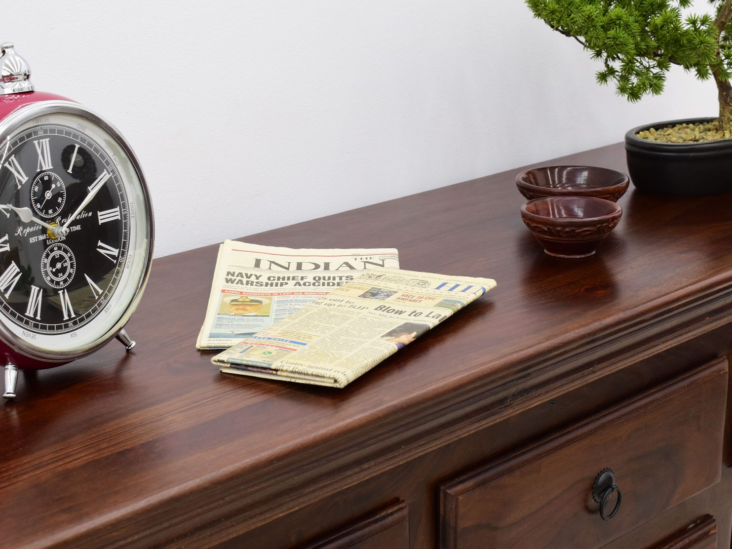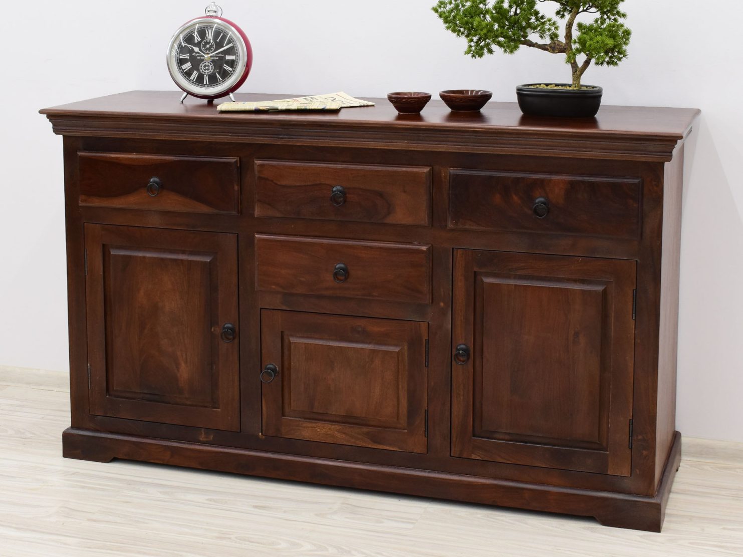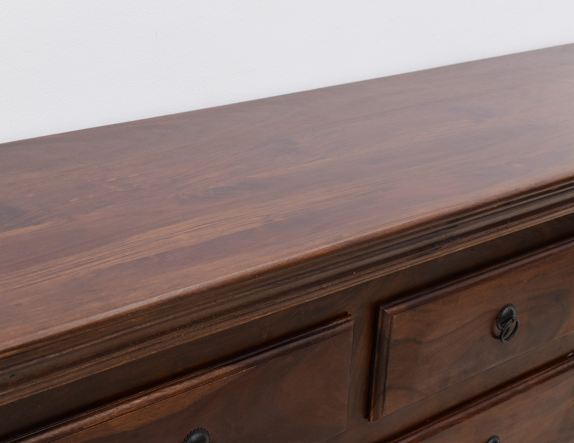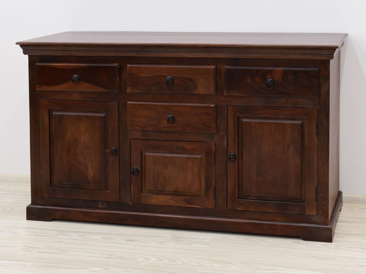Funkcjonalna komoda kolonialna, która posiada trzy pojemne wnęki oraz cztery szuflady umieszczone tuż pod masywnym frezowanym blatem. Fronty szuflad nie posiadają żadnych zdobień, natomiast fronty wnęk mają subtelny frez dookoła. Całość stanowi bardzo skromny, klasyczny mebel, którego ozdobą samą w sobie jest niezwykle trwałe i charakterystyczne drewno palisandru. Komoda wykonana w 100% z litego drewna palisandru indyjskiego. Mebel ten znajdzie swoje miejsce w każdym salonie, sypialni lub przedpokoju. Ze względu na ręczne wykonanie, przez indyjskich rzemieślników, każdy okaz jest unikatowy.