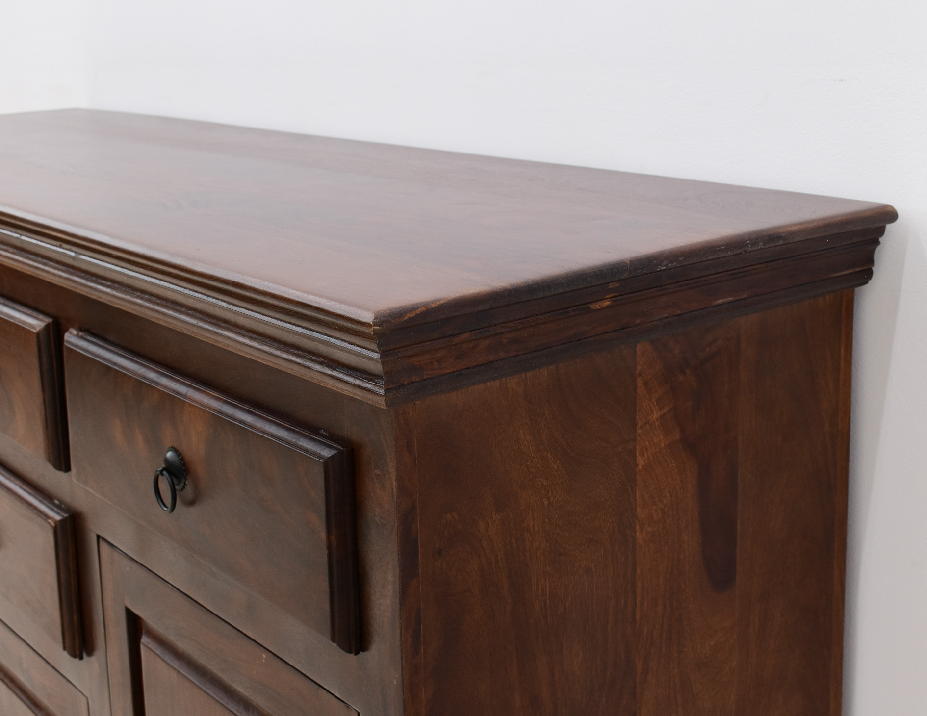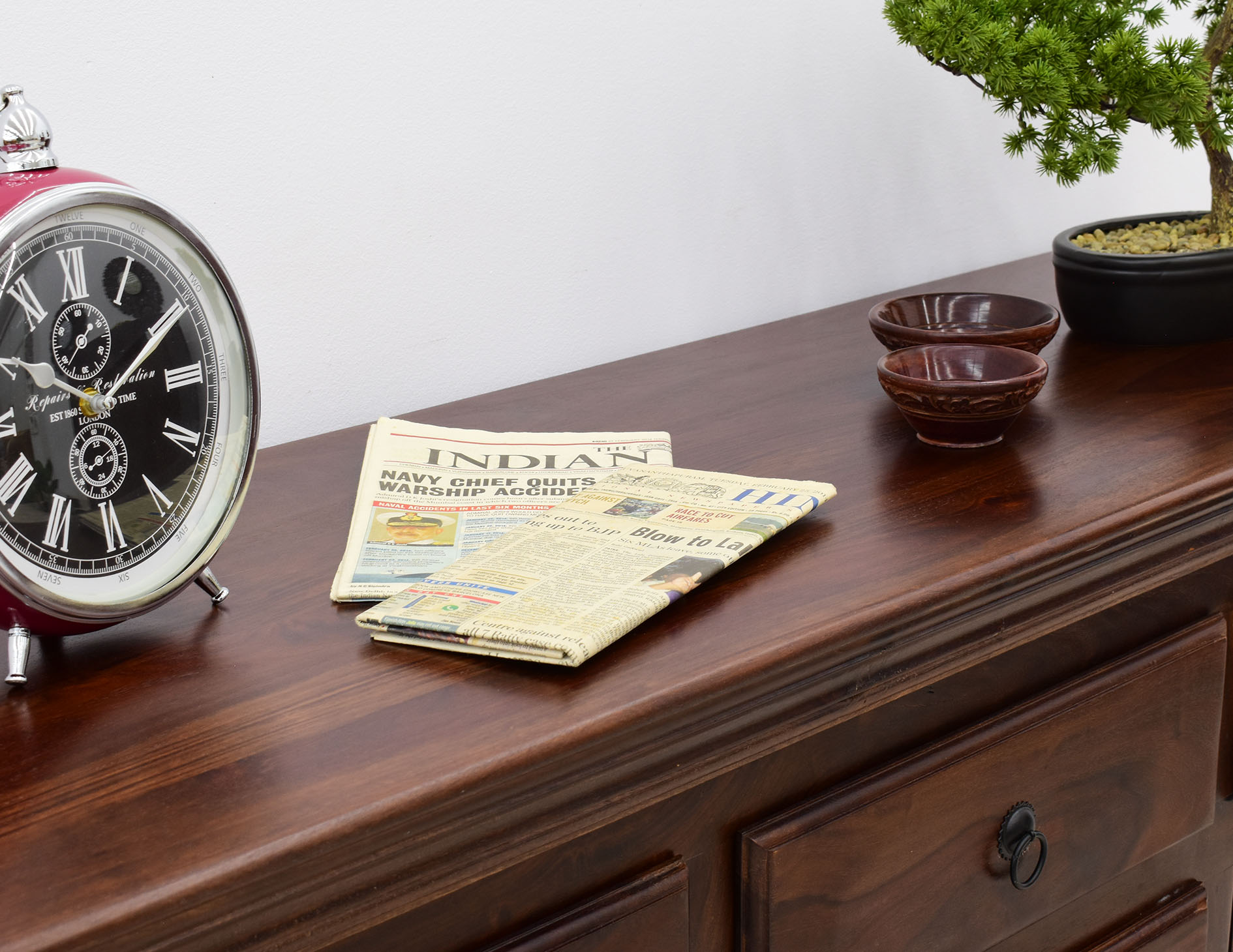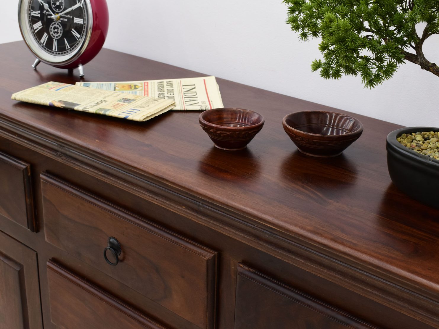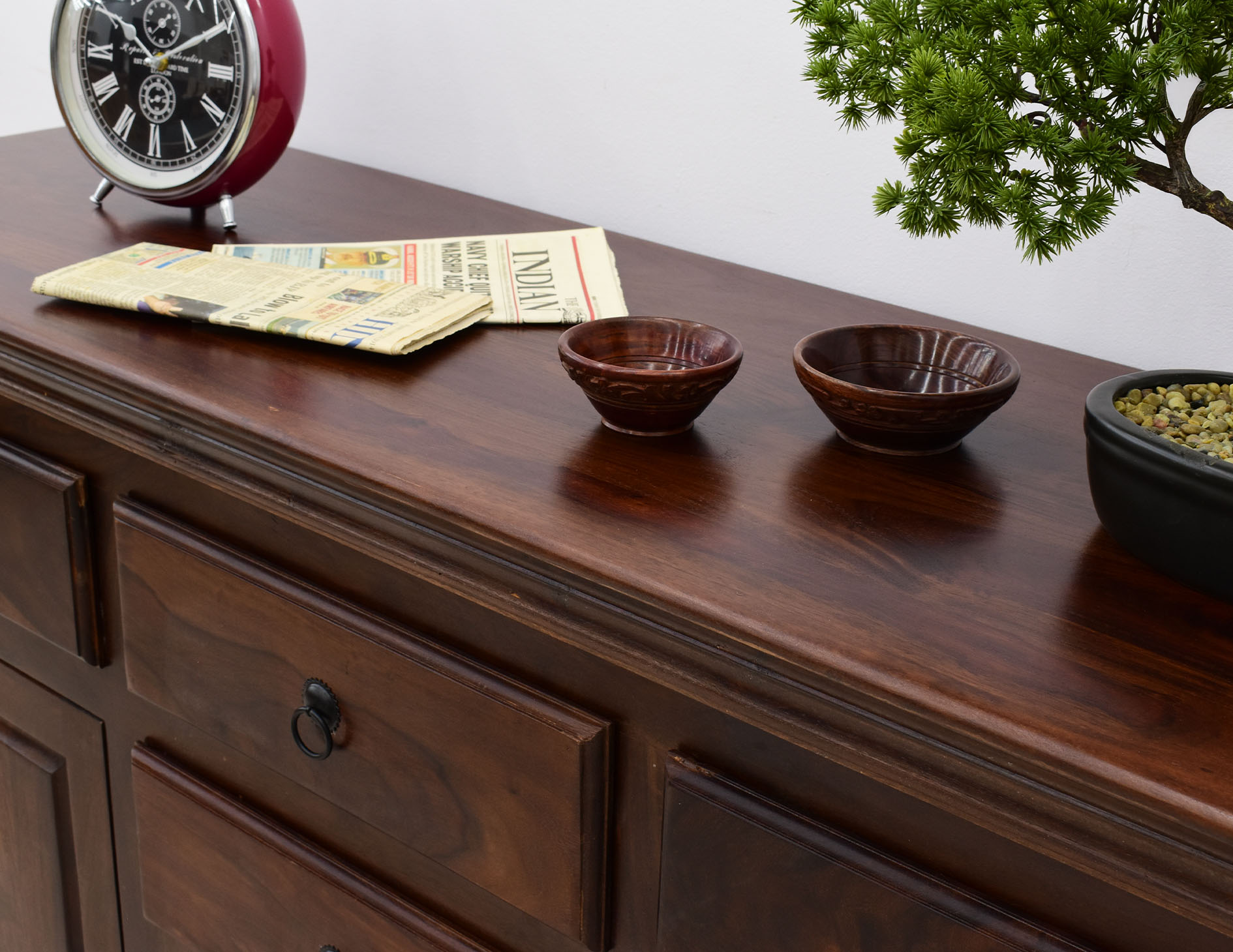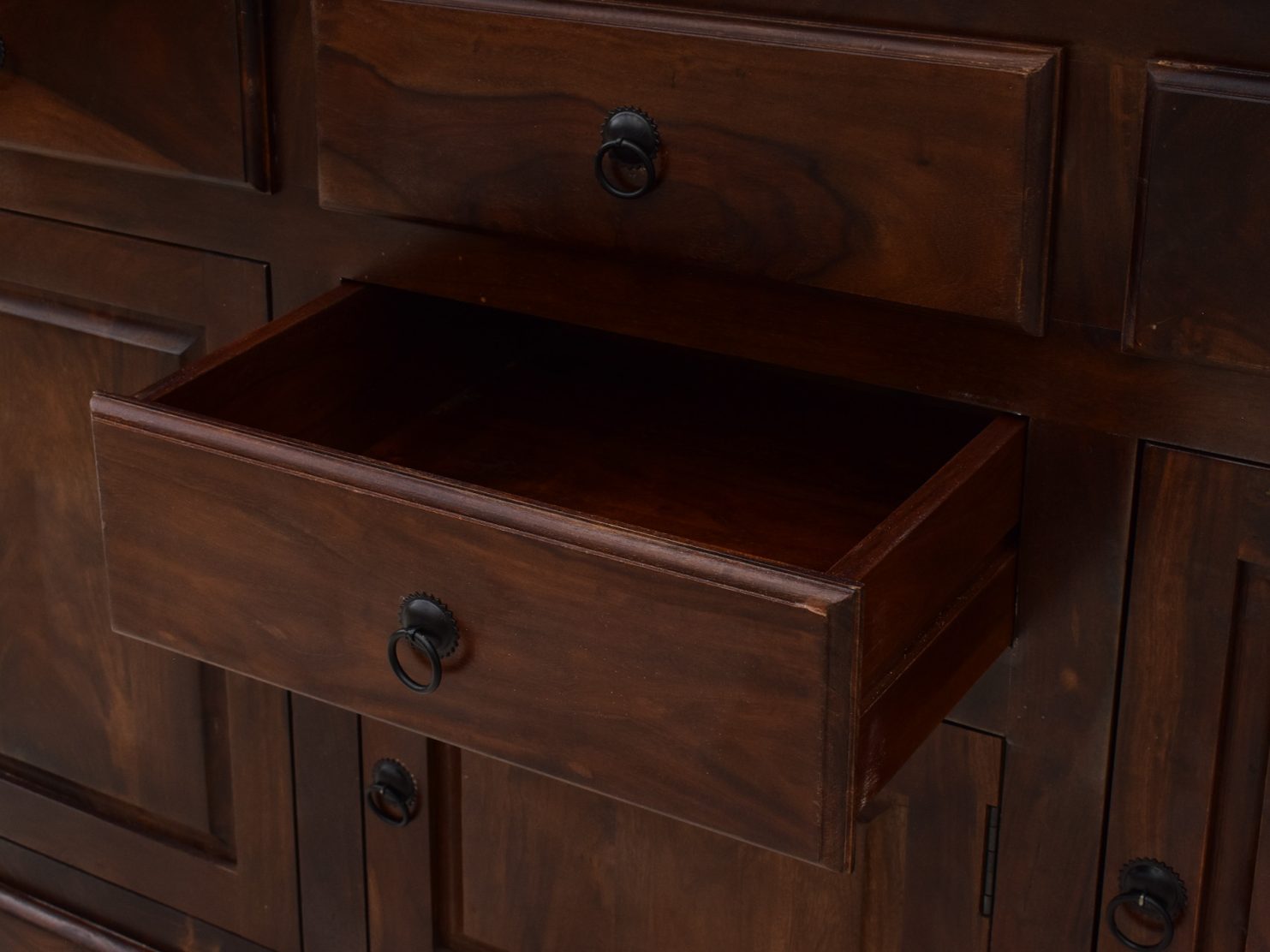 Funkcjonalna komoda kolonialna, która posiada trzy pojemne wnęki oraz cztery szuflady umieszczone tuż pod masywnym frezowanym blatem. Fronty szuflad nie posiadają żadnych zdobień, natomiast fronty wnęk mają subtelny frez dookoła. Całość stanowi bardzo skromny, klasyczny mebel, którego ozdobą samą w sobie jest niezwykle trwałe i charakterystyczne drewno palisandru. Komoda wykonana w 100% z litego drewna palisandru indyjskiego. Mebel ten znajdzie swoje miejsce w każdym salonie, sypialni lub przedpokoju. Ze względu na ręczne wykonanie, przez indyjskich rzemieślników, każdy okaz jest unikatowy.