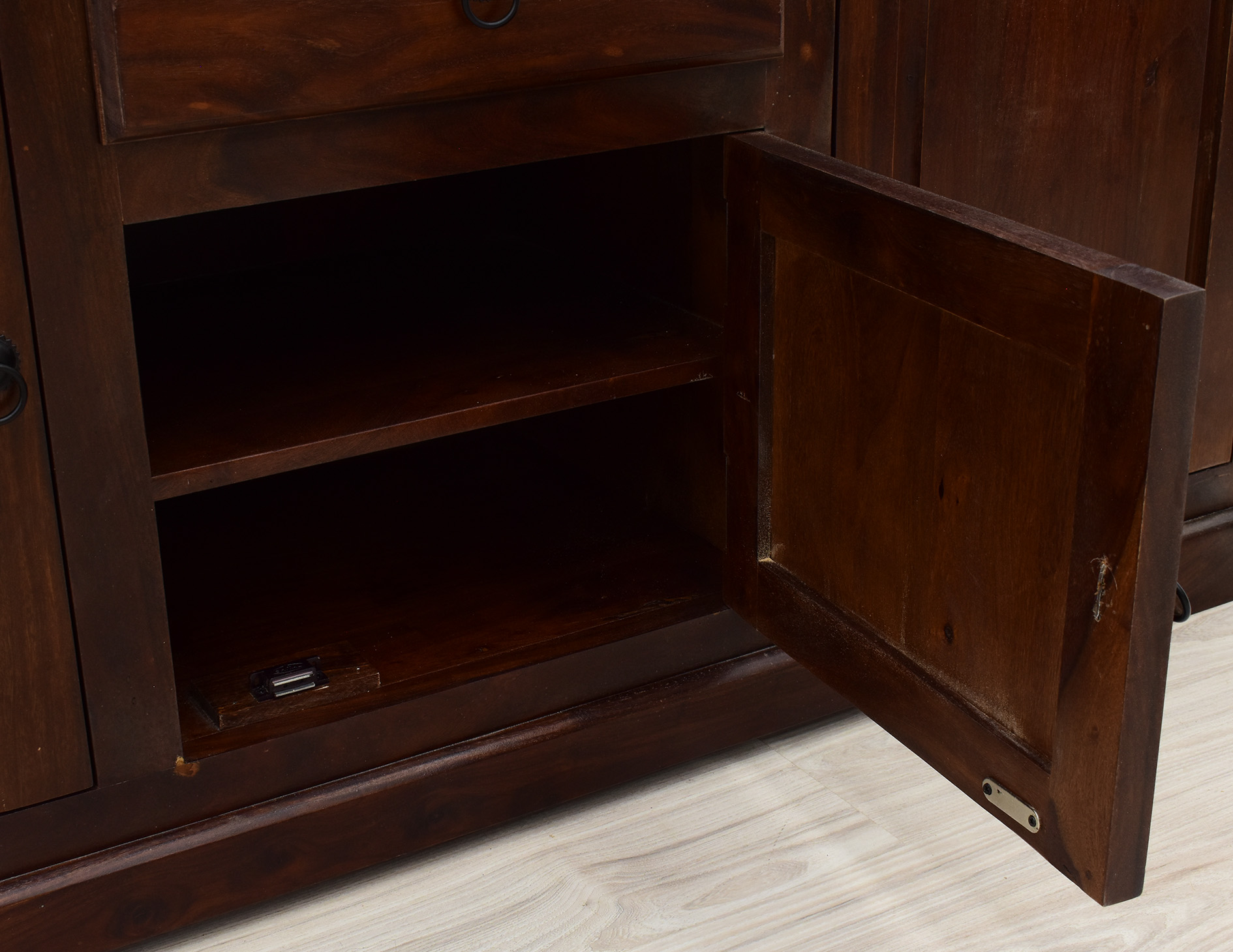 Komoda kolonialna z palisandru – trzydrzwiowa z szufladami i półkami