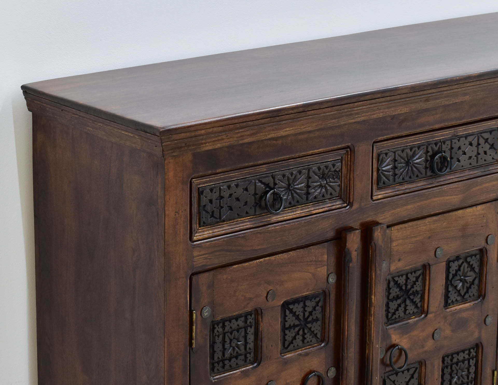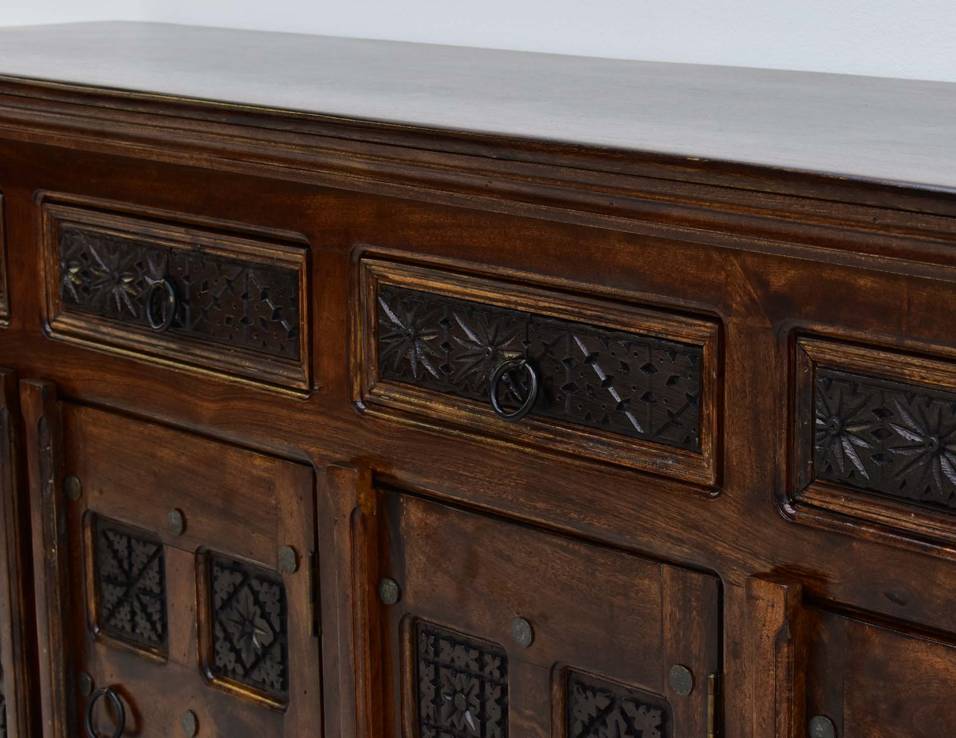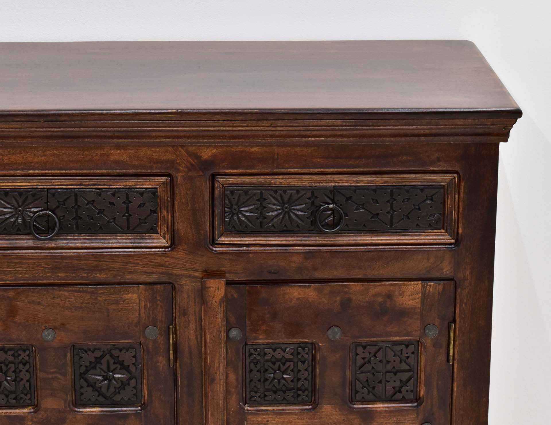 Masywna komoda o wymiarach 180/45/90cm została wytworzona ręcznie przez indyjskich rzemieślników. Do jej wykonania użyto w 100% lite drewno akacji indyjskiej. Posiada cztery wnęki schowane za ręcznie rzeźbionymi, wybarwionymi na ciemniejszy odcień, frontami oraz cztery zdobione tym samym motywem szuflady. Jest to mebel stworzony do dużych pomieszczeń, których aranżacja podąża w kierunku orientalnej stylizacji. Posiada wyraźnie zarysowaną podstawę oraz masywny, frezowany blat. Swą obecnością w każdym salonie czy sypialni wprowadzi niezwykły pierwiastek egzotyki.