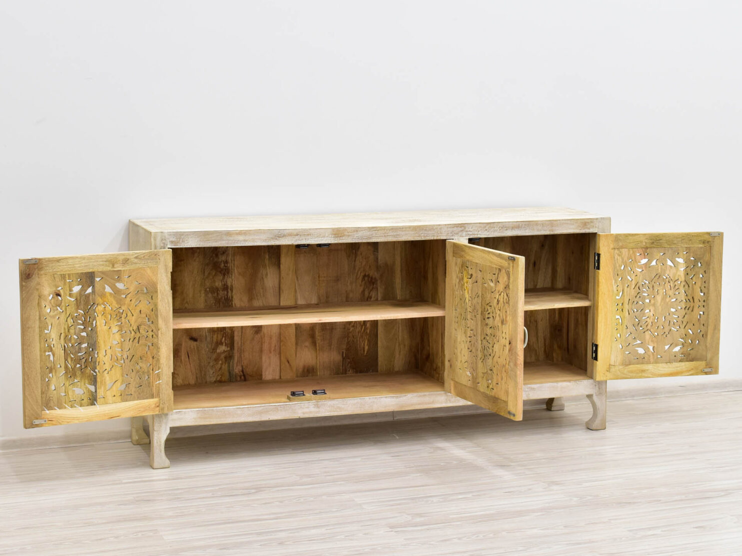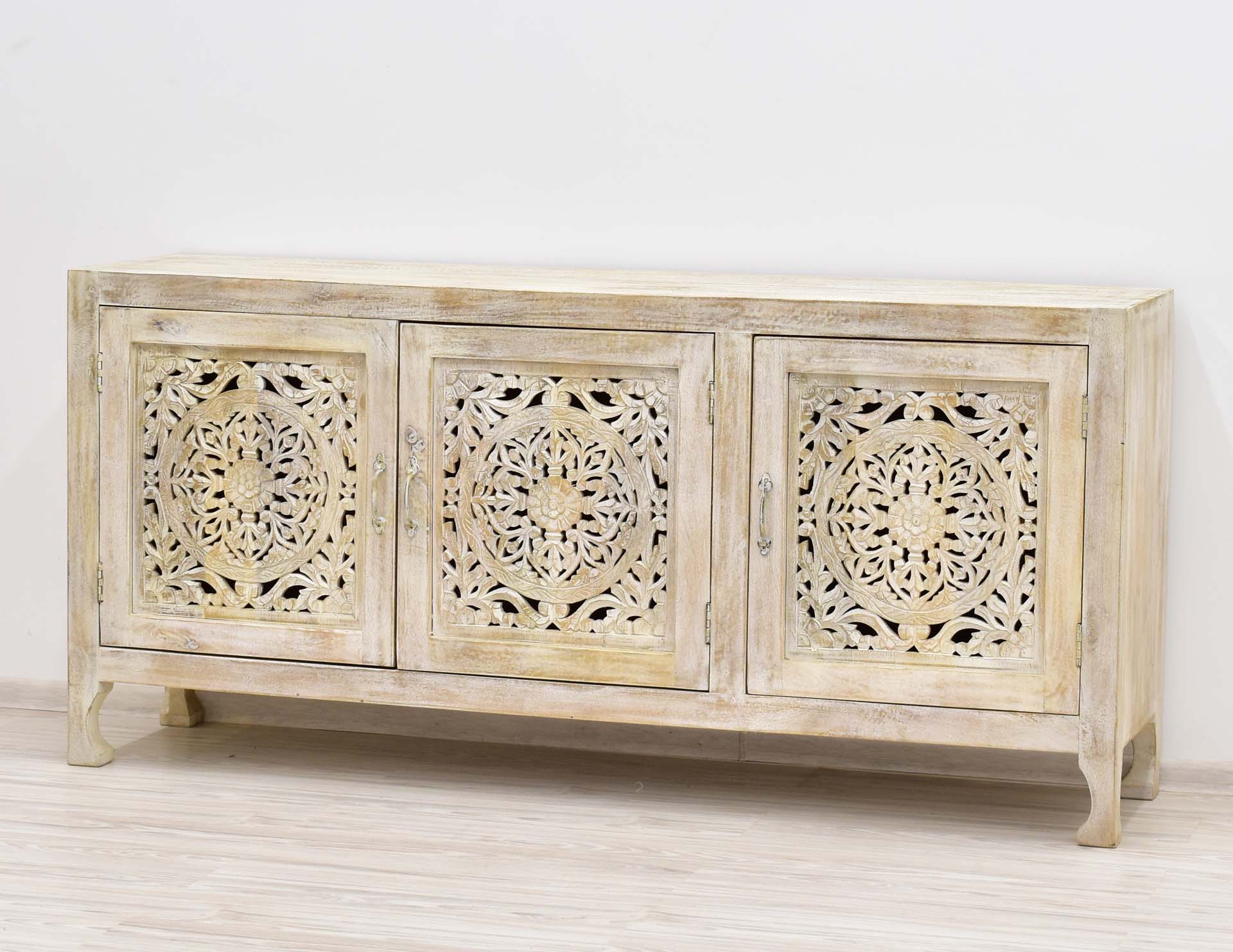 Stylowa komoda utrzymana w stylu kolonialnym. Mebel ręcznie wykonany z litego drewna mango w hinduskiej manufakturze, wyposażony w pojemne wnęki umiejscowione za 3 drzwiczkami.