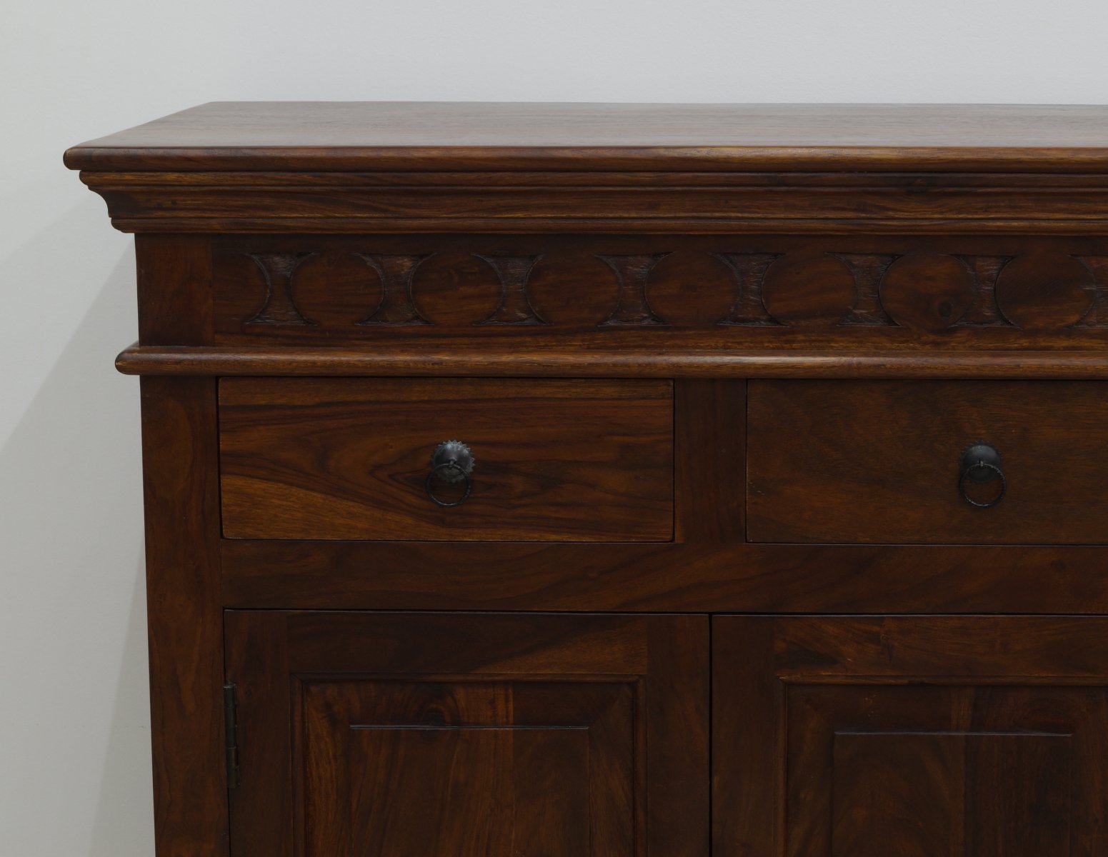 Pojemna komoda kolonialna w stylu klasycznym. Jest to solidnie wykonany mebel, który ze względu na swoją trwałość oraz klasyczny ton sprawdzi się w każdym eleganckim wnętrzu. Komoda została stworzona w 100% z litego drewna palisandru indyjskiego, zwyczajowo zwanego drzewem różanym. Posiada on charakterystyczne słoje, widoczne na każdej płaszczyźnie tego mebla. Całość wybarwiono na ciemnobrązowy kolor. Posiada cztery pojemne wnęki oraz osiem szuflad. Charakterystyczny dla tej komody jest rzeźbiony ornament, umieszczony tuż pod frezowanym wieńcem blatu.