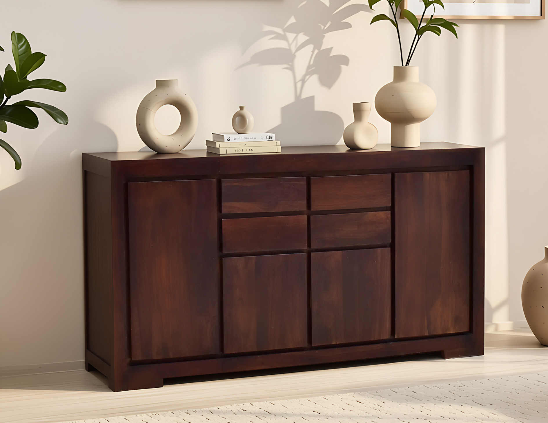 Pojemna komoda stworzona z niezwykle trwałego, w 100% litego, drewna. Meble wykonane z palisandru indyjskiego posiadają unikatowe, niepowtarzalne wzory słojów. Przykładem jest owa nowoczesna, ciemno-brązowa komoda kolonialna z wnękami i szufladami, która utrzymana w stylu modernistycznym, bez żadnych zdobień tylko z całkowicie płaskimi frontami, eksponuje niezwykły charakter tego naturalnego surowca. Komoda posiada dwie małe i dwie duże wnęki schowane za drzwiczkami. Ponadto wyposażona została w cztery praktyczne szuflady. Całość bez standardowych uchwytów, utrzymana w ciemnym odcieniu brązu. . Zobacz również nasze dekoracje indyjskie, które doskonale wpasują się w klimat przedstawionej komody.