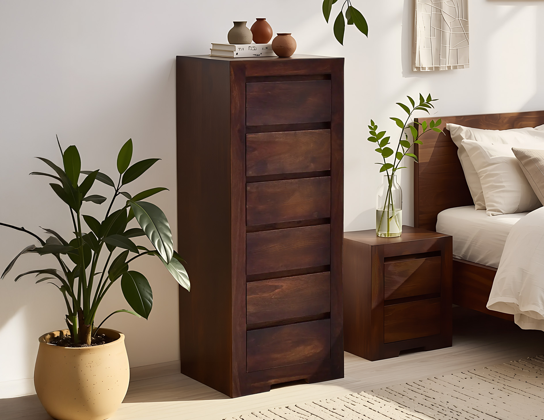 Komoda indyjska w formie słupka z sześcioma szufladami. Została stworzona w Indiach w 100% z litego drewna. Charakterystyczne, nieregularne słoje palisandru indyjskiego dodają niezwykłego uroku płaskim frontom szuflad. Jest to mebel, który nie posiada typowych indyjskich uchwytów. Ich rolę przejęły profilowane wnęki między szufladami, które umożliwiają ich otwieranie. Komoda kolonialna w kolorze ciemny brąz, minimalistyczna, utrzymana w stylistyce nowoczesnej.