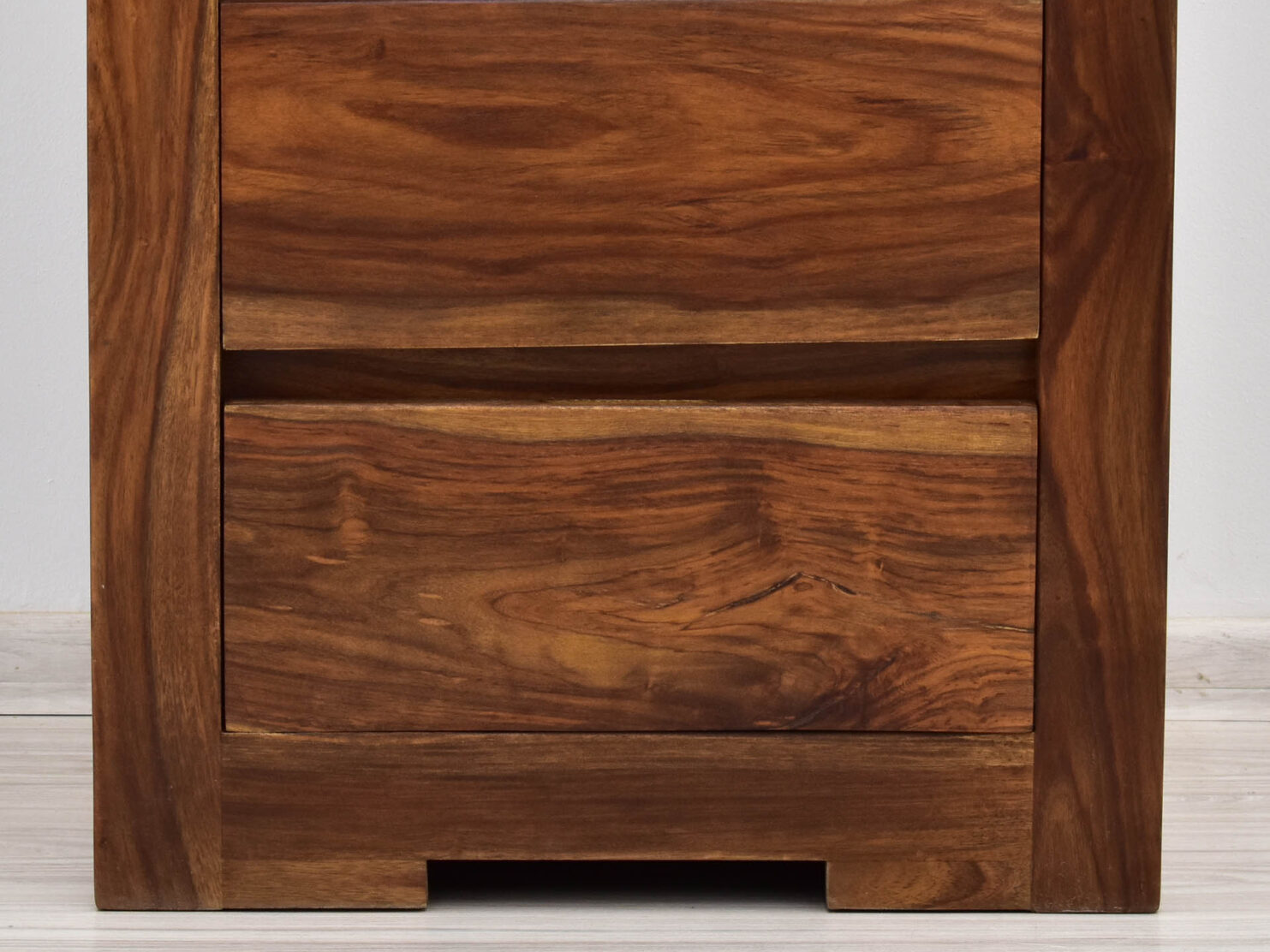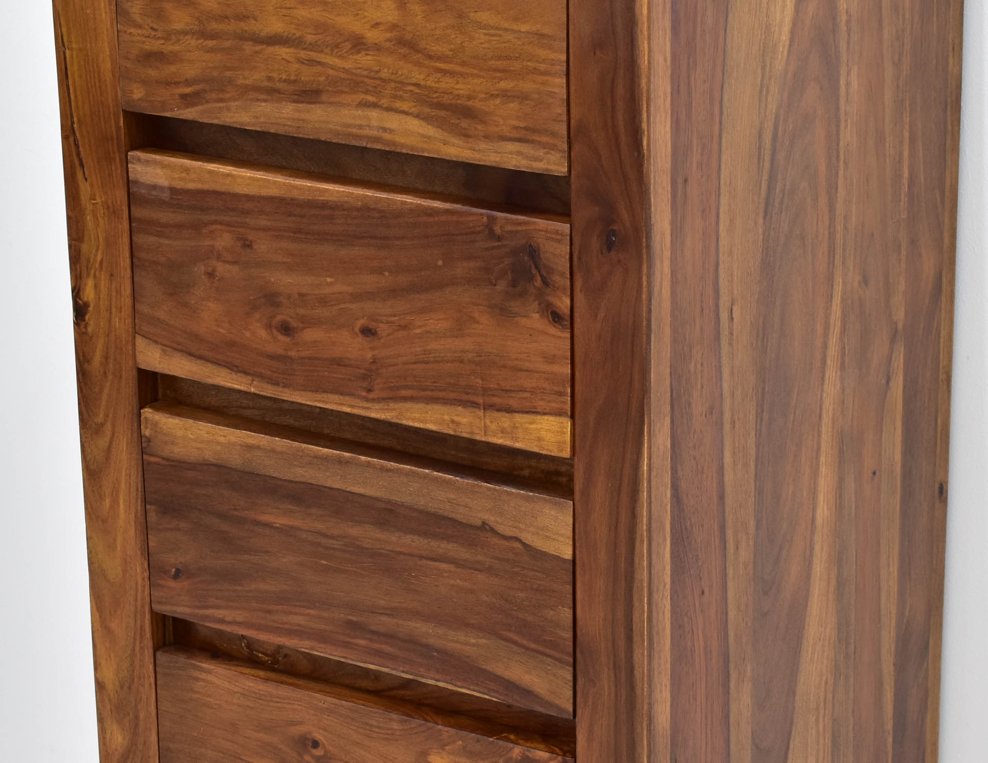 Komoda kolonialna w kształcie wysokiego na 130 cm słupka z sześcioma szufladami. Jest meblem masywnym, nieozdobionym, bez żadnych zbędnych detali, za uchwyty służą wnęki między frontami. Całość stworzona w 100% z litego drewna palisandru indyjskiego. Zabejcowana na kolor jasnobrązowy wpisze się doskonale w każde wnętrze w stylu nowoczesnym.