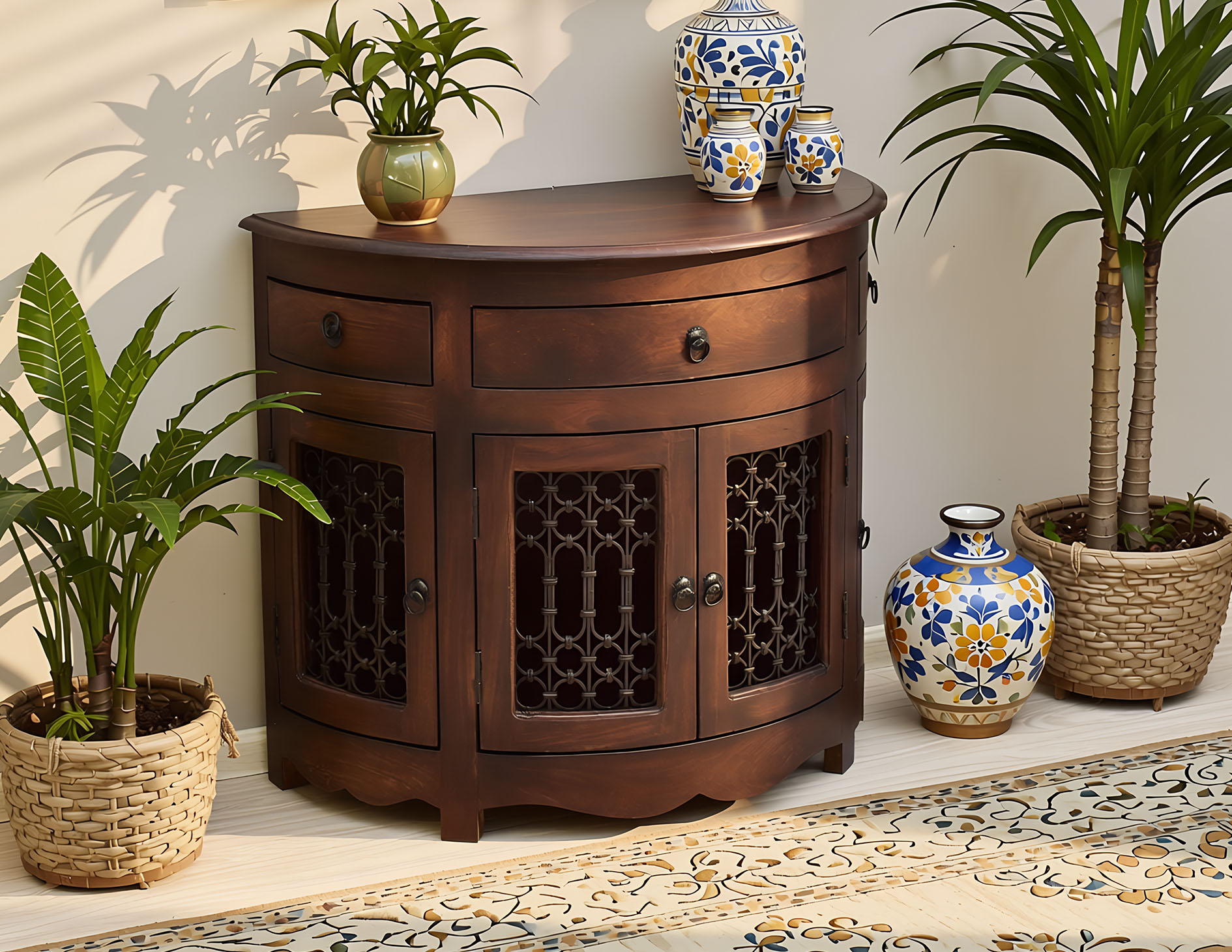 Komoda kolonialna w kształcie półkola została wykonana w 100% z litego drewna palisandru indyjskiego. Jest to niesztampowe rozwiązanie, które stanowić może unikatową ozdobę w salonie. Posiada trzy szuflady oraz pojemną wnękę ukrytą za czterema drzwiczkami osadzonymi dookoła mebla. Drzwiczki zostały ozdobione unikatowym motywem z metaloplastyki. Całość posiada delikatne, metalowe uchwyty. Ten egzotyczny mebel oparty został na niepozornych nóżkach.
