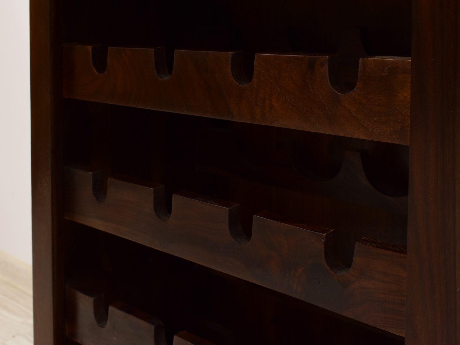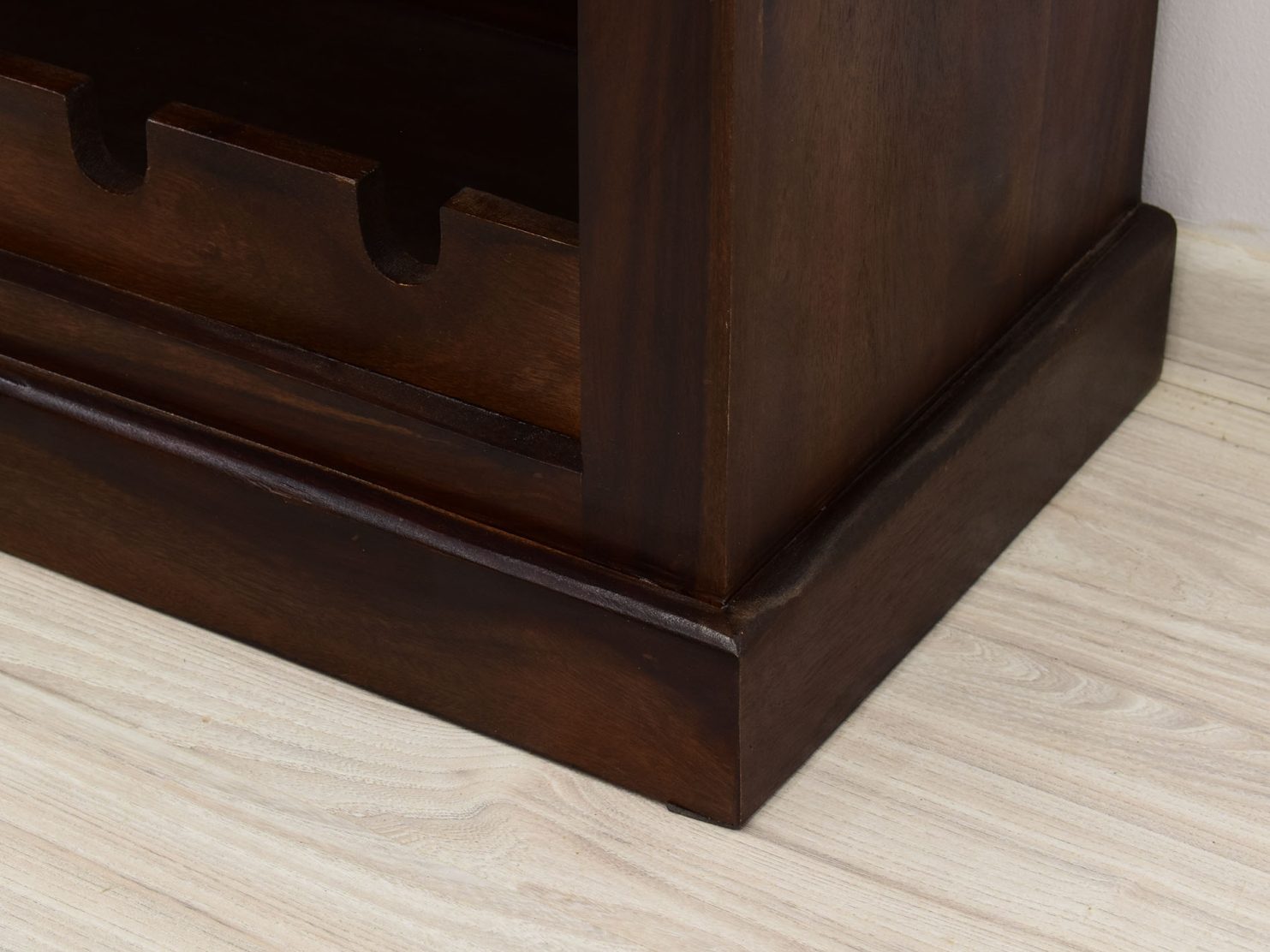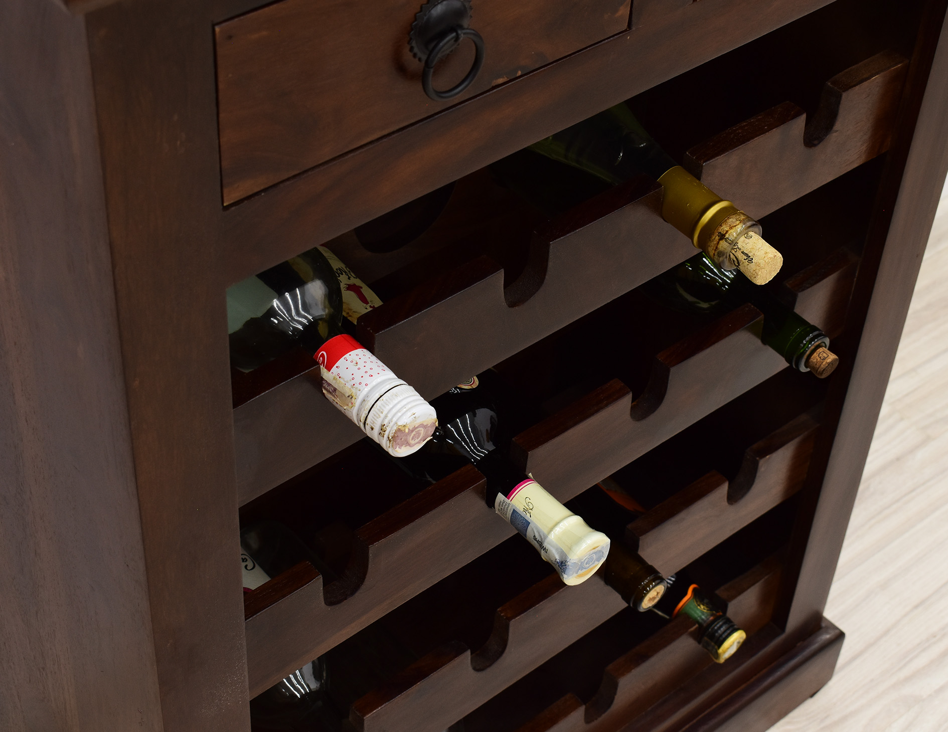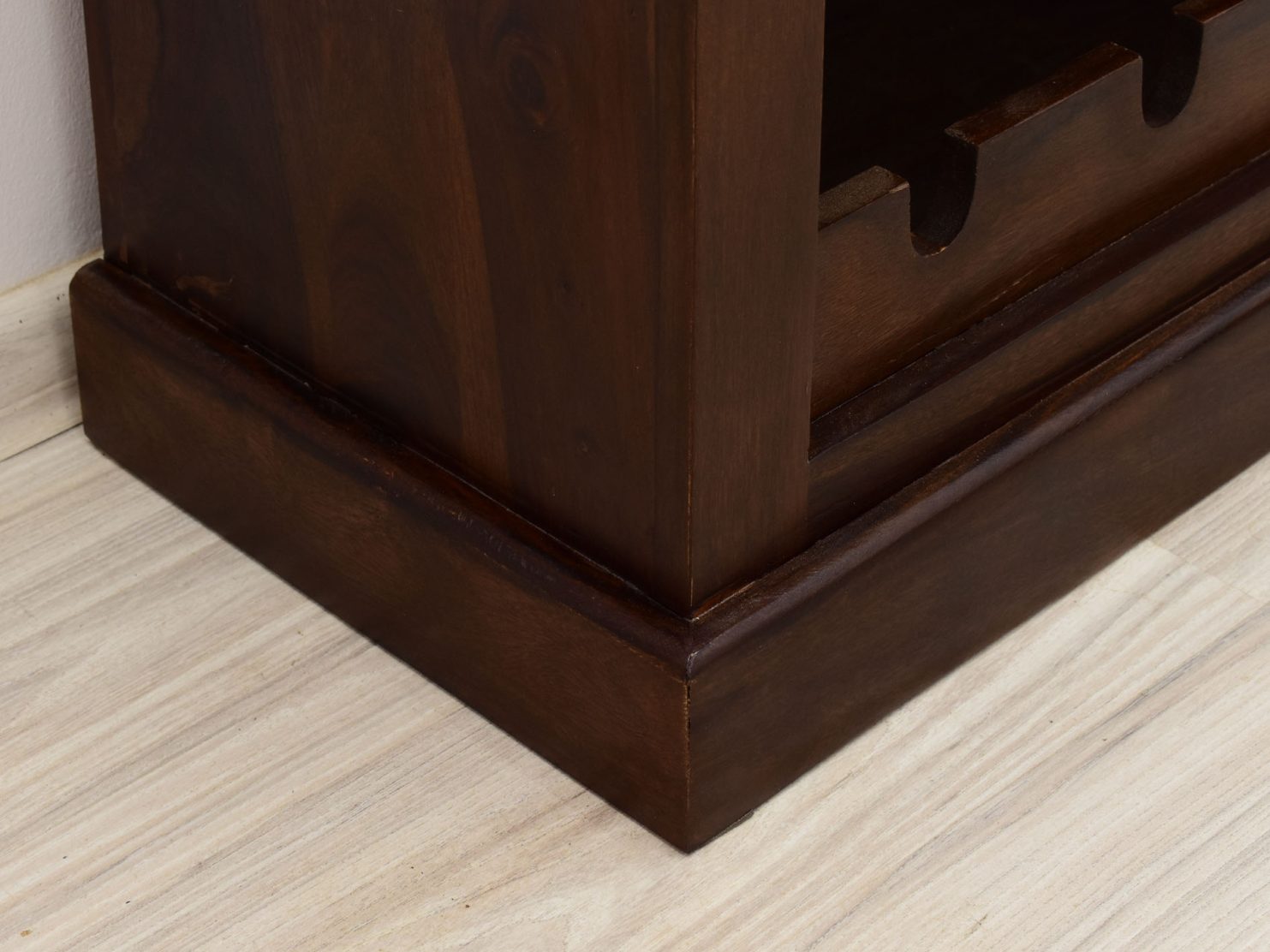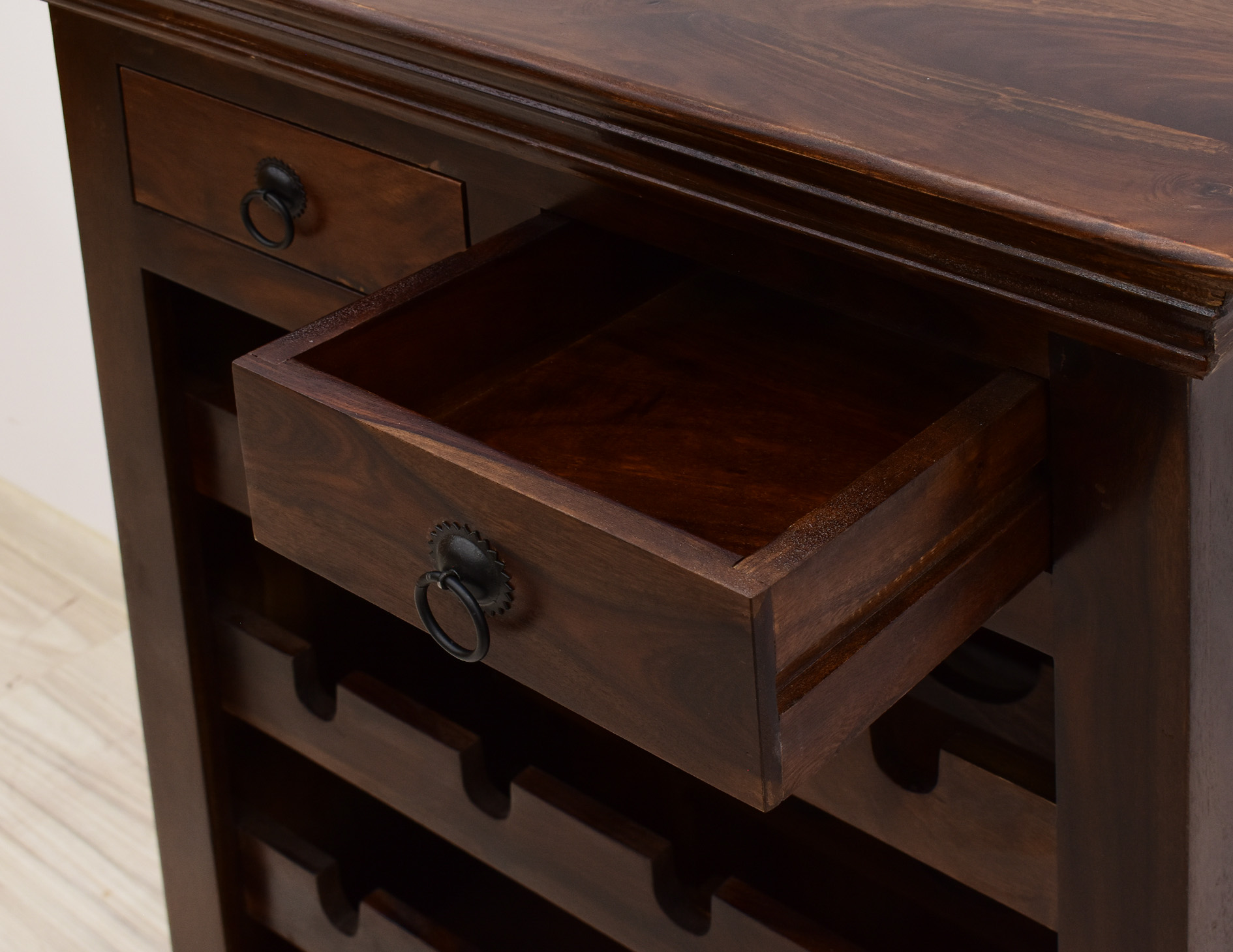 Szafka indyjska w klasycznej odsłonie, stworzona z egzotycznego drzewa różanego zwanego palisandrem indyjskim. Mebel ten powstał ze 100% litego drewna i stanowi masywną i solidna konstrukcję. Szafka posiada dwanaście profilowanych miejsc na trunki oraz dwie poręczne szufladki na górze. Eleganckiego charakteru dodaje masywna podstawa oraz frezowany od dołu blatu wieniec. Taki mebel stanie się wyjątkową ozdobą w funkcjonalnie urządzonym salonie.