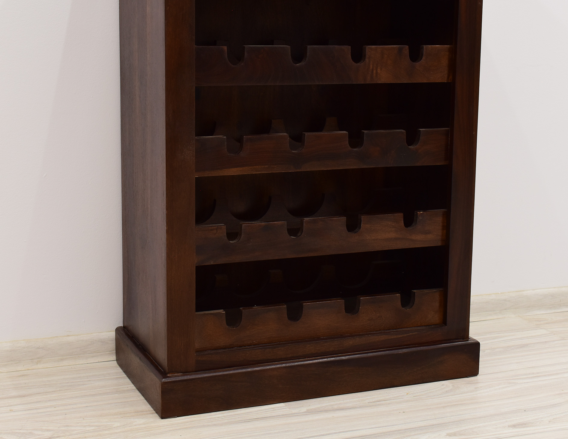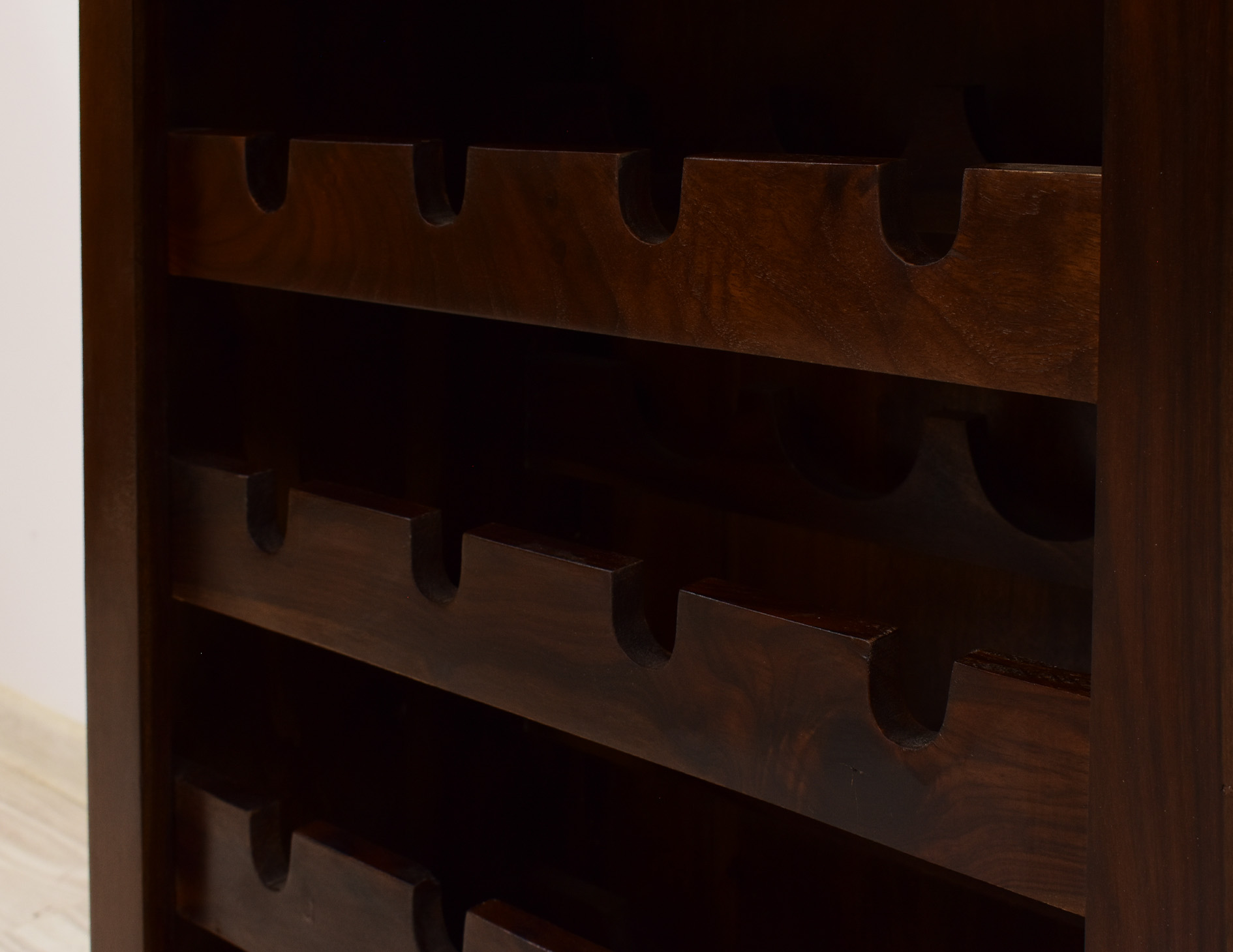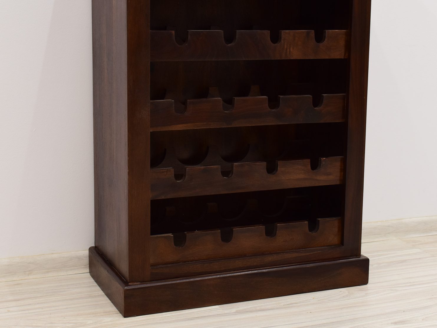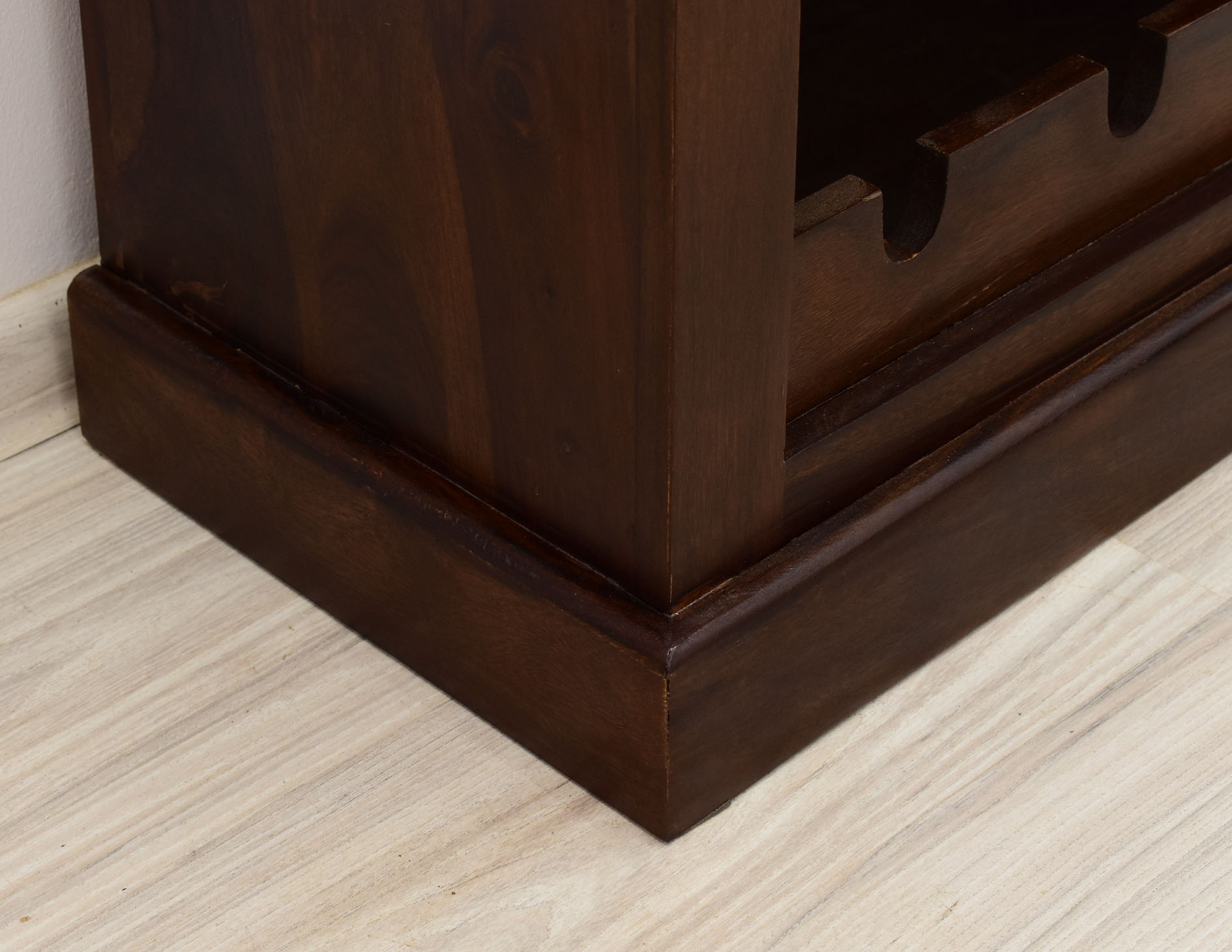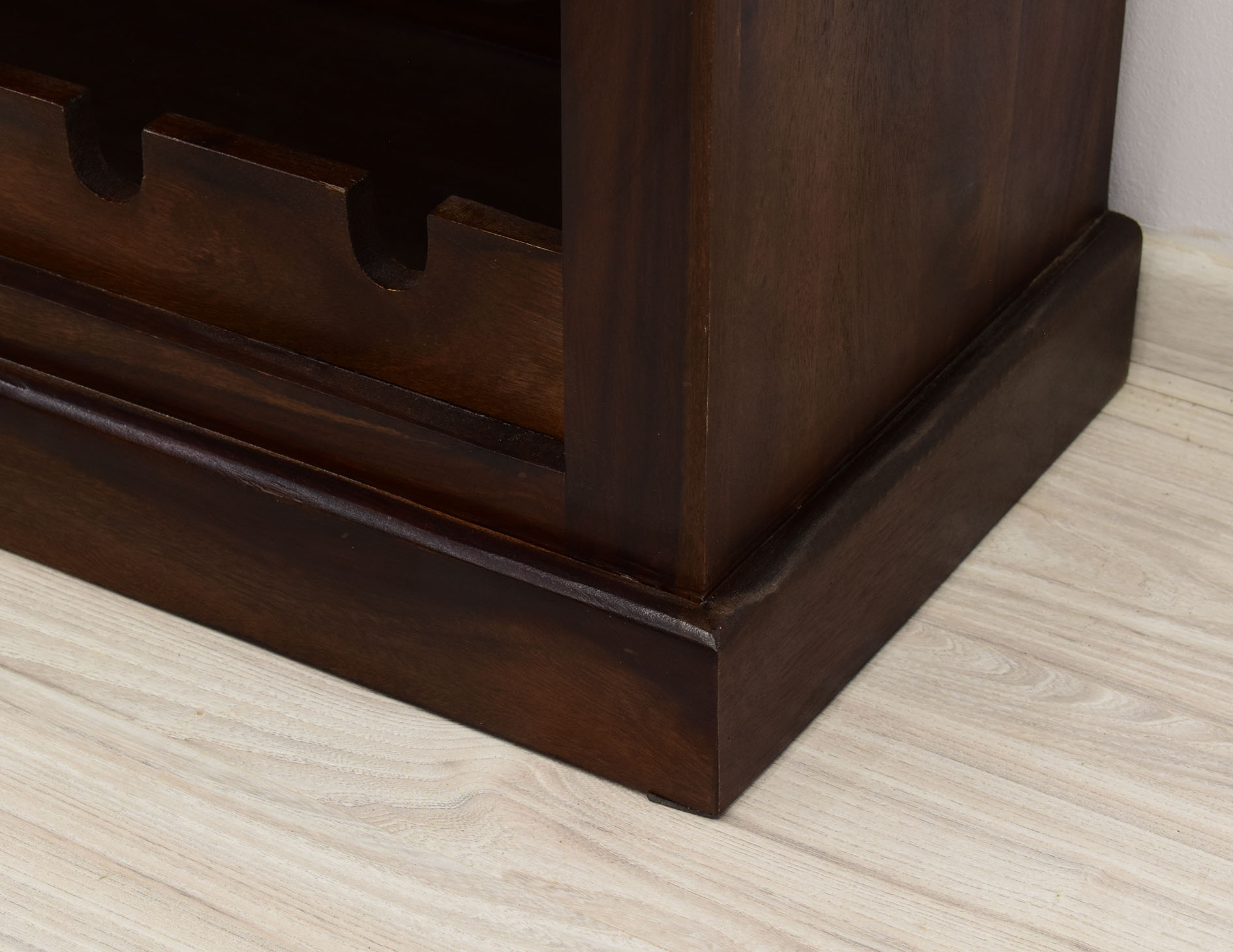 Szafka indyjska w klasycznej odsłonie, stworzona z egzotycznego drzewa różanego zwanego palisandrem indyjskim. Mebel ten powstał ze 100% litego drewna i stanowi masywną i solidna konstrukcję. Szafka posiada dwanaście profilowanych miejsc na trunki oraz dwie poręczne szufladki na górze. Eleganckiego charakteru dodaje masywna podstawa oraz frezowany od dołu blatu wieniec. Taki mebel stanie się wyjątkową ozdobą w funkcjonalnie urządzonym salonie.