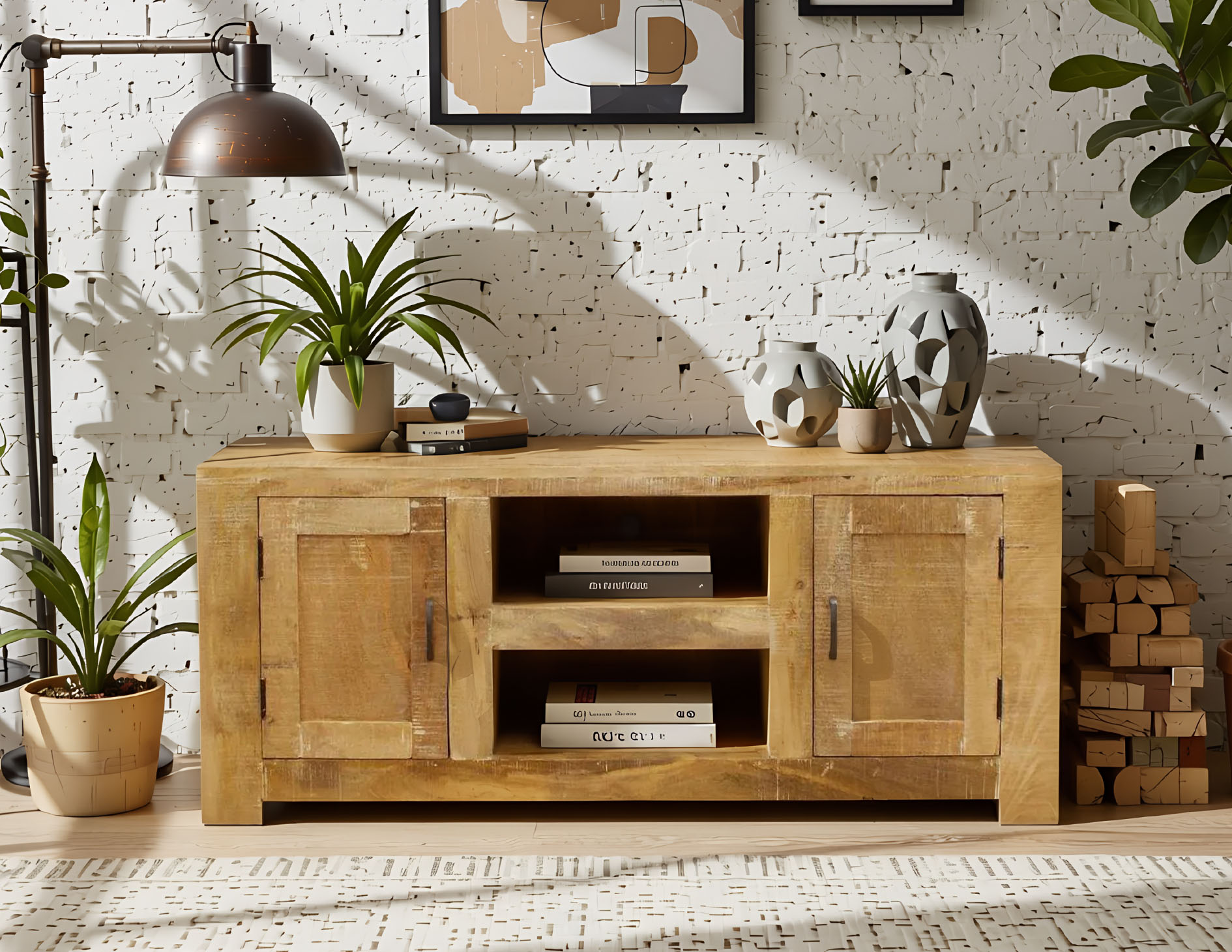 Niewielka komoda na sprzęt RTV stworzona z charakterystycznego drewna mango. Jest to mebel zbudowany w 100% z litego drewna, w jego naturalnym kolorze. Owa szafka pod telewizor wyposażona została w dwie wnęki na sprzęt pośrodku mebla oraz cztery umieszczone za drzwiczkami. Całość jest zaprojektowana i wykonana w stylu nowoczesnym, gdzie dąży się do minimalizmu, jak najprostszej formy, a liczy się funkcjonalność mebla.