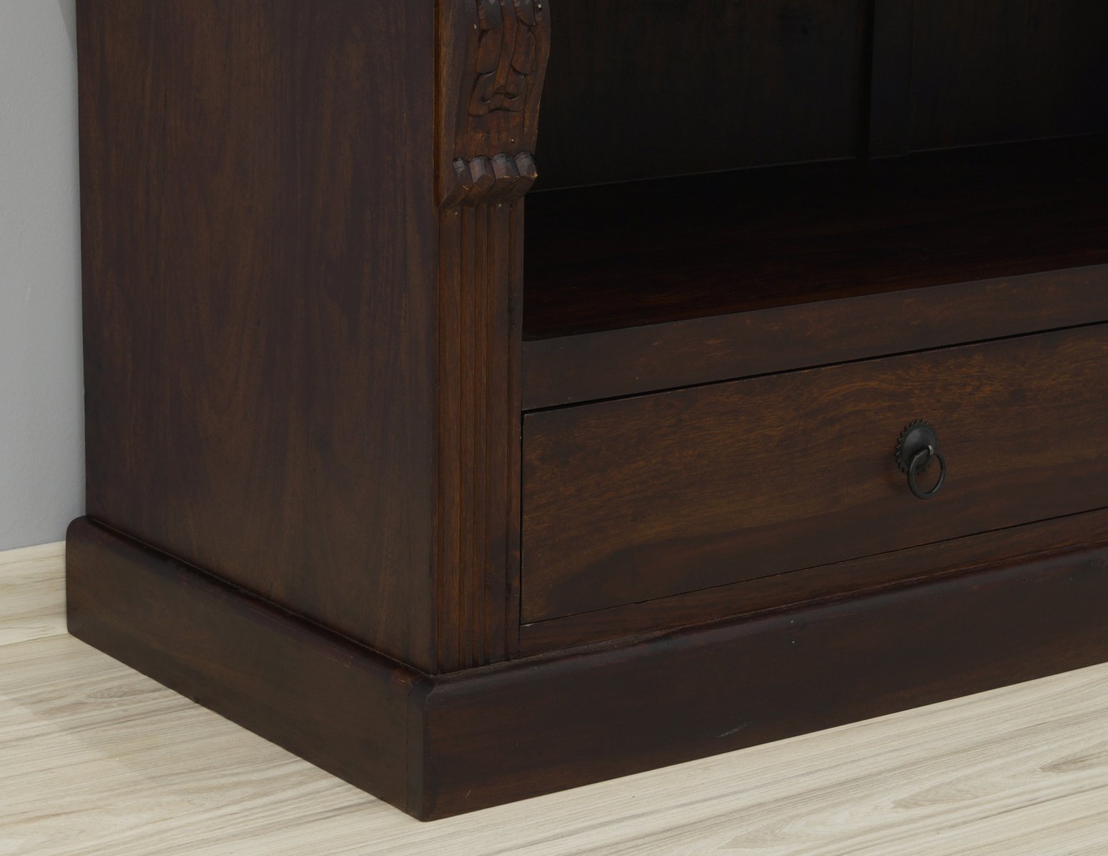 Niewielkich rozmiarów komoda RTV w ciemnym odcieniu brązu. Została wykonana z palisandru indyjskiego, w 100% z litego drewna. Posiada praktyczną wnękę na sprzęt RTV oraz dwie szuflady ulokowane poniżej. Stworzona przez indyjskich rzemieślników, jest niepowtarzalnym rękodziełem. Ozdobiona została rzeźbionymi gzymsami po bogach, frezowanym wieńcem oraz delikatnymi metalowymi uchwytami. Będzie unikatowym meblem w salonie urządzonym w stylu zarówno klasycznym jak i kolonialnym.