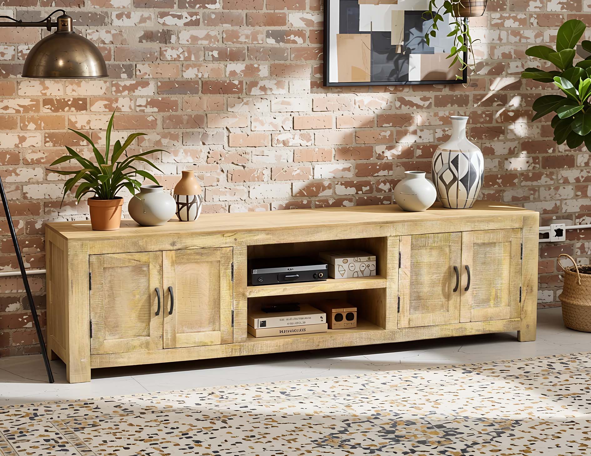 Komoda RTV wykonana w stylu kolonialnym w zgodzie z popularnym nurtem Loft. Szafka pod telewizor została ręcznie wykonana w hinduskiej manufakturze z litego drewna egzotycznego mango. 2-metrowa komoda z dużą powierzchnią użytkową blatu daje wiele możliwości aranżacyjnych. Do tego dwie półki i dwie wnęki z półkami znajdujące się za drzwiczkami po bokach mebla pozwalają na swobodne umiejscowienie sprzętu RTV.