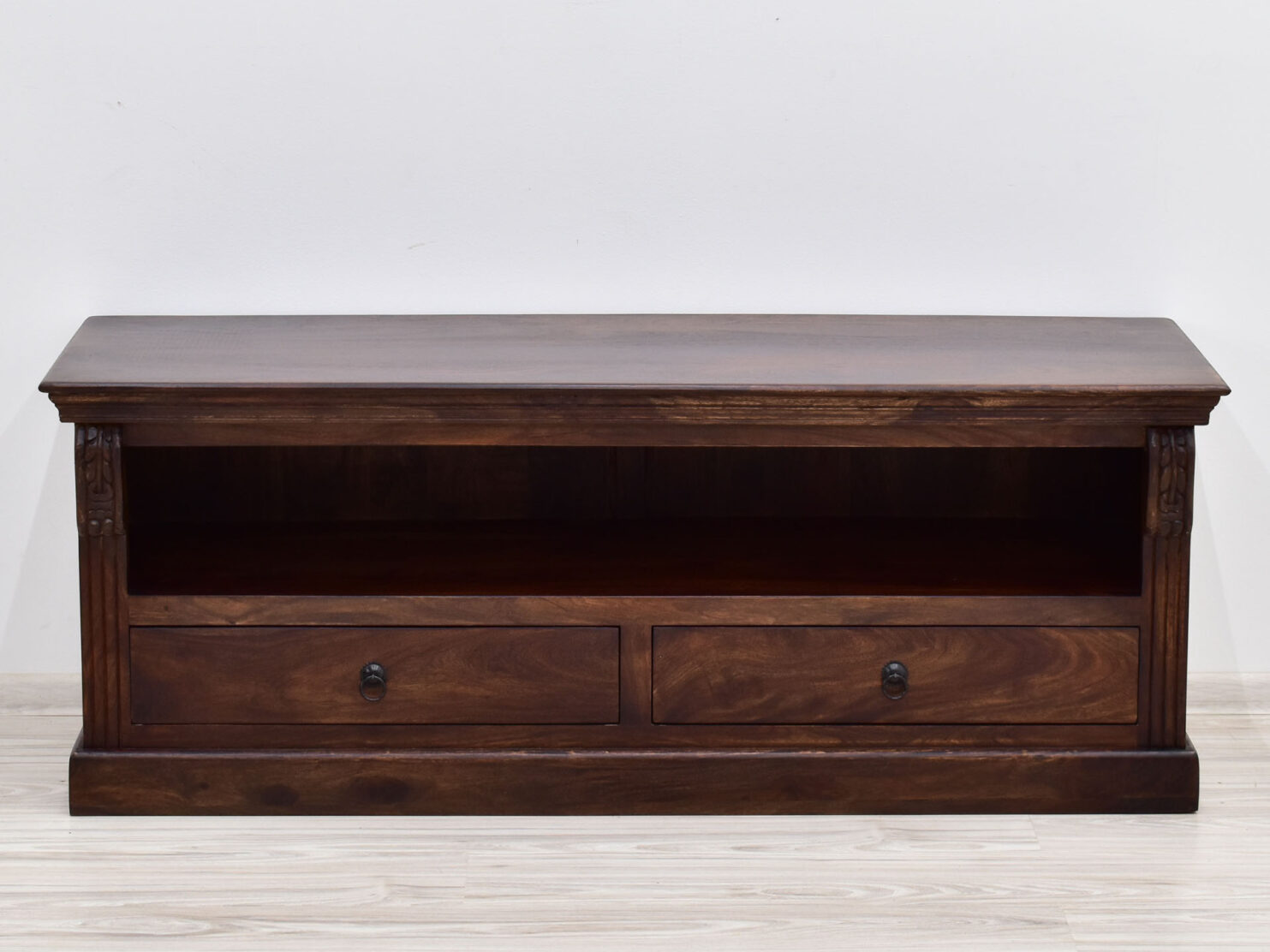 Solidnie wykonana, w 100% z litego drewna palisandru indyjskiego, funkcjonalna szafka pod telewizor. Posiada dwie szuflady oraz pojemną wnękę na sprzęt RTV. Fronty szuflad bez zdobień eksponują piękno egzotycznego drewna. Uchwyty stanowią bardzo delikatny akcent dopełniający całości. Dodatkowym orientalnym akcentem komody RTV są, umieszczone po bokach komody, ręcznie rzeźbione gzymsy. Poza tym, mebel ten został zamknięty w bardzo prostej bryle i dlatego wpisze się w każdy klasyczny, ale i nowoczesny kącik wypoczynkowy.