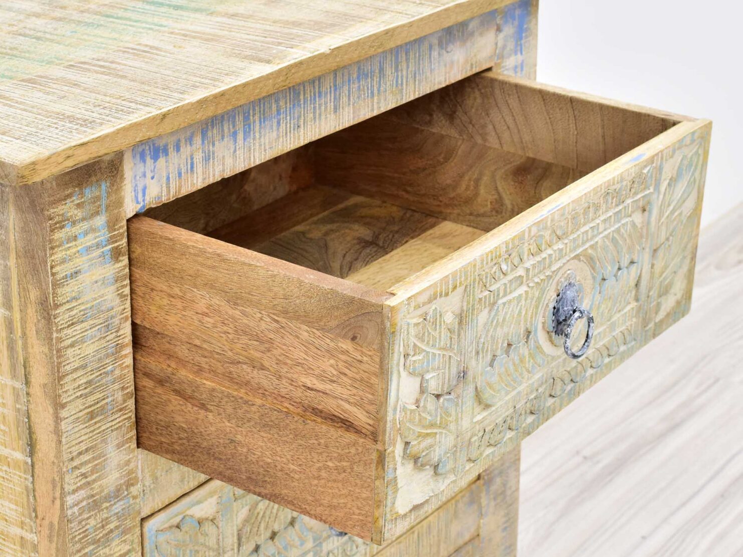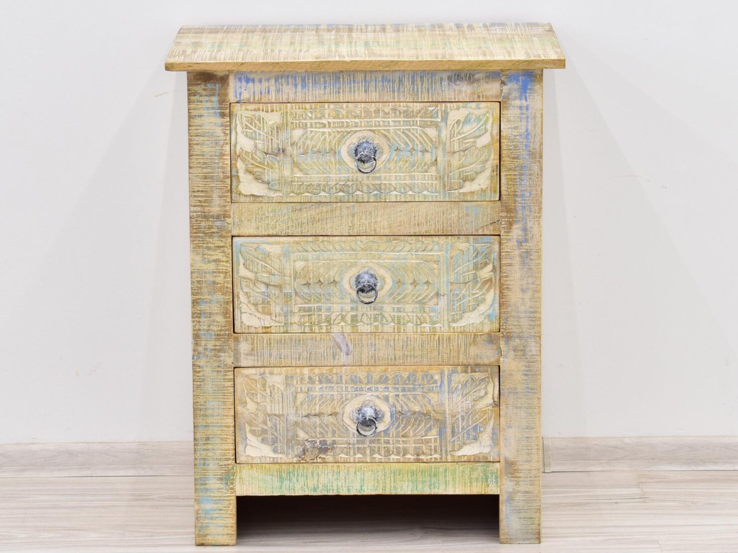 Indyjska komoda, która została stworzona w jednej z hinduskich manufaktur, w miejscu gdzie spod ręki tamtejszych rzemieślników wychodzą okazy niepowtarzalne. Całość wytworzona w 100% z litego drewna mango. Drewna o charakterystycznej strukturze, które zostało poddane zabiegom wybarwienia na pastelowe kolory, a następnie przetarcia w celu uzyskania efektu postarzenia. Ponadto fronty trzech praktycznych szuflad posiadają misterne, ręczne rzeźbienia, nadające tej małej komodzie iście orientalnego charakteru. Szafka nocna z szufladami w stylu Shabby Chic to mebel bardzo oryginalny, który na pewno zaznaczy swoją obecność w aranżowanej przestrzeni.