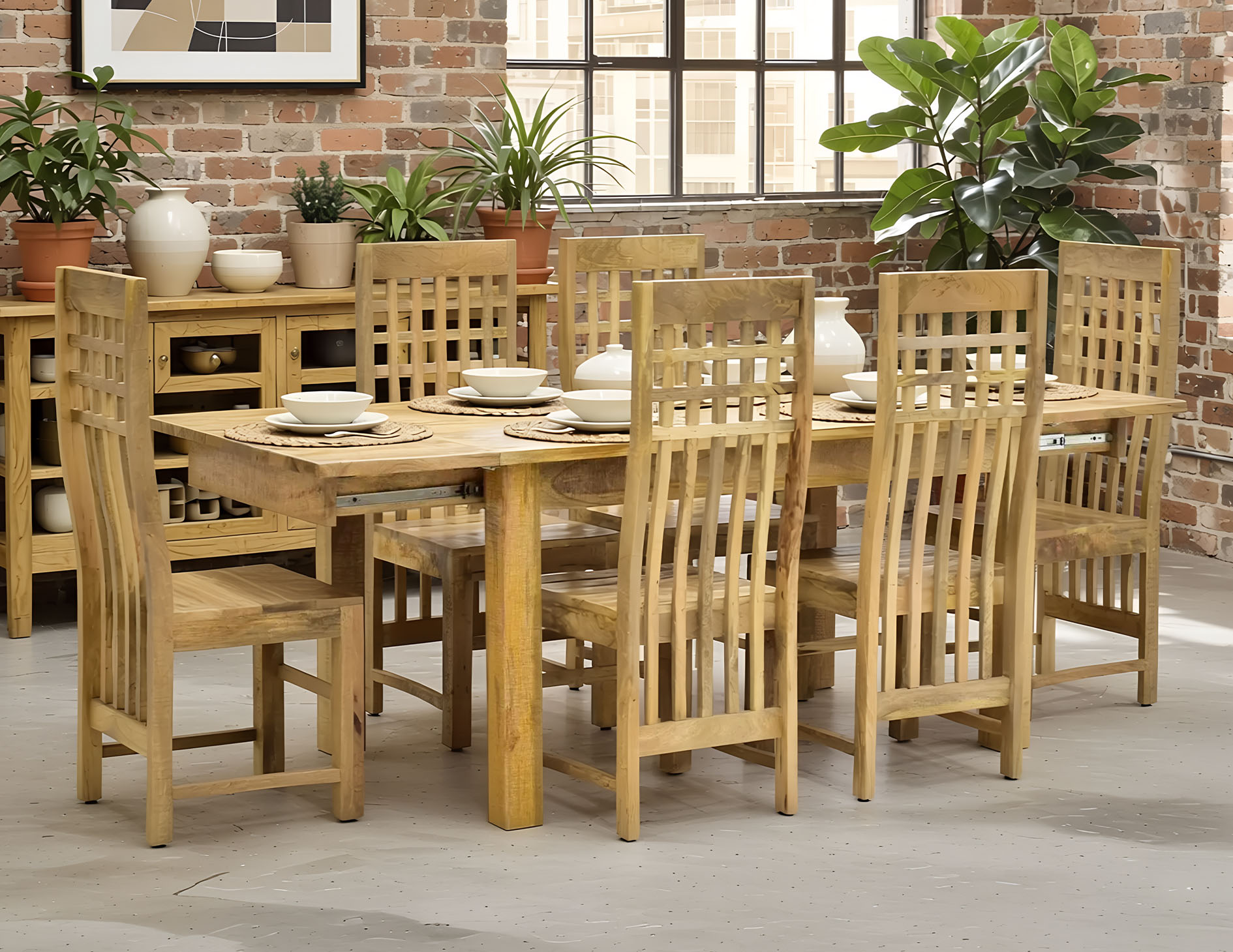 Komplet obiadowy, który składa się z rozkładanego stołu oraz sześciu krzeseł. Cały komplet jest wykonany z litego drewna mango w naturalnym odcieniu. Stół rozkłada się dwiema dostawkami z długości 145 cm do 225 cm. Wymiar krzesła: 45/45/110 cm.