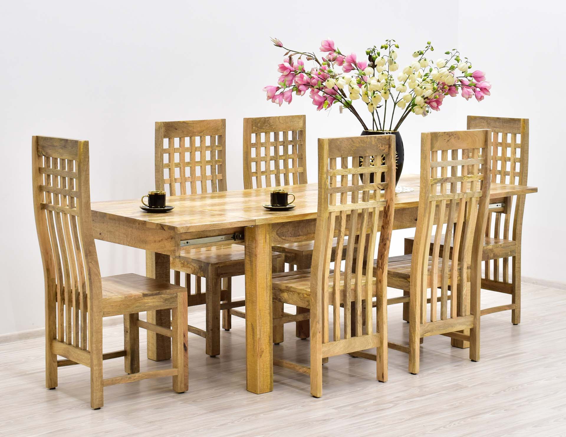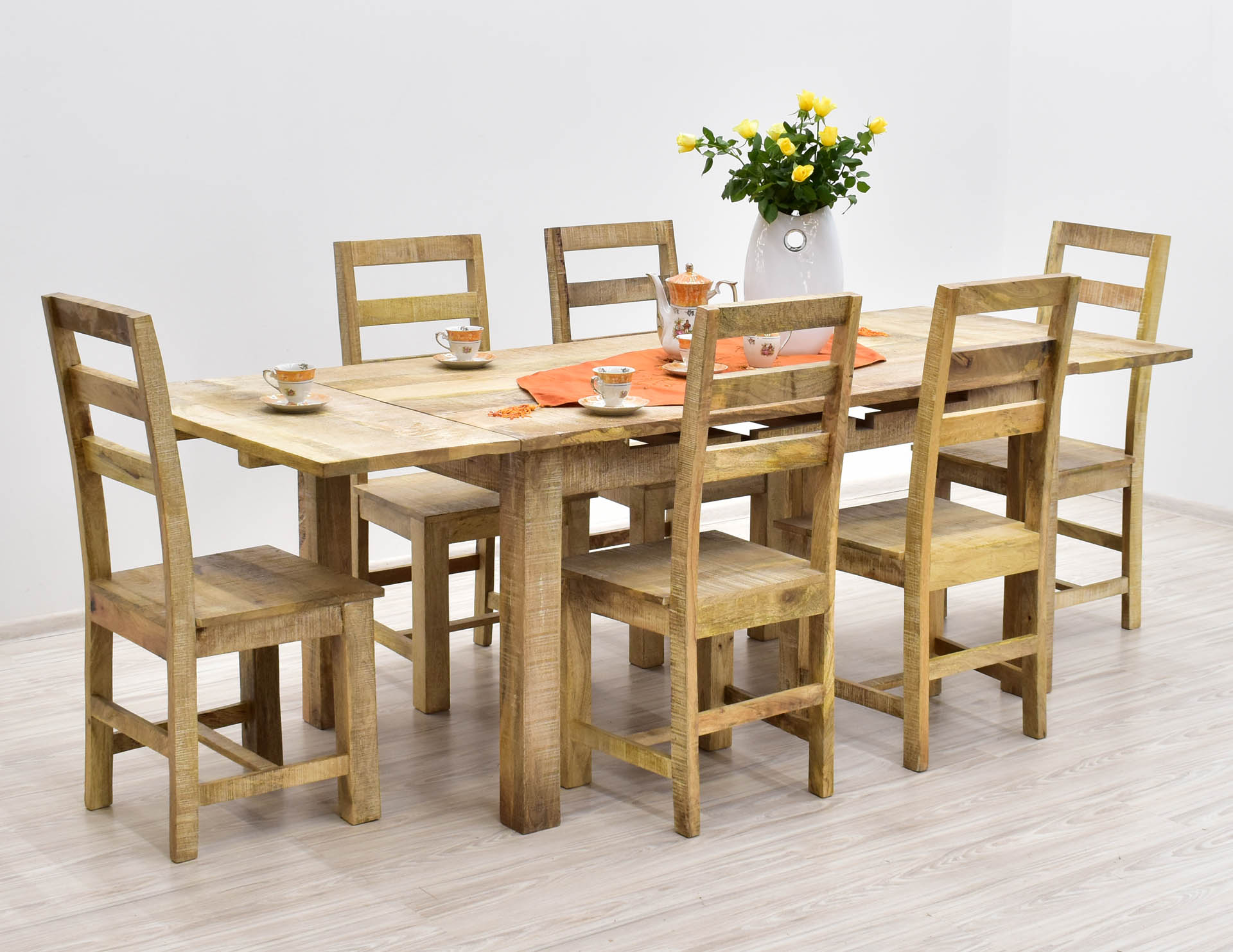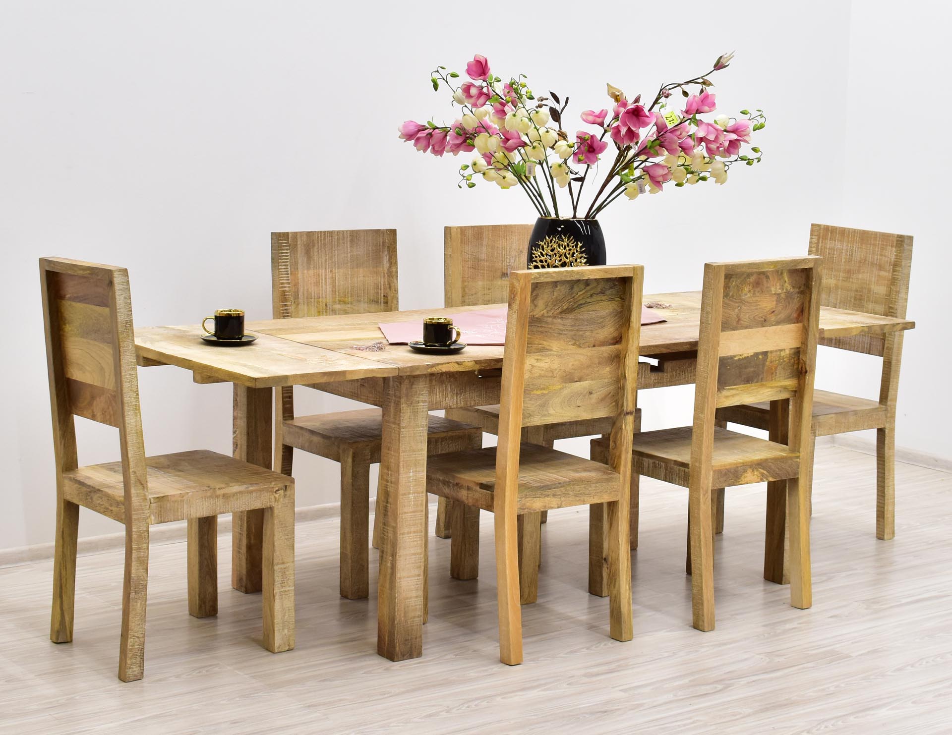 Komplet obiadowy, który składa się z rozkładanego stołu oraz sześciu krzeseł. Cały komplet jest wykonany z litego drewna mango w naturalnym odcieniu. Stół rozkłada się dwiema dostawkami z długości 160 cm do 240 cm. Wymiar krzesła: 45/45/110 cm.