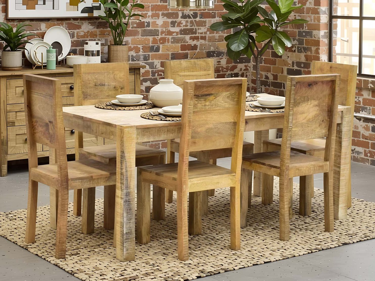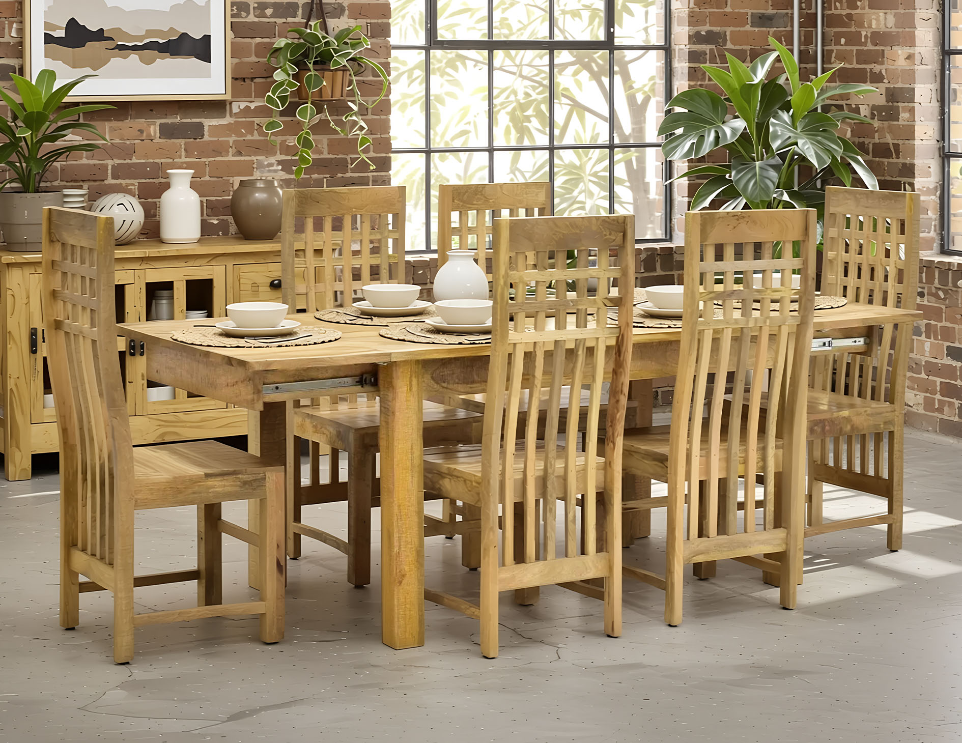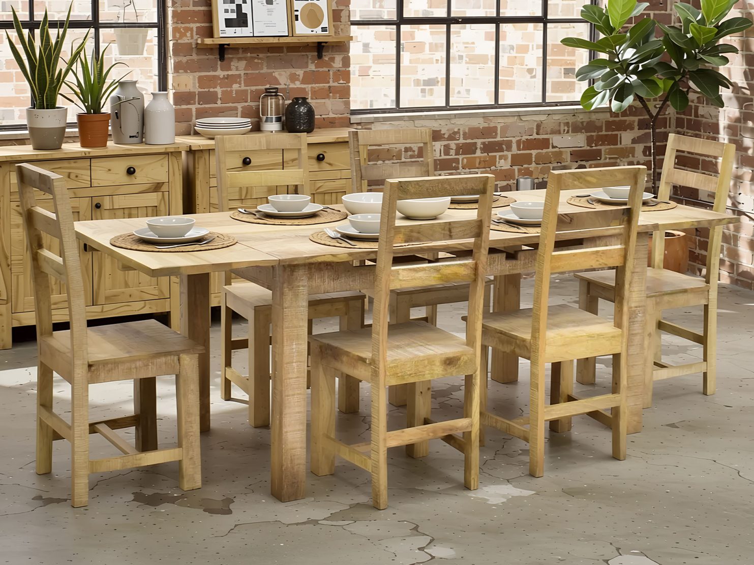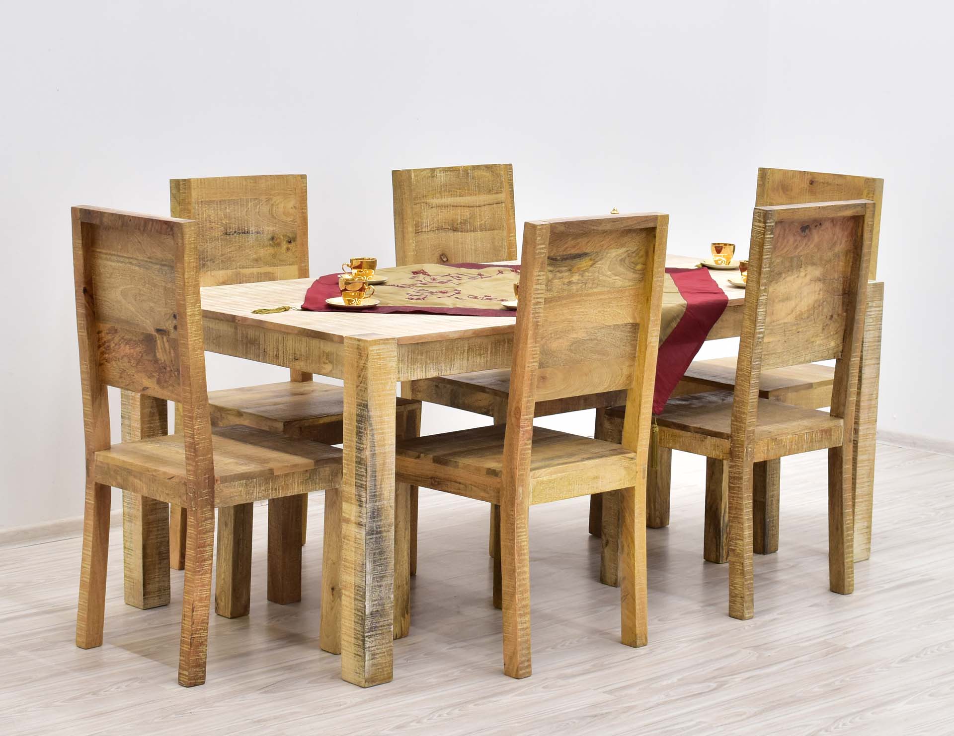 Komplet obiadowy, który składa się z rozkładanego stołu oraz sześciu krzeseł. Cały komplet jest wykonany z litego drewna mango w naturalnym odcieniu. Stół rozkłada się dwiema dostawkami z długości 160 cm do 240 cm. Wymiar krzesła: 45/45/110 cm.
