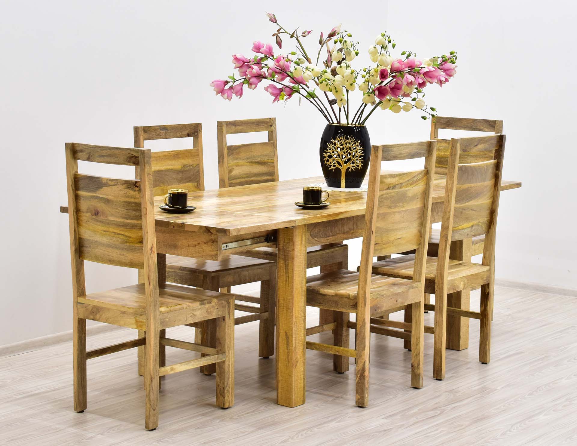Komplet obiadowy, który składa się z rozkładanego stołu oraz sześciu krzeseł. Cały komplet jest wykonany z litego drewna mango w naturalnym odcieniu. Stół rozkłada się dwiema dostawkami z długości 160 cm do 240 cm. Wymiar krzesła: 45/45/105 cm.