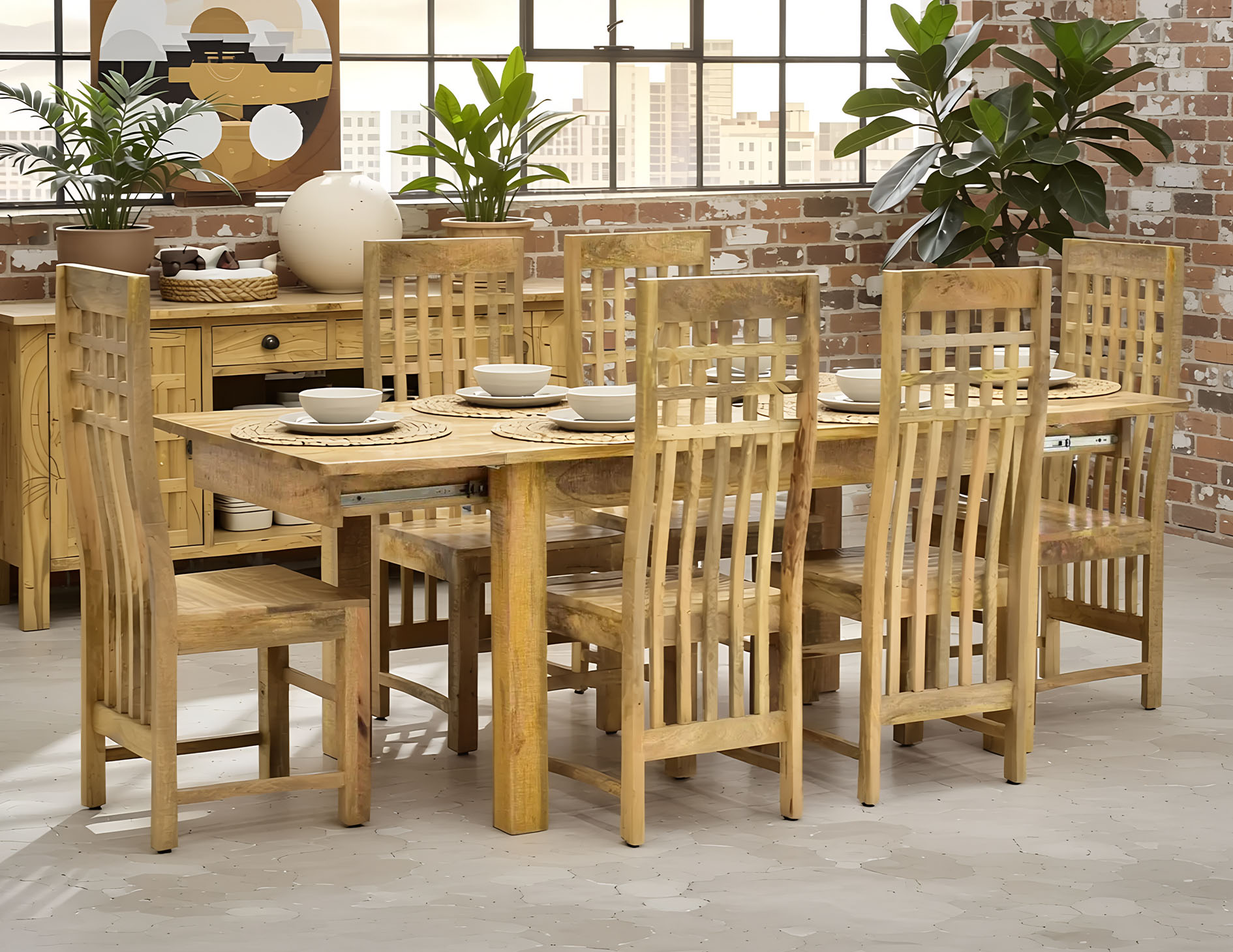 Komplet obiadowy, który składa się z rozkładanego stołu oraz sześciu krzeseł. Cały komplet jest wykonany z litego drewna mango w naturalnym odcieniu. Stół rozkłada się dwiema dostawkami z długości 175 cm do 255 cm. Wymiar krzesła: 45/45/110 cm.