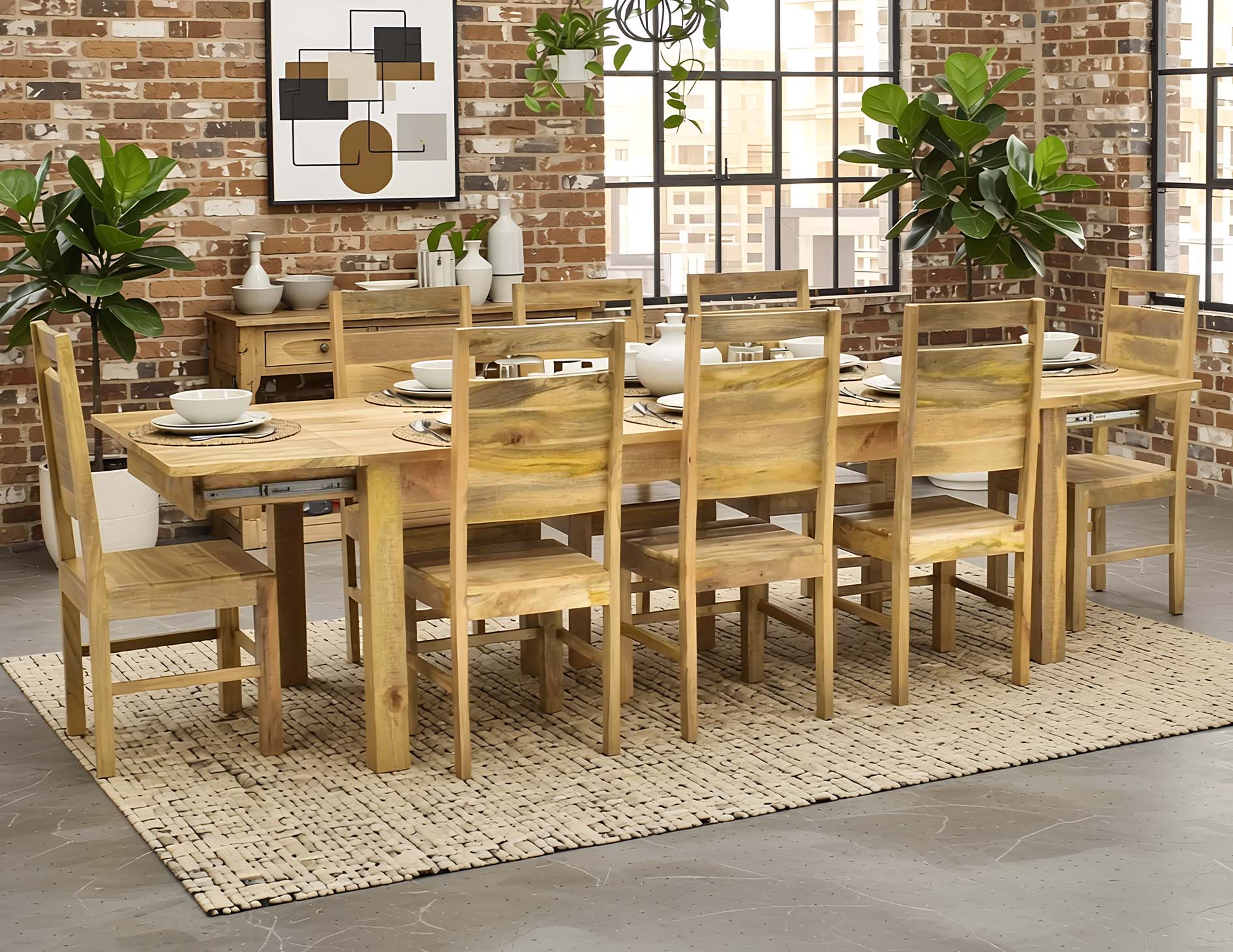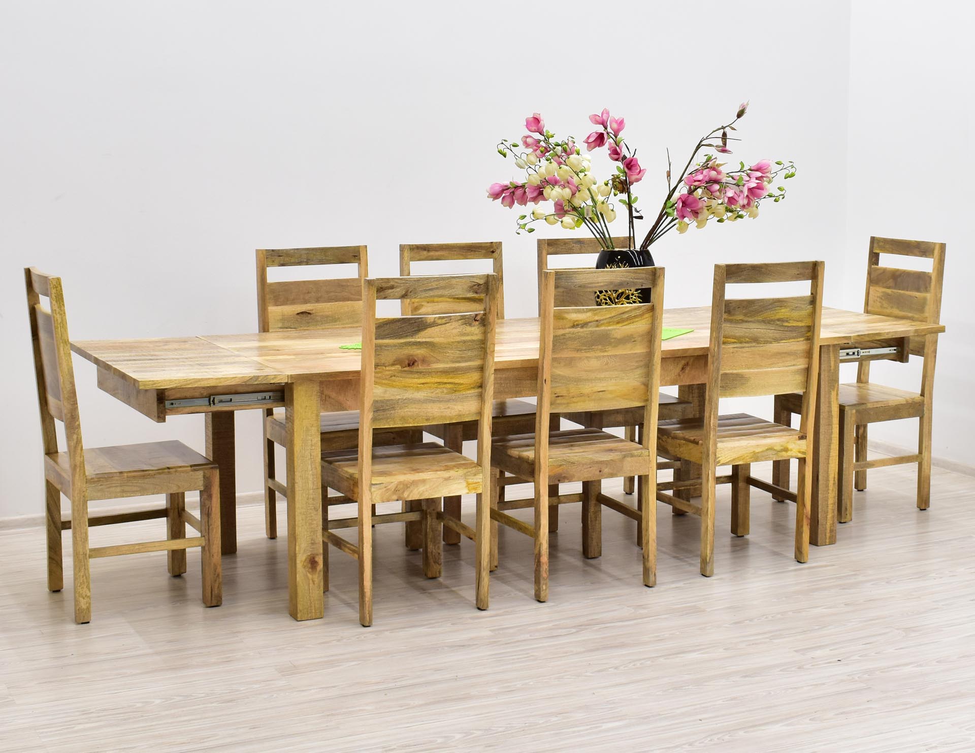 Komplet obiadowy, który składa się z rozkładanego stołu oraz 8 krzeseł. Cały komplet jest wykonany z litego drewna mango w naturalnym odcieniu. Stół rozkłada się dwiema dostawkami z długości 210 cm do 290 cm. Wymiar krzesła: 45/45/105 cm.