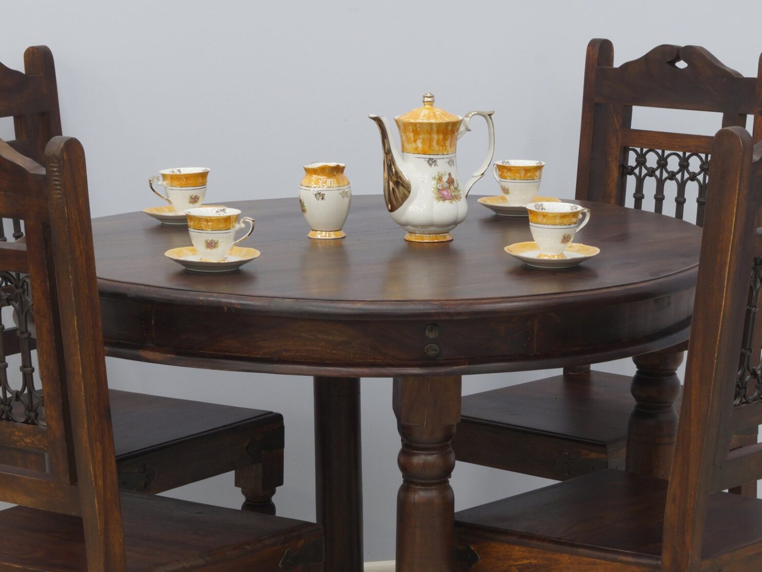 Okrągły stół wraz z czterema krzesłami. Komplet został wykonany w 100% z litego drewna palisandru indyjskiego, a krzesła dodatkowo posiadają oparcia zdobione motywem z metaloplastyki. Stół posiada toczone nogi, ma średnicę 110cm a wysokość 80cm. Wymiary krzesła to 45/45/105 cm. Całość wybarwiona na ciemny brąz. Jest to bardzo stylowy komplet dla czterech osób. Idealnie wpasuje się w mały aneks jadalny w stylu kolonialnym lub orientalnym.